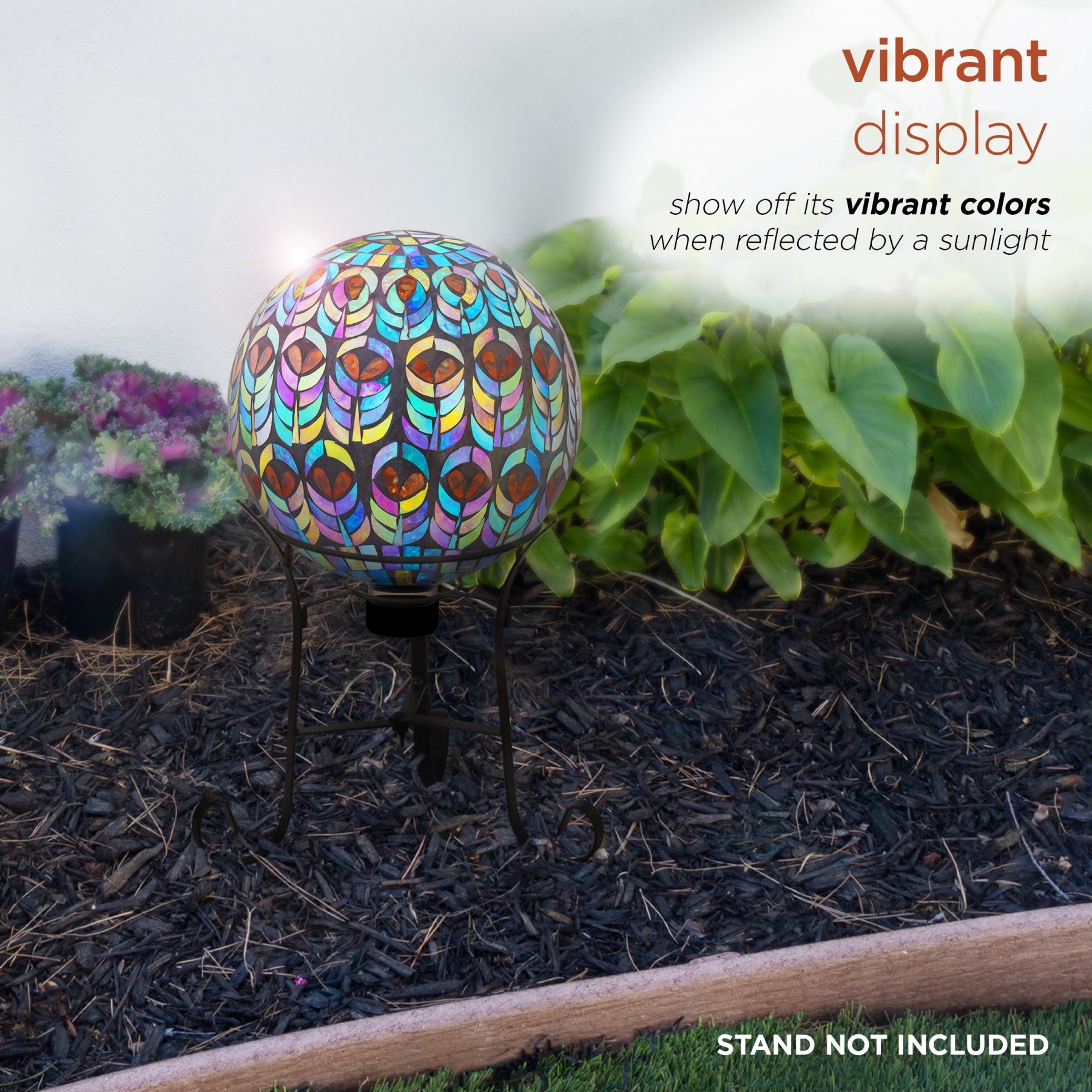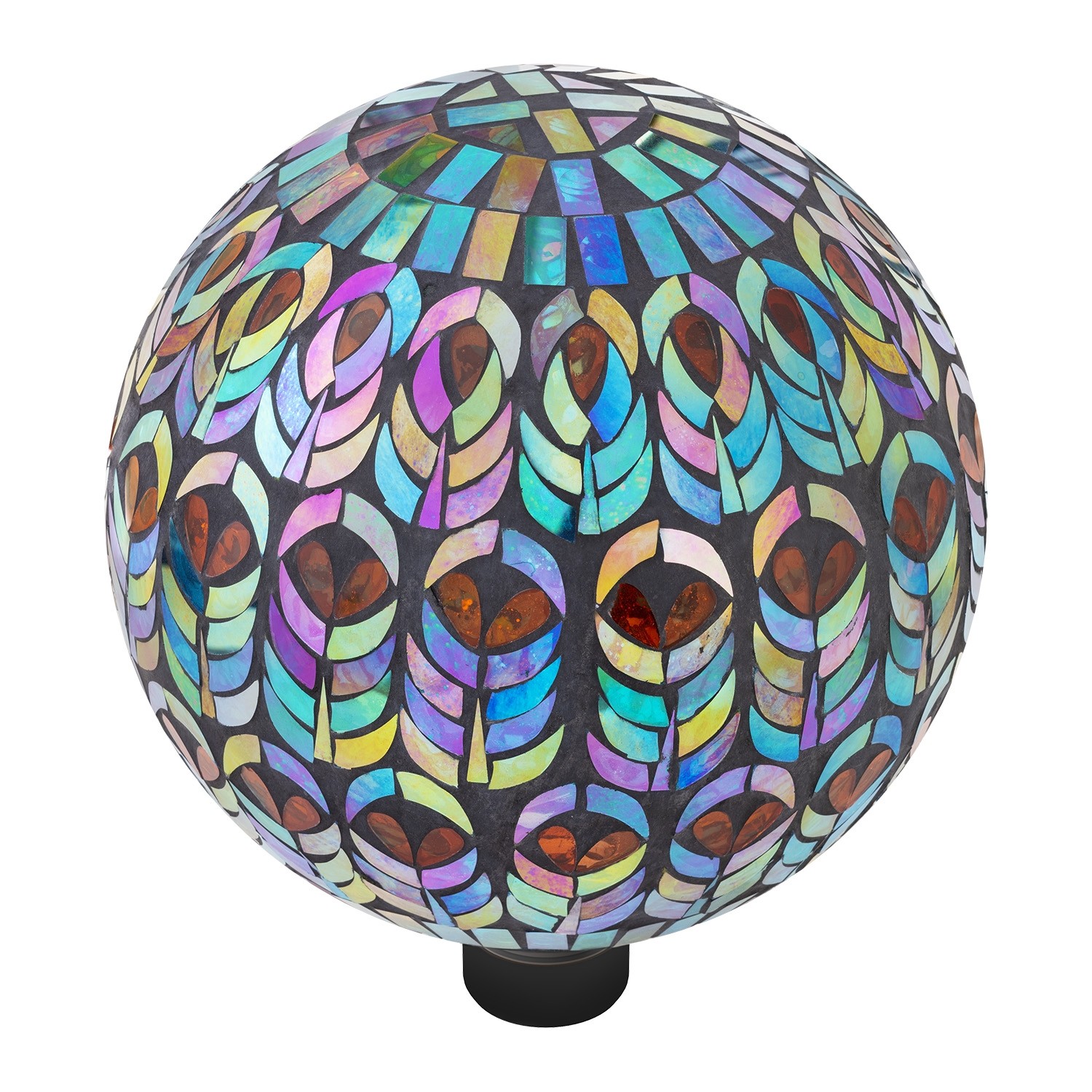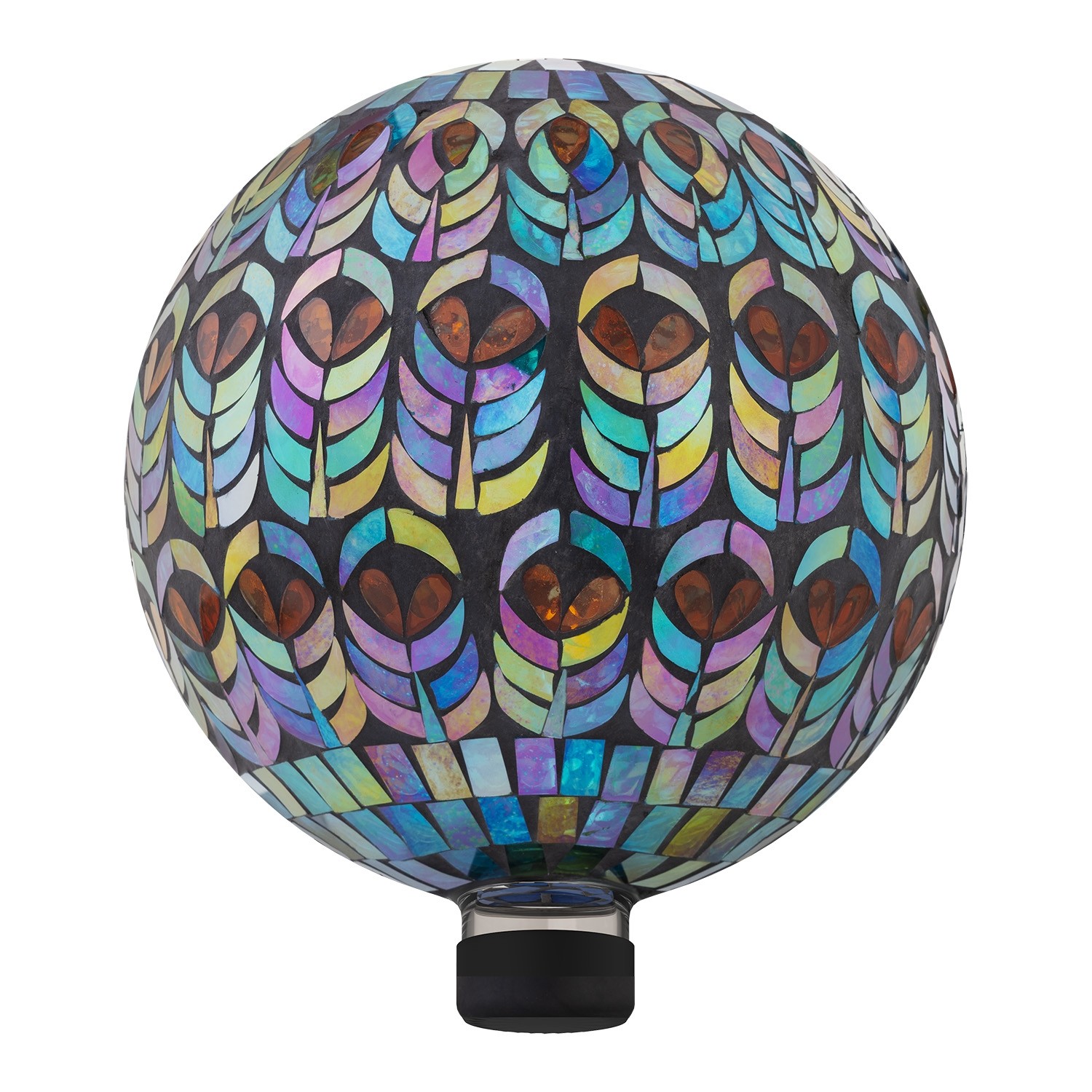 Decorative mosaic gazing globe that features an intricate peacock design made out of glass. The vivid bright colors accent any empty space of your home or garden.