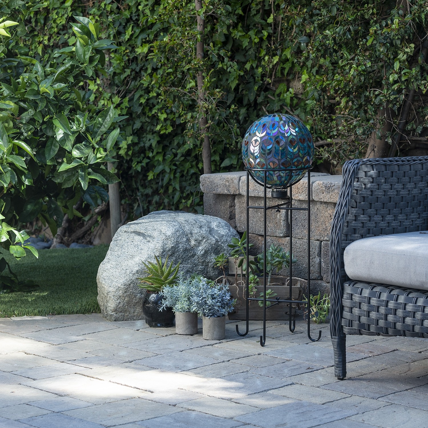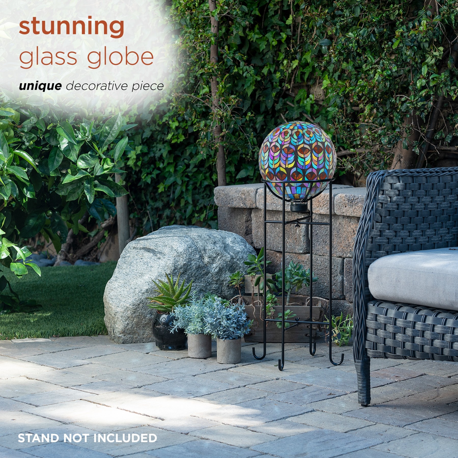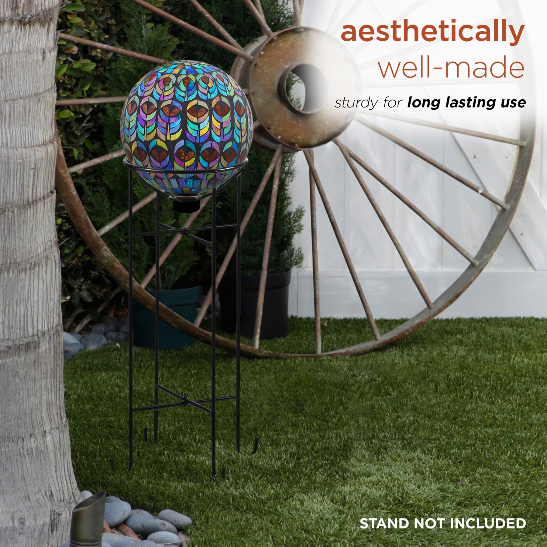 Decorative mosaic gazing globe that features an intricate peacock design made out of glass. The vivid bright colors accent any empty space of your home or garden.