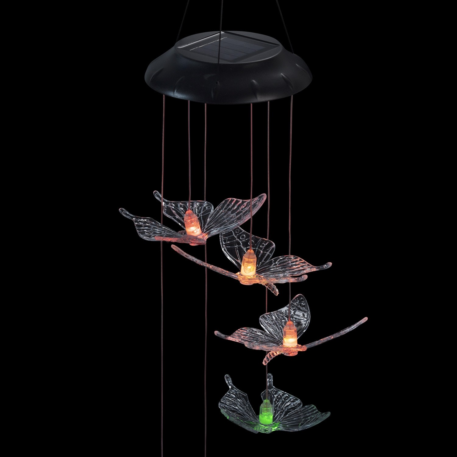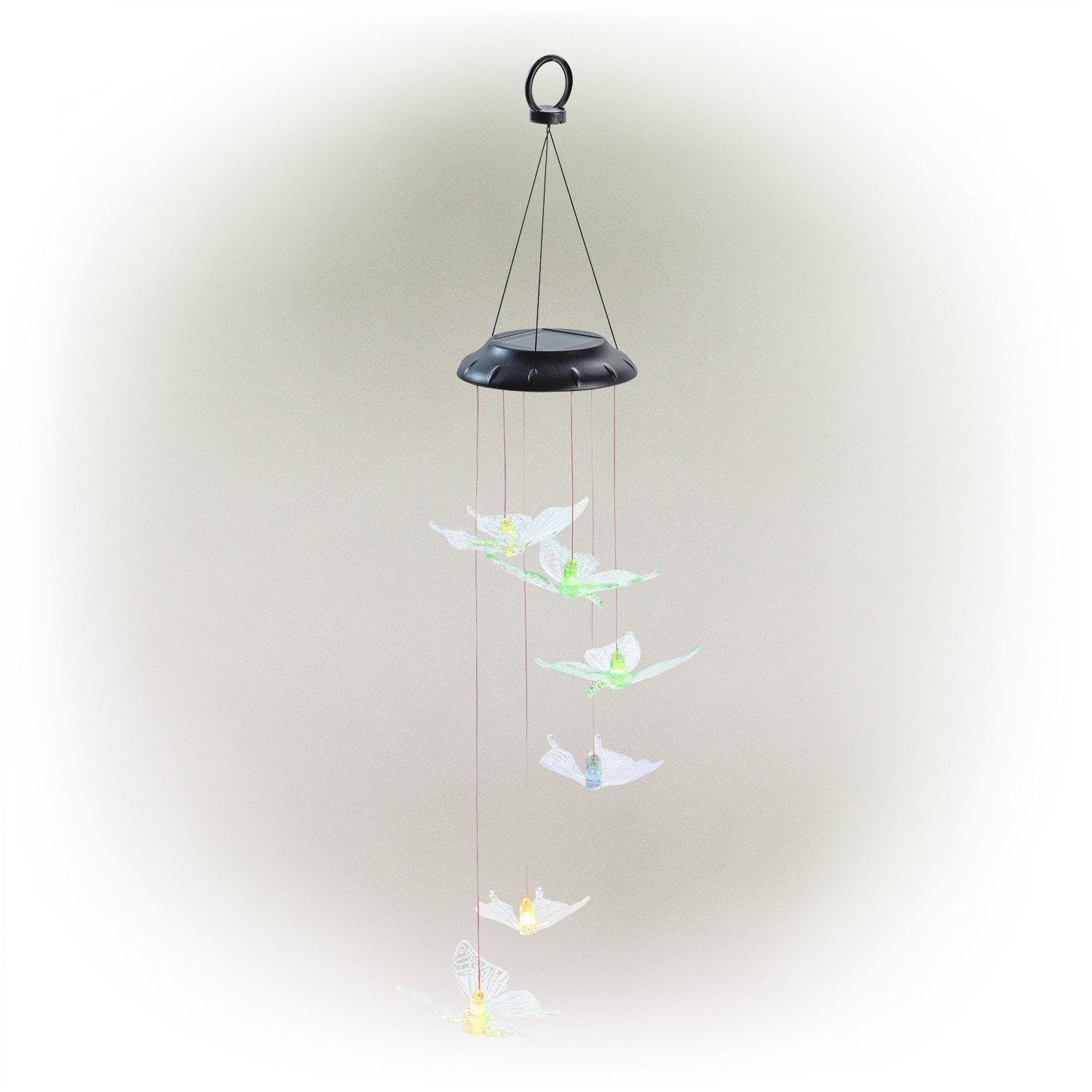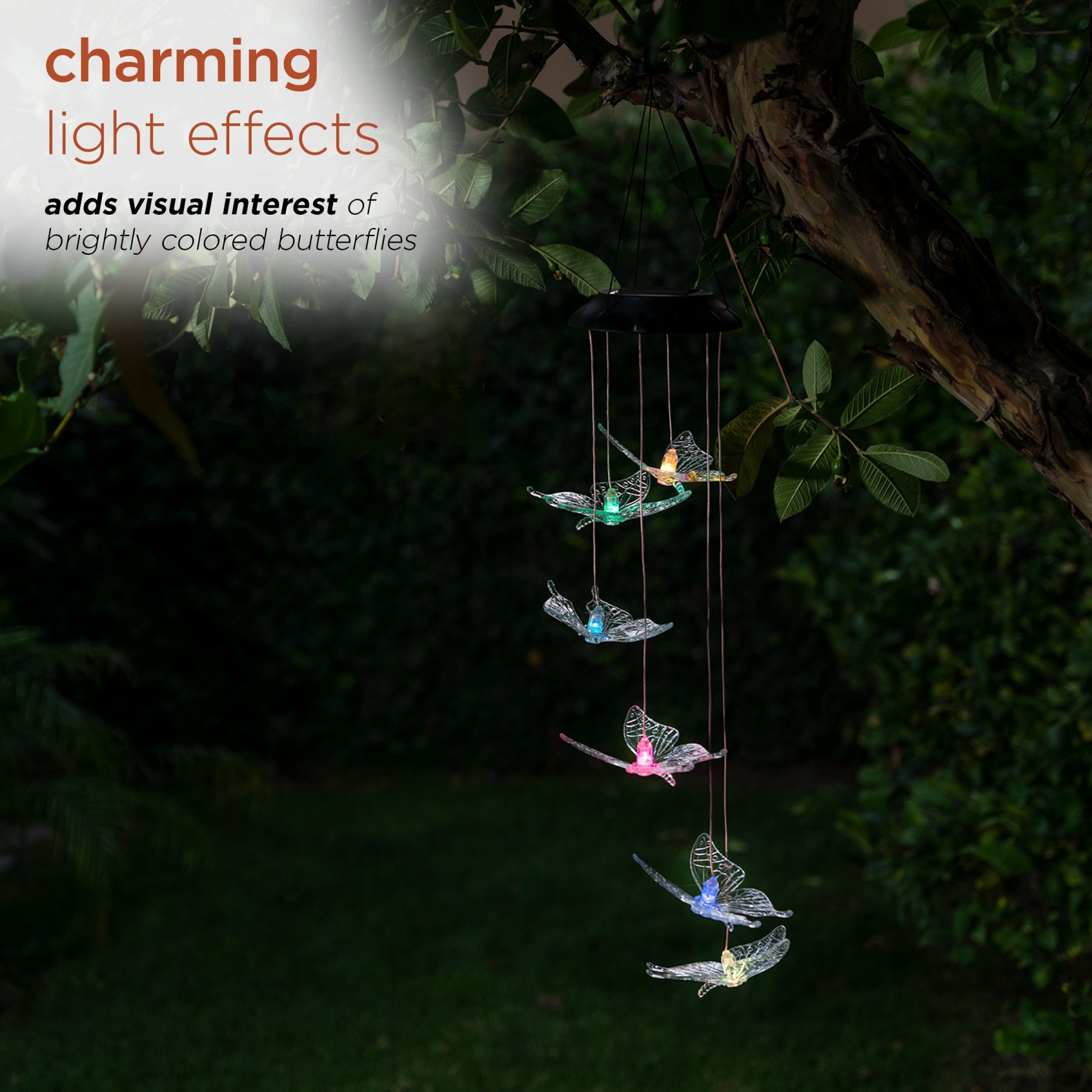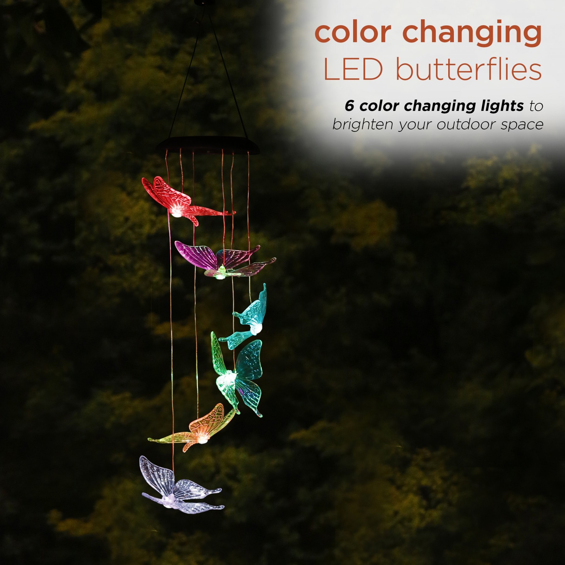 Illuminate your entryway with this adorable butterfly windchime. This would be the perfect touch to complete your patio. Automatically changes colors from green, red, blue and purple and yellow. This chime illuminates for up to 8 hours when fully charged.