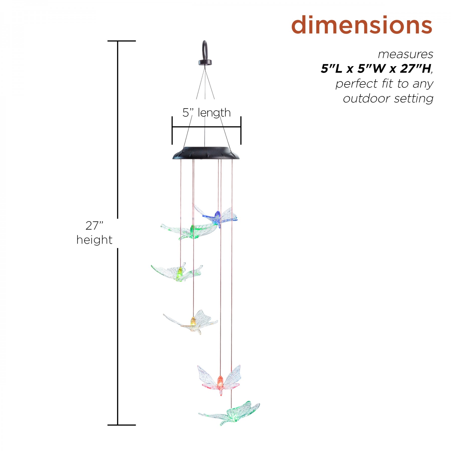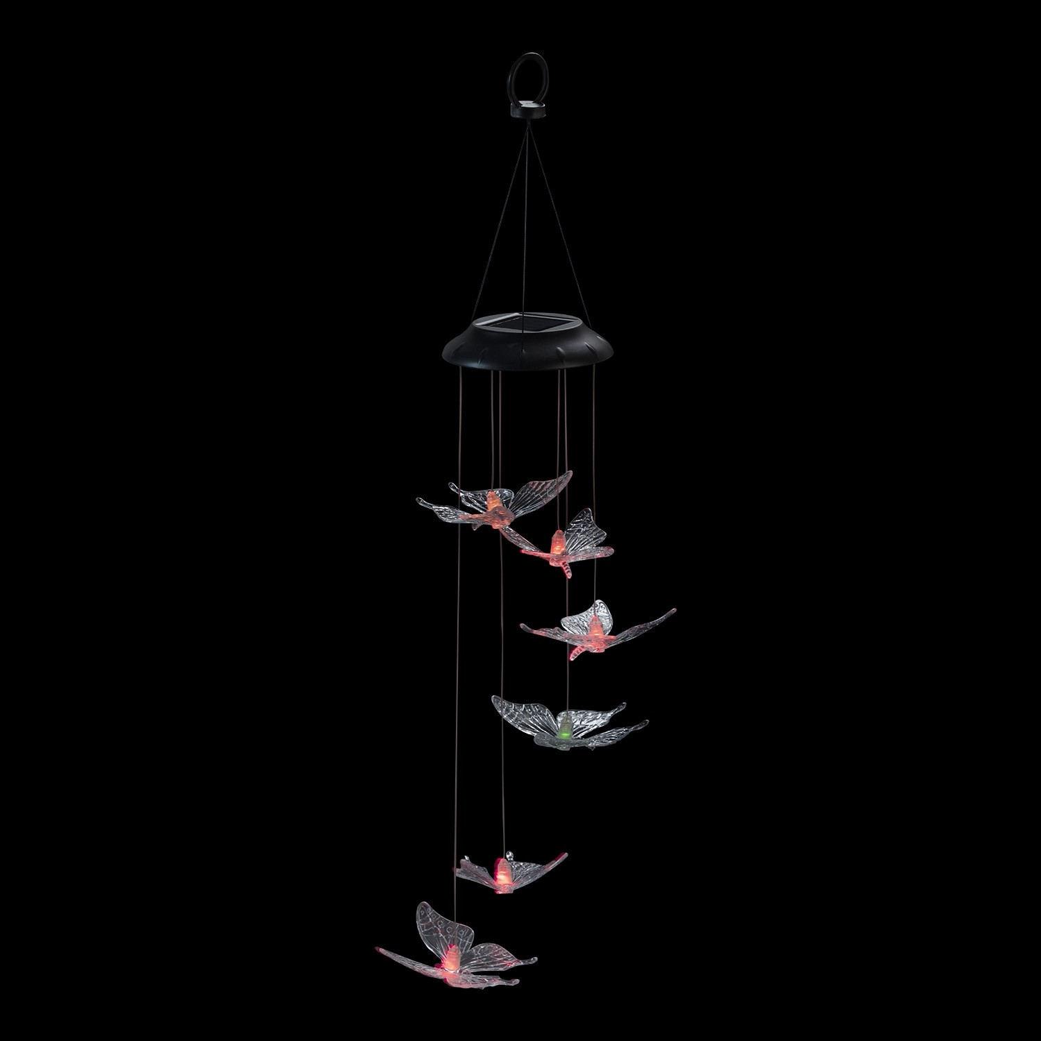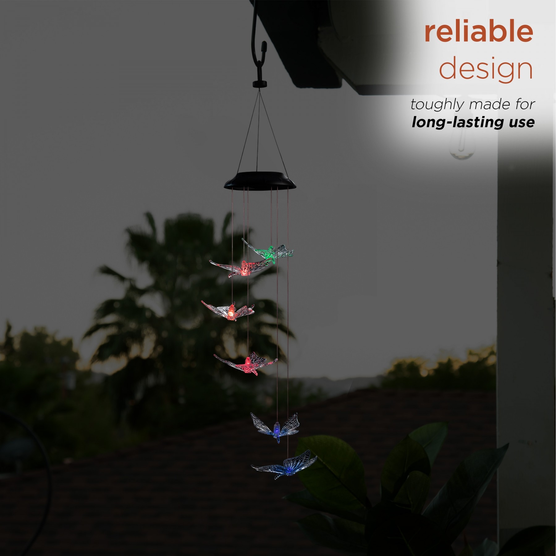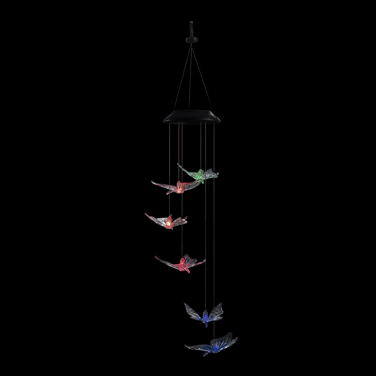 Illuminate your entryway with this adorable butterfly windchime. This would be the perfect touch to complete your patio. Automatically changes colors from green, red, blue and purple and yellow. This chime illuminates for up to 8 hours when fully charged.