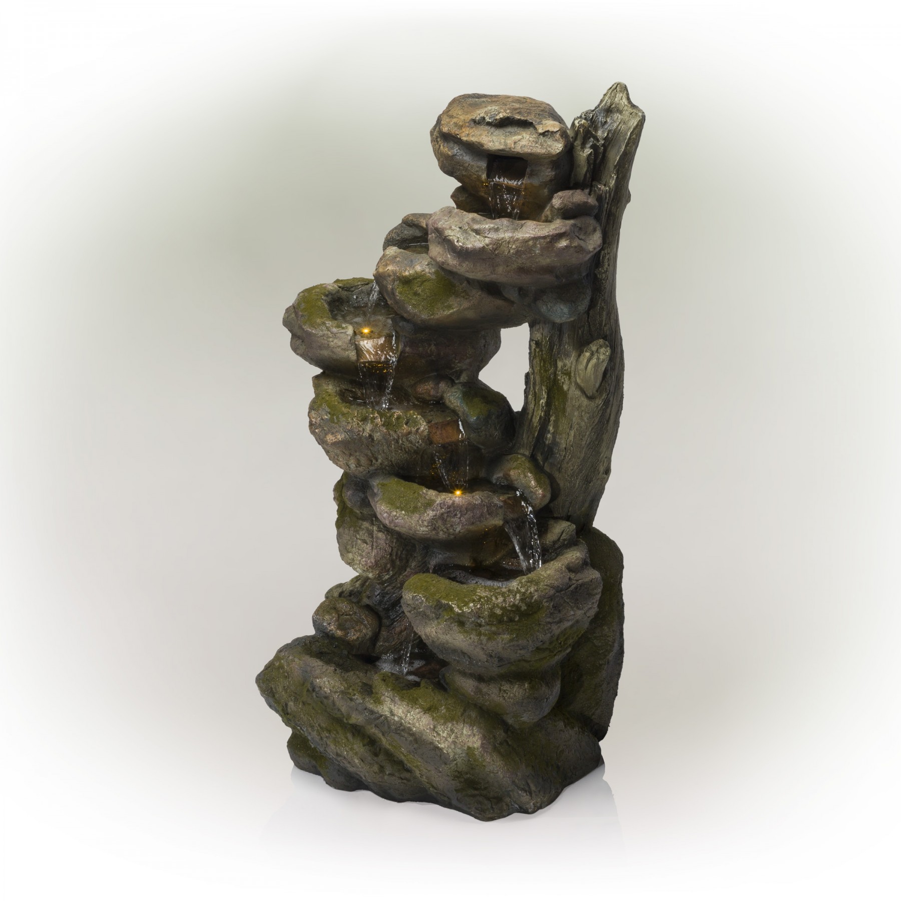 Unplug from the day and meditate to the sound of flowing water with Alpine’s 39" tall Indoor/Outdoor Multi-Tier Waterfall Rock Fountain with LED lights. This relaxing floor fountain statue provides a tranquil and soothing addition to your yard, porch, patio or interior spaces. Constructed from durable polystone and fiberglass, the fountain is weatherproof, rust-resistant, and resilient for use in your home's interior décor or outside. This unique and versatile decor piece includes LED lights for a tranquil and soothing addition to your home’s backyard or indoor decor. Replicating a rainforest scene, the fountain has a natural appearance and realistic stone textures. Relax to the sounds of the calming natural water flow as it trickles down through the rocks. For quick installation and convenient operating, the fountain includes all necessary parts, including a pump, to begin creating an soothing oasis. This fountain measures 21"L x 18"W x 39"H to fit almost any indoor or outdoor table space and includes a one-year manufacturer's warranty from date of purchase.