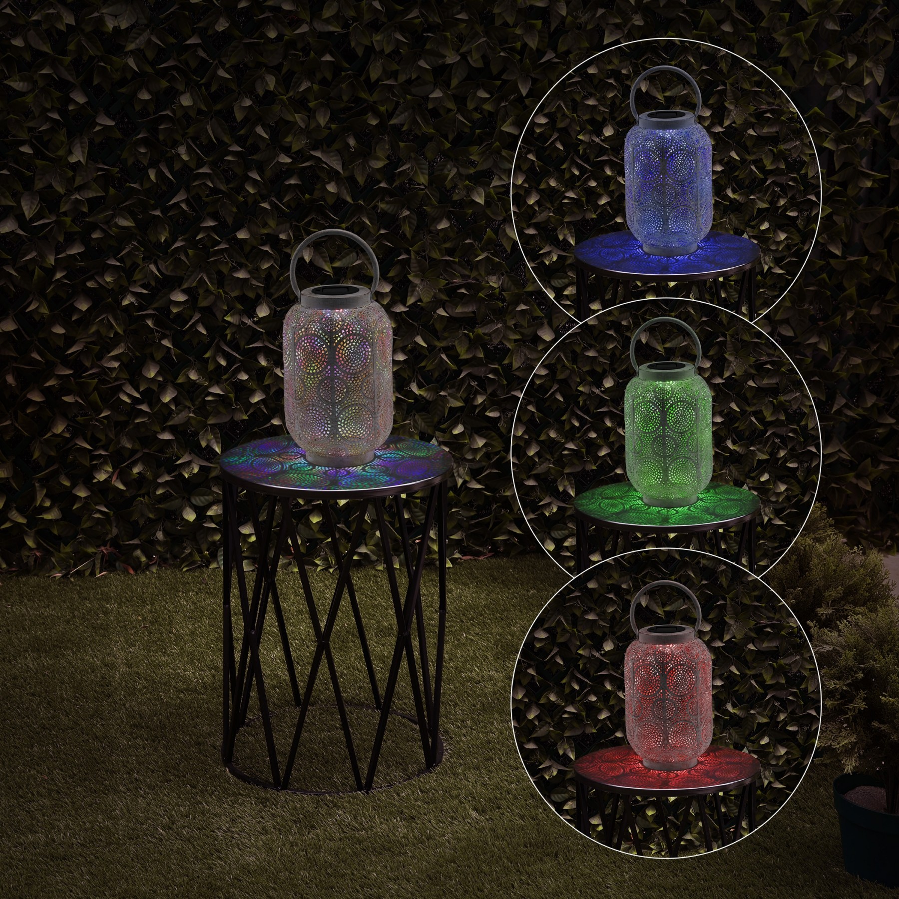 Illuminate your outdoor space with the Alpine Corporation Outdoor Solar-Powered Vintage Metal Lantern with Hollowed-Out Design and Rotating Multi-Colored LED Lights. This Moroccan-style lantern is designed with intricate cutout details in an antique white finish to light up your patio or backyard. The multi-colored LED lights rotate between blue, red, and green and the solar-powered design provides illumination for up to 6-8 hours. Whether you hang it overhead, place it on a tabletop, or display it on the floor, this versatile lantern adds color and style to any space. Use on its own or pair with multiple lanterns to create a stunning garden display. The durable metal construction provides long-lasting use year after year and includes an on/off switch. Measuring 7"L x 7"W x 12"H and 16"H while hanging, this antique-style lantern makes a statement in your outdoor space. It also includes a one year manufacturer's warranty from date of purchase.