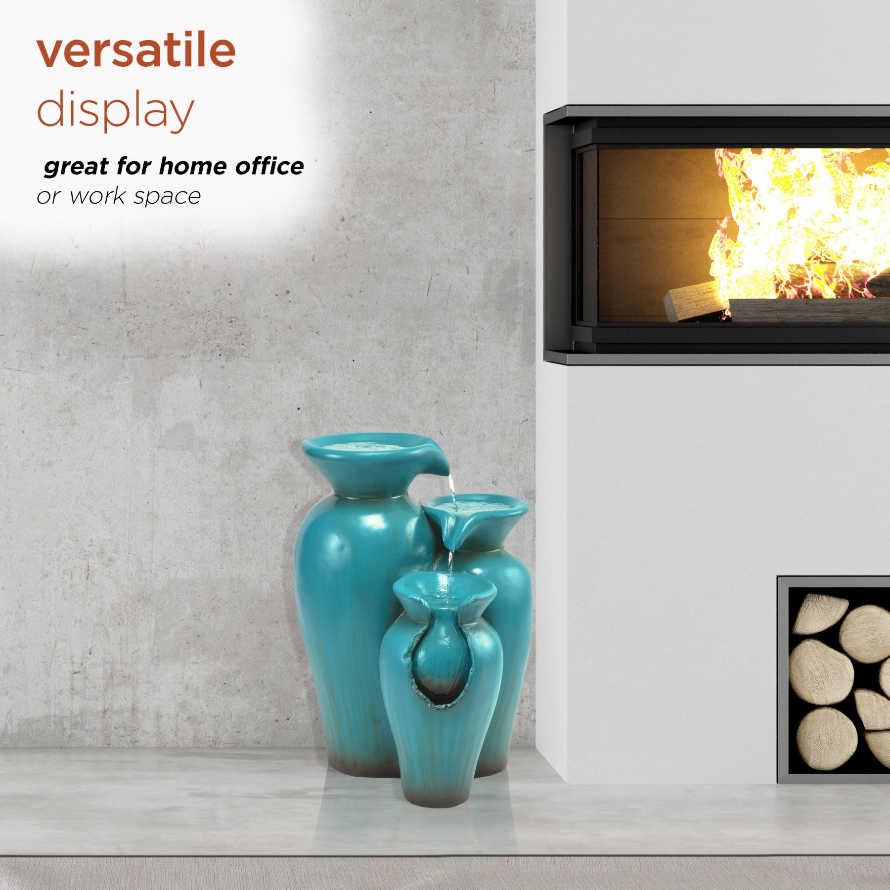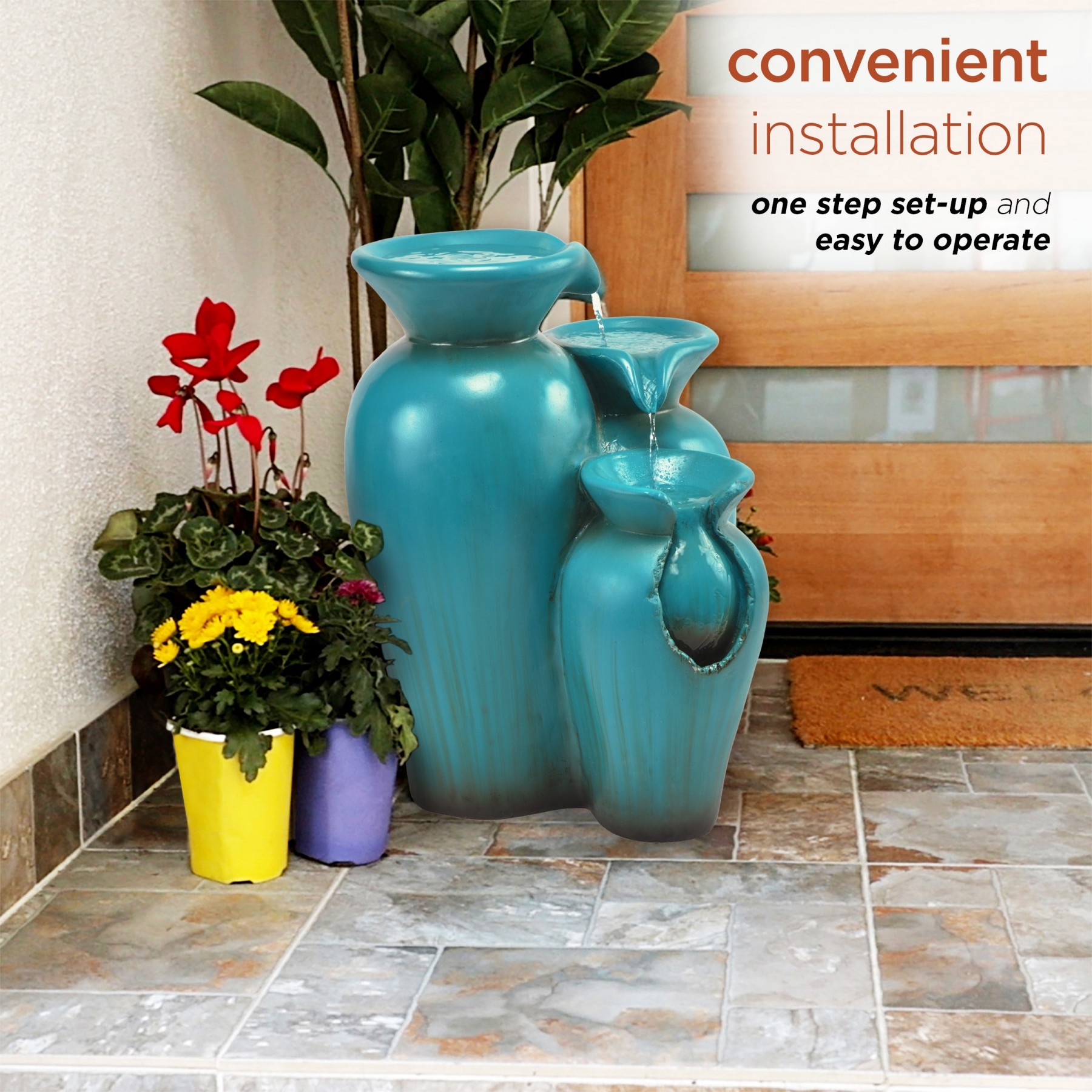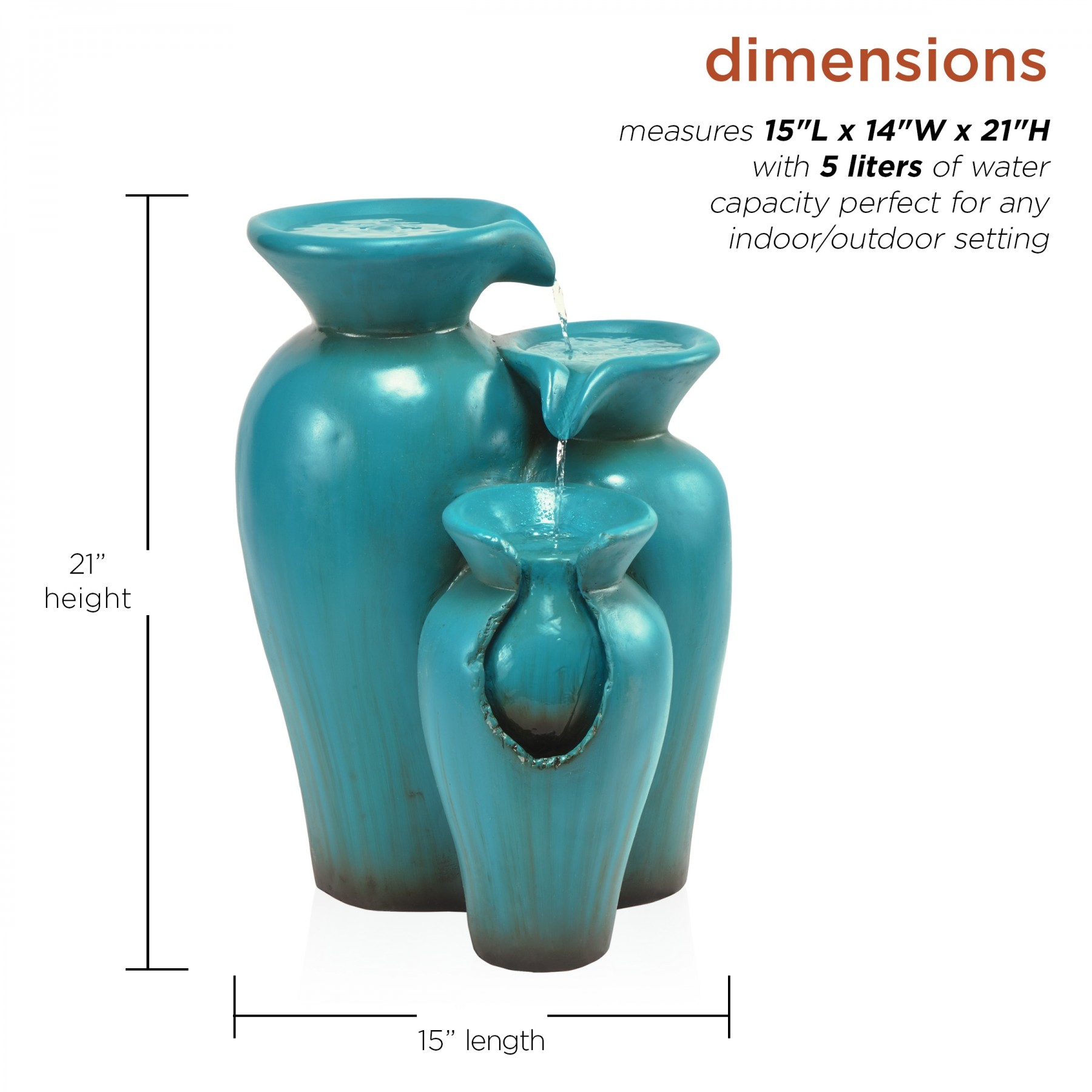 Elevate your home’s outdoor appearance with this elegant 21" tall Turquoise Fountain Pot Decoration from Alpine Corporation. This fountain statue provides a tranquil and soothing addition to your porch, backyard, or sunroom. Constructed from durable cement, fiberglass, and sand with a classic look, the fountain is weatherproof and resilient. This statue will bring a touch of modern charm to your outdoor space. Relax to the sounds of the soft, natural water flow as it trickles down through the buckets. Not only will the fountain provide you with serenity, it will also add a breathtaking display of beauty and antiquity to your outdoor area. This majestic fountain provides an elegant addition to your courtyard, and gives your garden visual interest with its timeless design and classic style. For quick installation and convenient operating, the water fountain includes all necessary parts and a pump to begin creating an outdoor oasis. This decorative water fountain measures 15"L x 14"W x 21"H to fit almost any outdoor space and includes a one-year manufacturer's warranty from date of purchase.