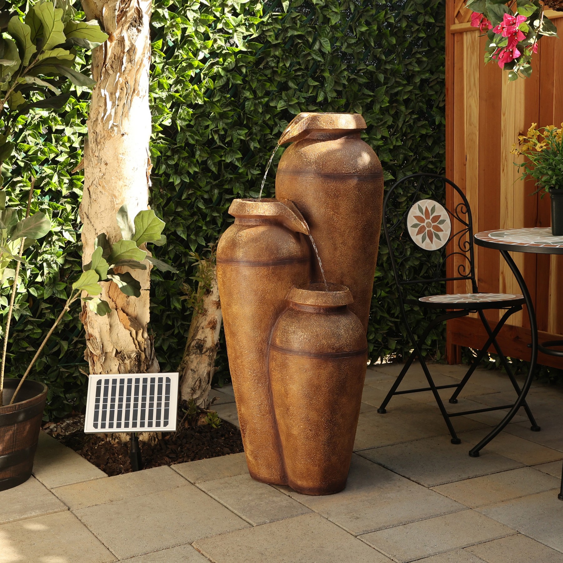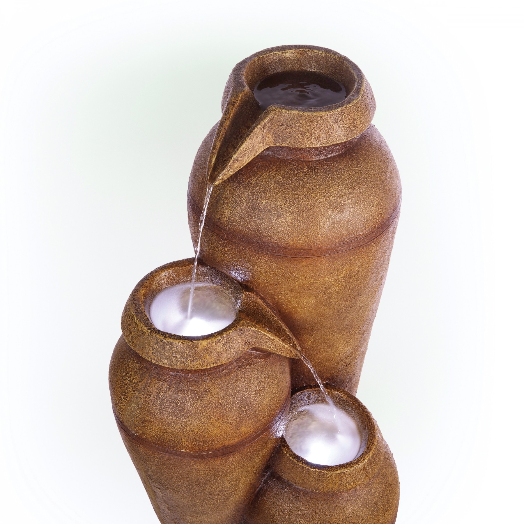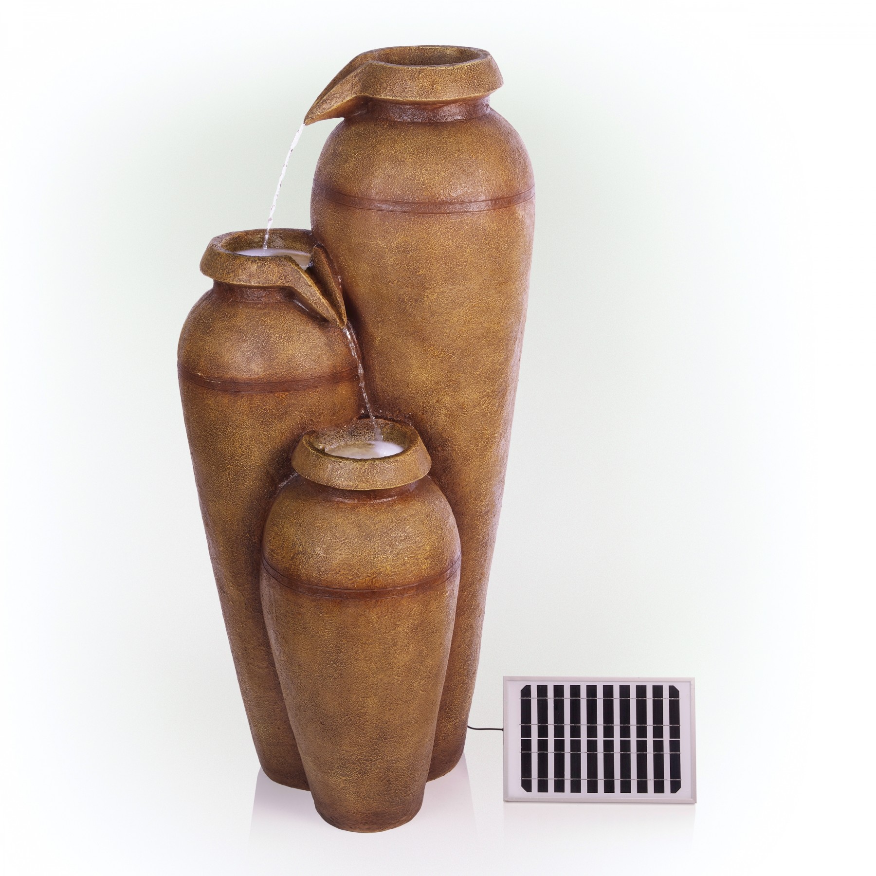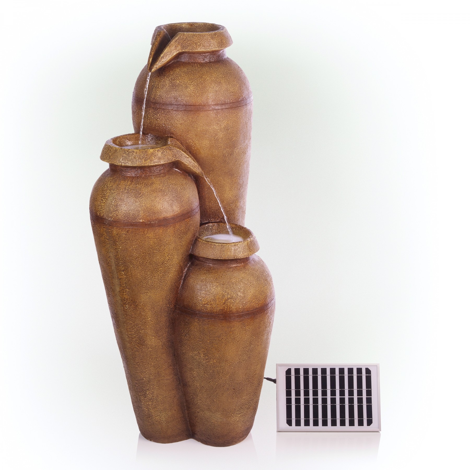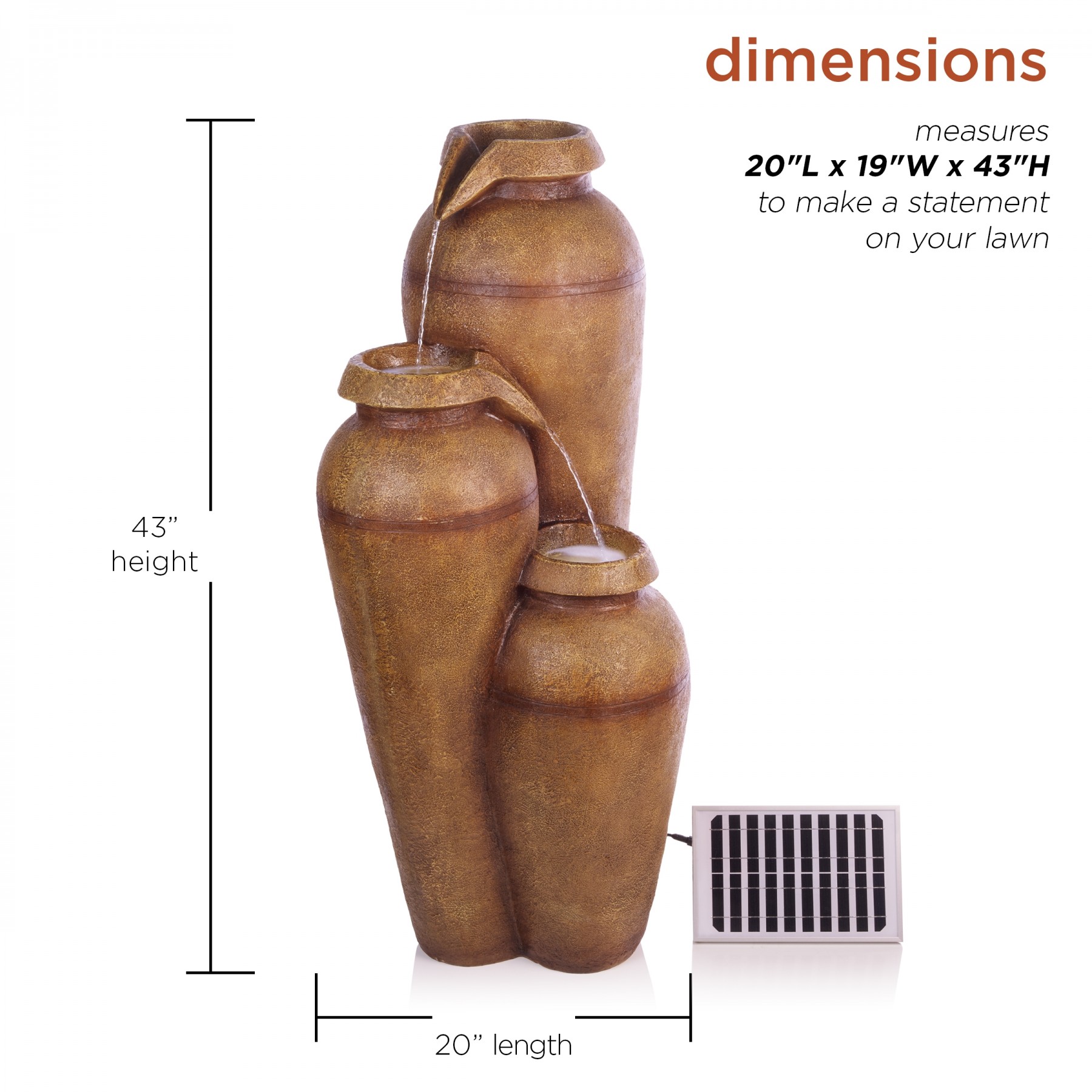 Elevate your home’s indoor or outdoor appearance with this elegant 43"H Solar 3-Tier Cascading Vase Fountain Yard Decoration with LED Lights. This cascading fountain statue provides a tranquil and soothing addition to your porch, backyard, or sunroom. Constructed from durable polyresin, stone powder, and fiberglass with a classical and antique look, the fountain is weatherproof, rust-resistant, and resilient. This statue will bring a touch of charm to your outdoor space. The fountain becomes illuminated with the included solar-powered cool white LED lights, and is sure to light up your garden or patio. Relax to the sounds of the soft, natural water flow as it trickles down through the fountain. Not only will the fountain provide you with serenity, it will also add a breathtaking display of beauty to your outdoor area. This majestic fountain provides an elegant addition to your courtyard, and gives your garden visual interest with its timeless design and classic style. For quick installation and convenient operating, the water fountain includes all necessary parts and a pump to begin creating an outdoor oasis. This decorative water fountain measures 20"L x 19"W x 43"H to fit almost any outdoor space and includes a one-year manufacturer's warranty from date of purchase.