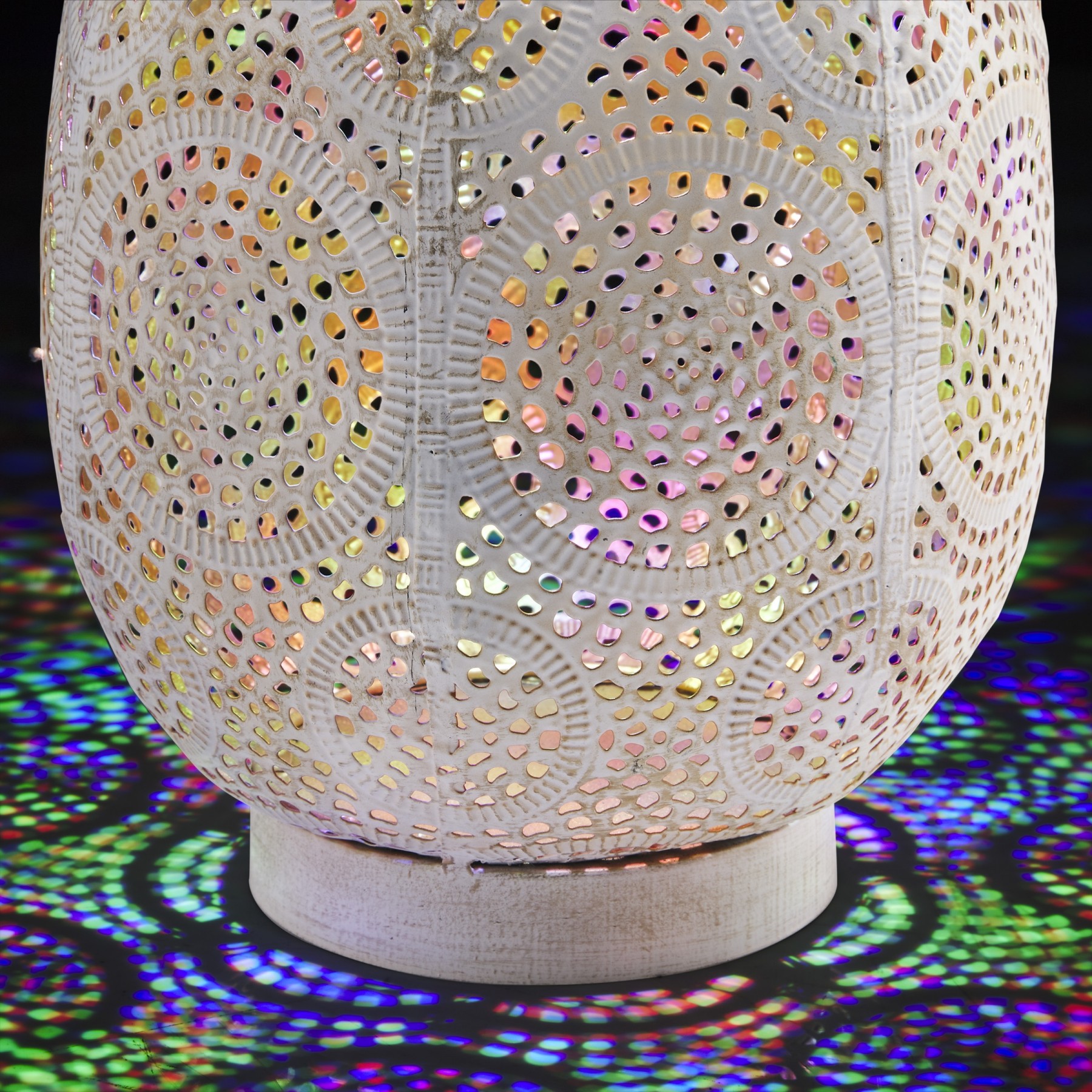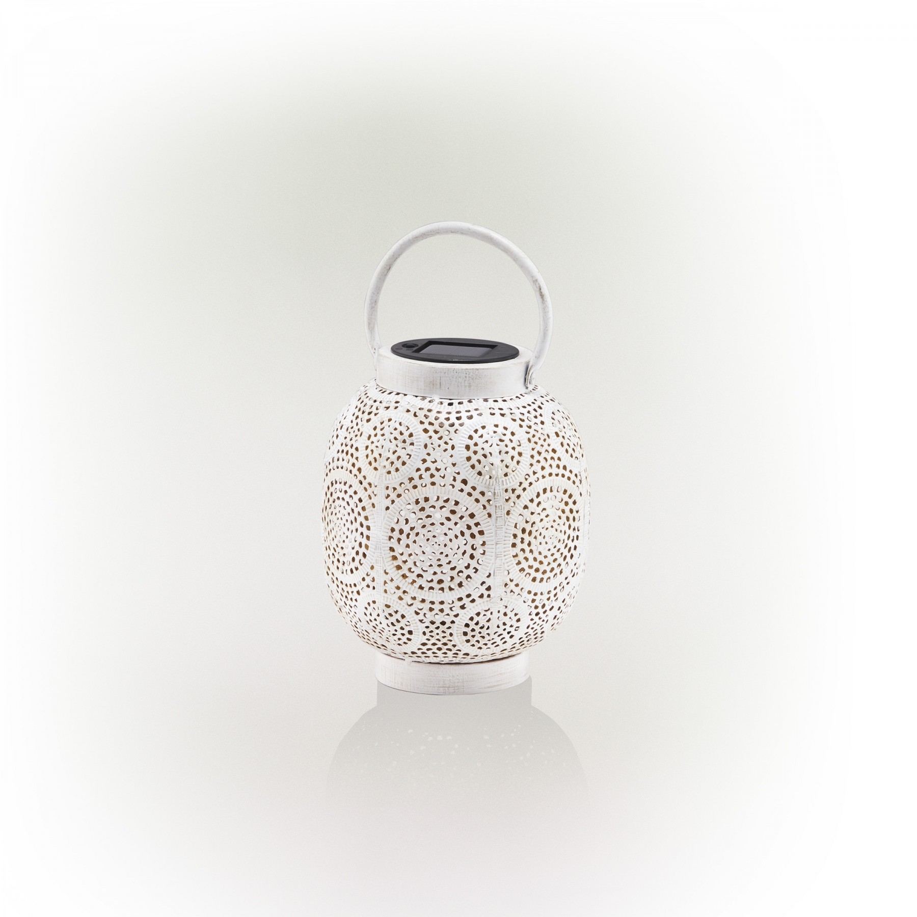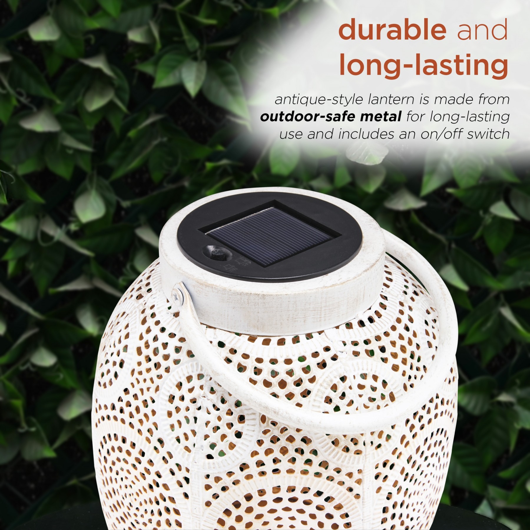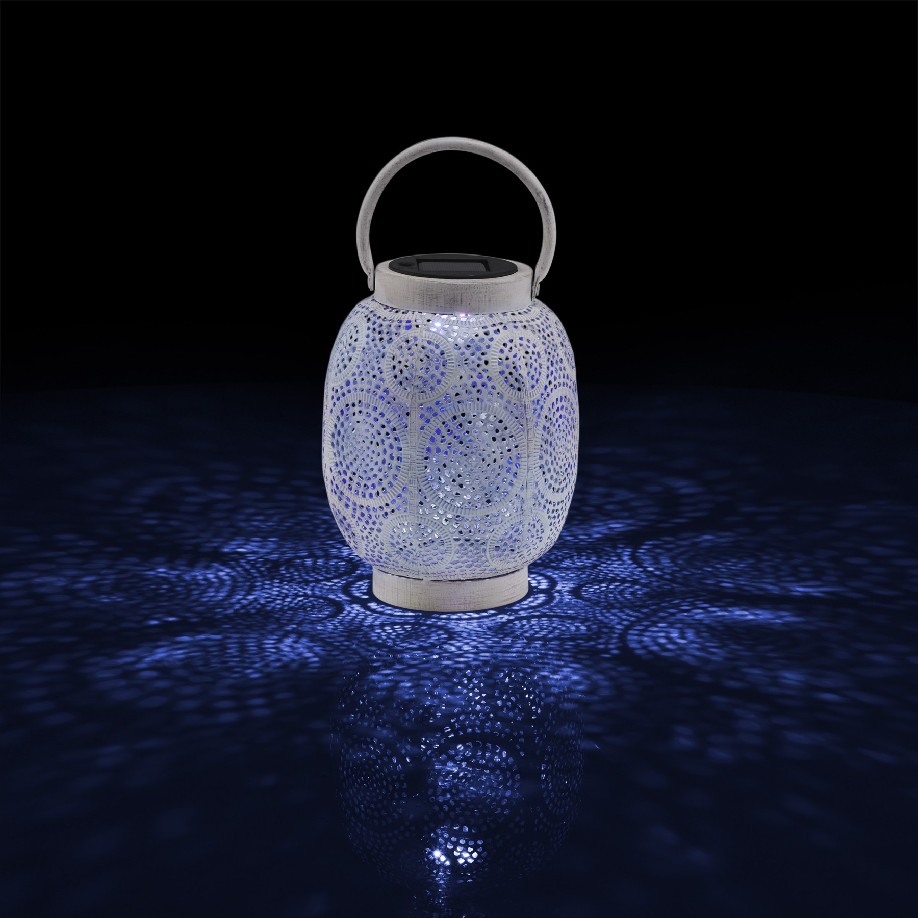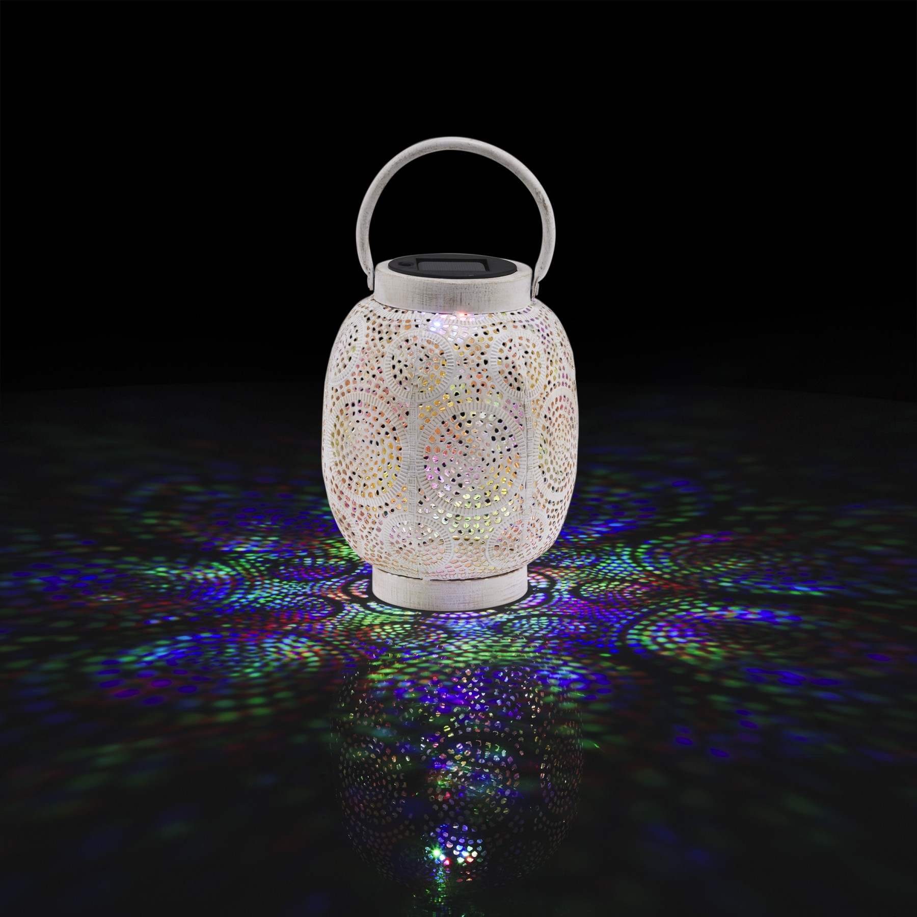 Illuminate your outdoor space with the Alpine Corporation Outdoor Solar-Powered Vintage Metal Lantern with Hollowed-Out Design and Rotating Multi-Colored LED Lights. This Moroccan-style lantern is designed with intricate cutout details in an antique white finish to light up your patio or backyard. The multi-colored LED lights rotate between blue, red, and green and the solar-powered design provides illumination throughout the night. Whether you hang it overhead, place it on a tabletop, or display it on the floor, this versatile lantern adds color and style to any space. Use on its own or pair with multiple lanterns to create a stunning garden display. The durable metal construction provides long-lasting use year after year and includes an on/off switch. Measuring 6"L x 6"W x 8"H and 11"H while hanging, this antique-style lantern makes a statement in your outdoor space. It also includes a one year manufacturer's warranty from date of purchase.