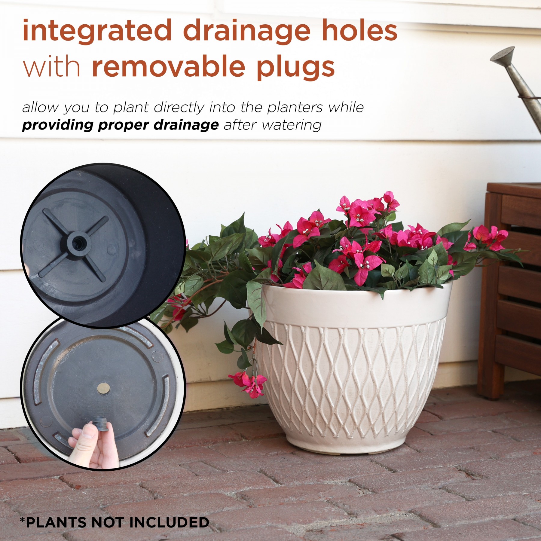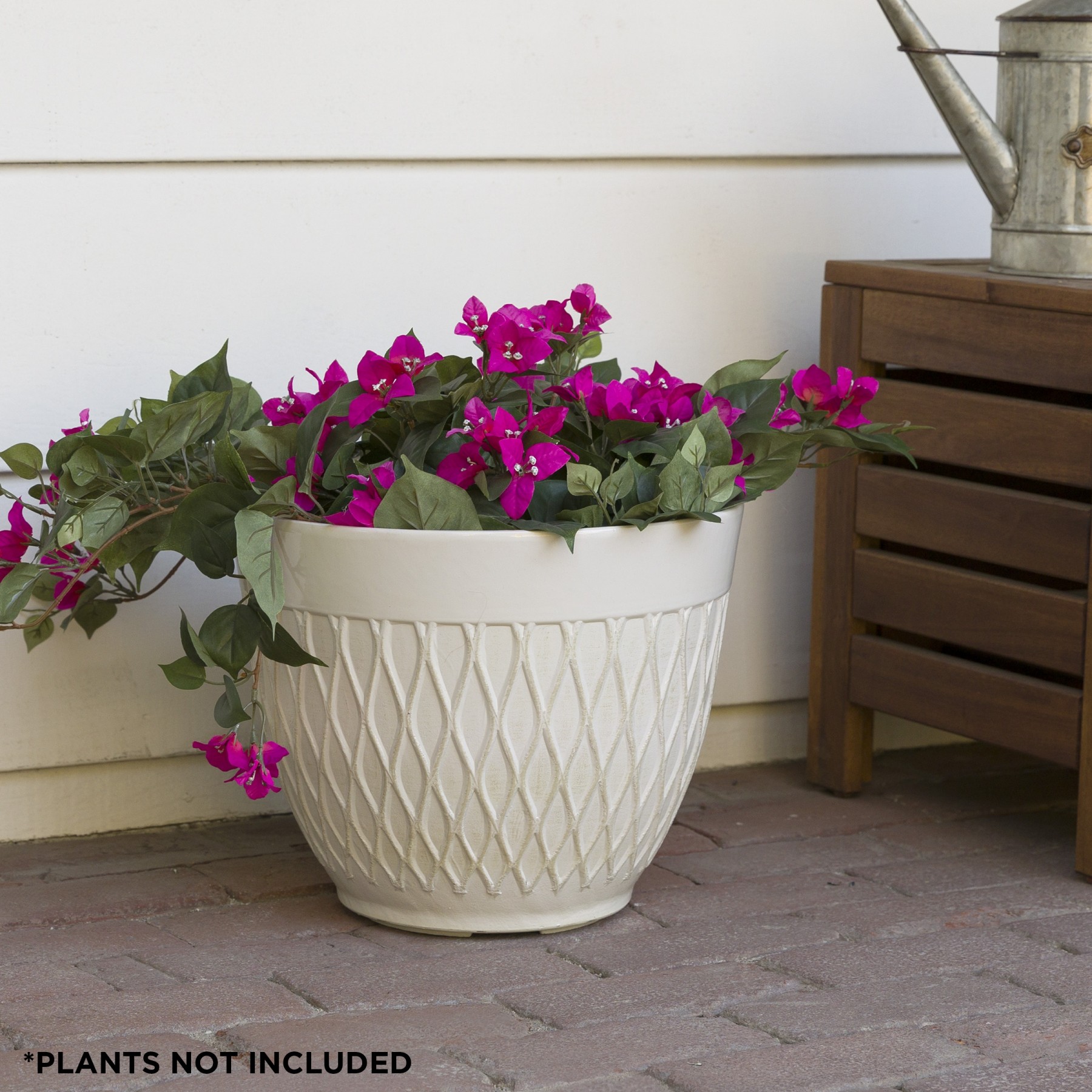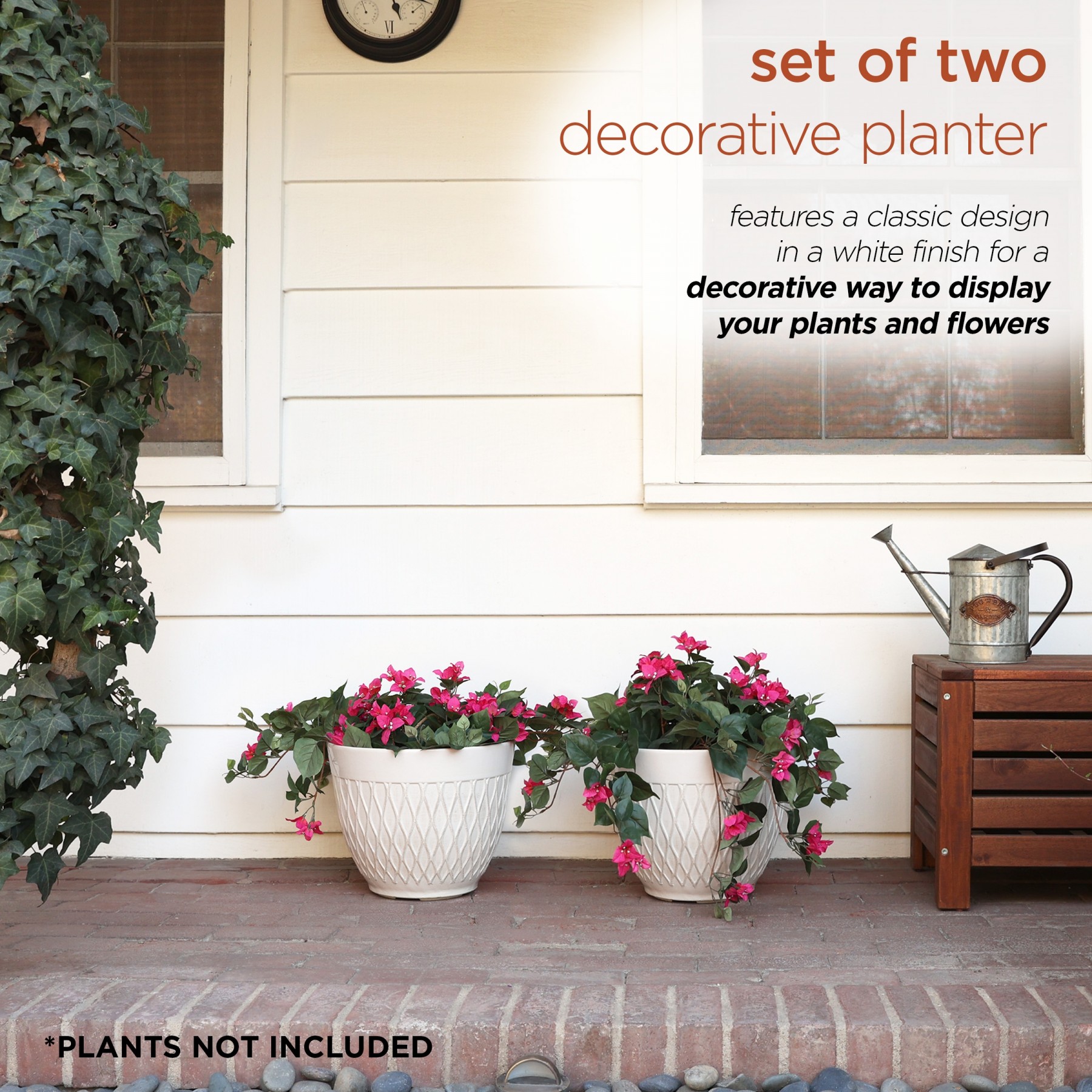 Enhance the natural beauty of your plants with the Alpine Corporation Stone-look Planters. This set of two matching planters feature a classic design in a white finish for a decorative way to display your plants and flowers. The integrated bottom holes allow you to plant directly into the planters while allowing for proper drainage after watering. These versatile planters can be placed indoors in your entryway, living room, family room, or foyer as well as outdoors on your patio, porch, or in your garden. Use separately in different locations or together to create a coordinated garden display. The durable stone-look material provides long-lasting use. Each planter measures 15"L x 15"W x 12"H to fit in almost any indoor or outdoor area, and they also include a one year manufacturer's warranty from date of purchase. Alpine Corporation is one of America's leading designers, importers, and distributors of superior quality home and garden decor products.