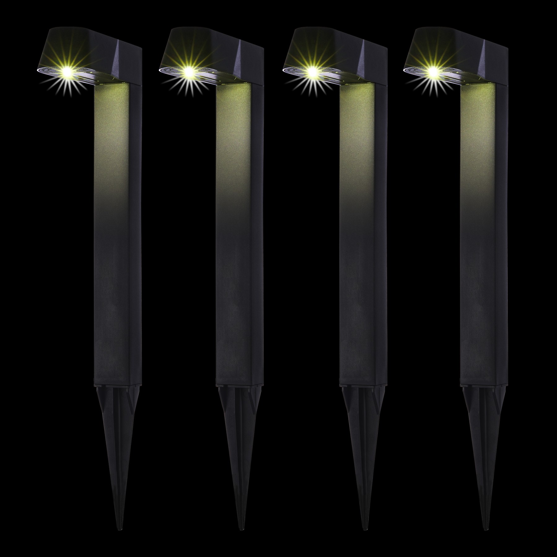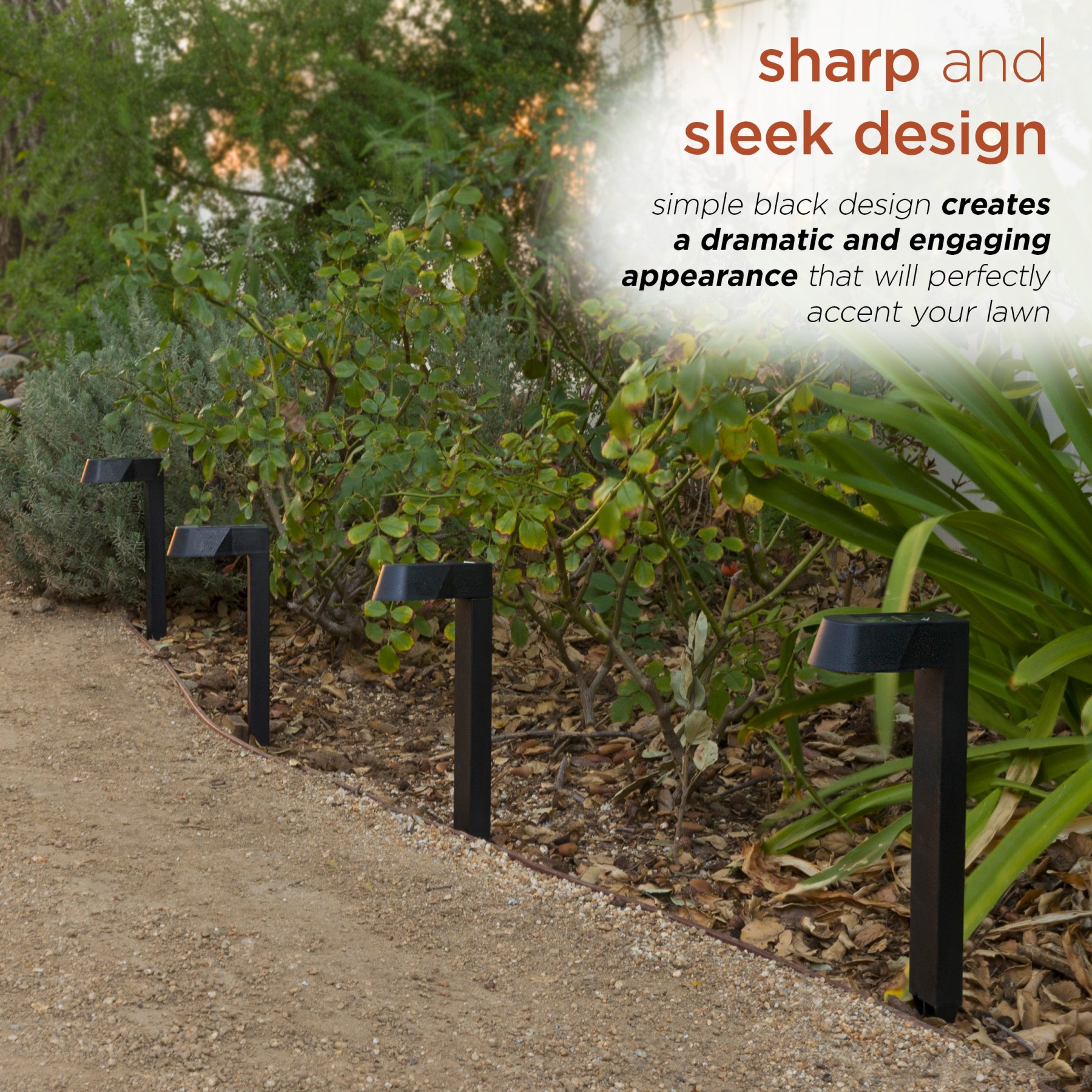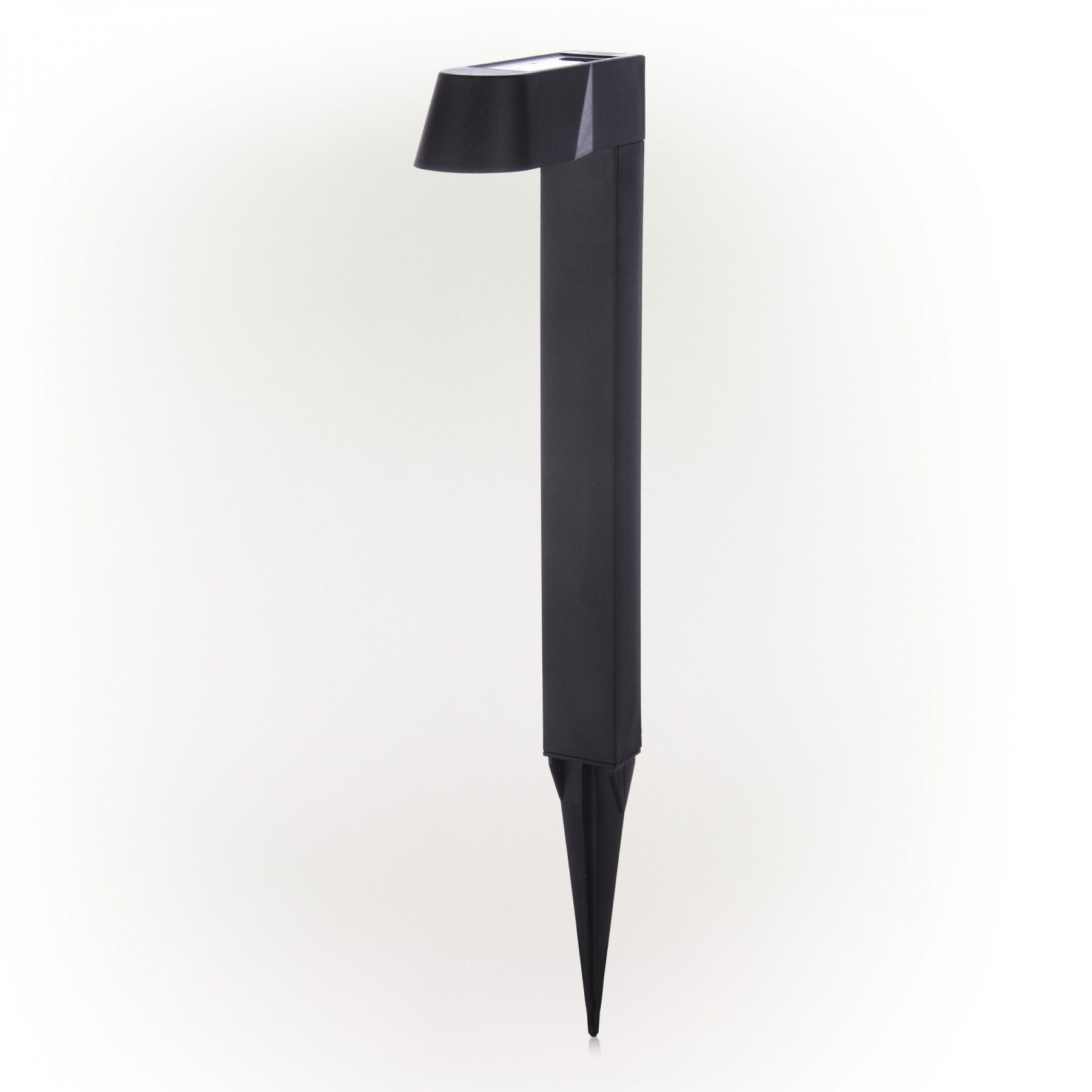 Cast a shining light on your yard with the Alpine Corporation Solar-Powered Black Abstract Pathway Lights. Modern and attractively simple, this sophisticated 4-pack comes with a set of sleek black garden stakes, each featuring a solar-powered, cool white LED light that will illuminate your garden for up to 6 to 8 hours on full solar charge. Place these stakes out in the sun, allow them to charge, then enjoy the dramatic glow of these energy-efficient lights that you can control with the included on/off switch. Easy to set up, you can install these lights around the outdoor area of your choosing by simply inserting them into the soil until they're secure. So you can enjoy these decorative stakes for many years, they are constructed of a durable plastic that is weather and rust-resistant. Each stake measures 2" x 4" x 18", and include a one-year manufacturer's warranty from date of purchase.