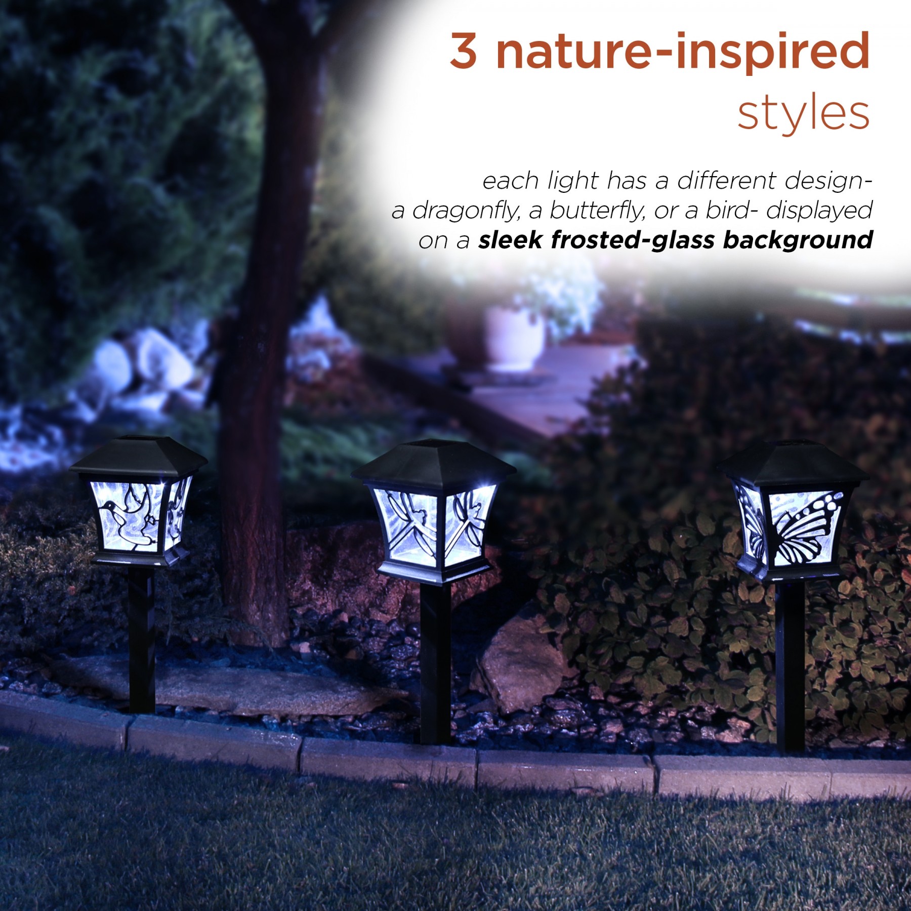 Cast a shining light on your yard with the Alpine Corporation Nature Inspired solar-powered Pathway Lights. This lovely 3-pack comes with a set of unique black garden stakes, each topped with a frosted pane box that displays a metal butterfly, dragonfly or bird accent. Apply these lights in your garden, by your porch, or along your pathway to add a chic touch to your lawn. Each box houses a solar-powered, cool white LED light that will illuminate your garden well into the nighttime. Place these stakes out in the sun, allow them to charge, then enjoy the soft glow of these energy-efficient lights that you can control with the included on/off switch. Easy to set up, you can install these lights around the outdoor area of your choosing by simply inserting them into the soil until they're secure. Each stake is constructed of a durable plastic that is weather and rust-resistant so you can enjoy these decorative stakes for many years. The stakes measure 4" x 4" x 14" each, and include a one-year manufacturer's warranty from date of purchase.