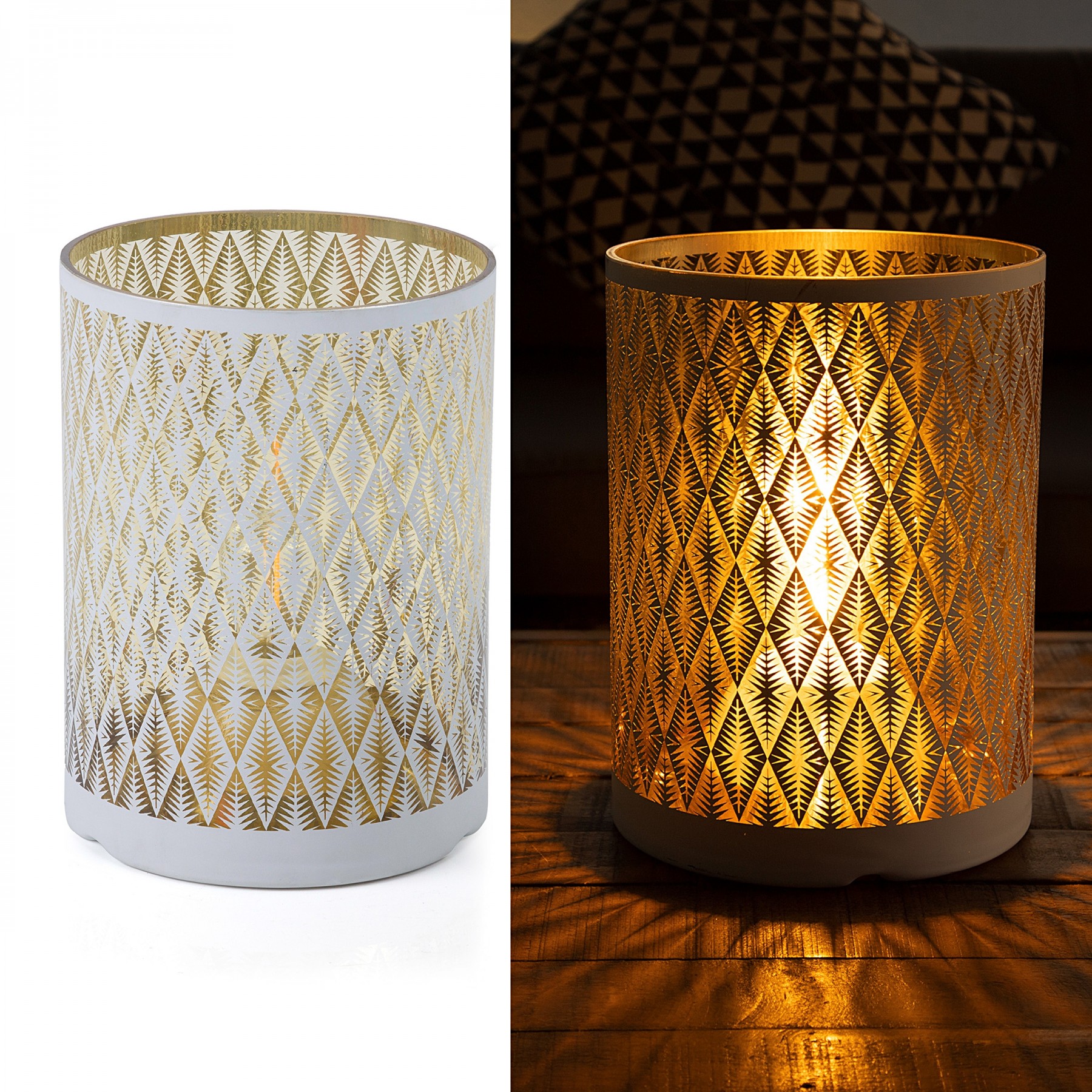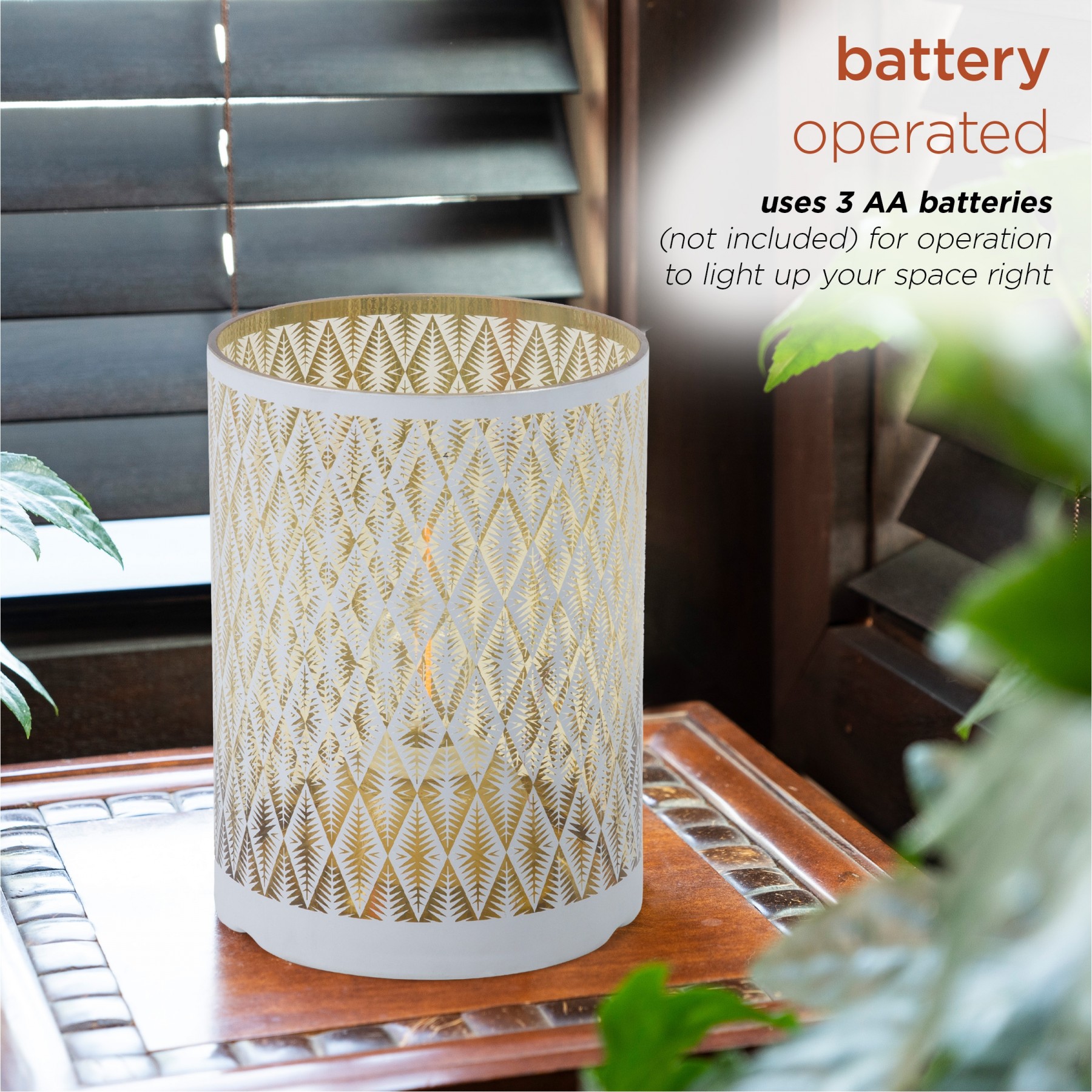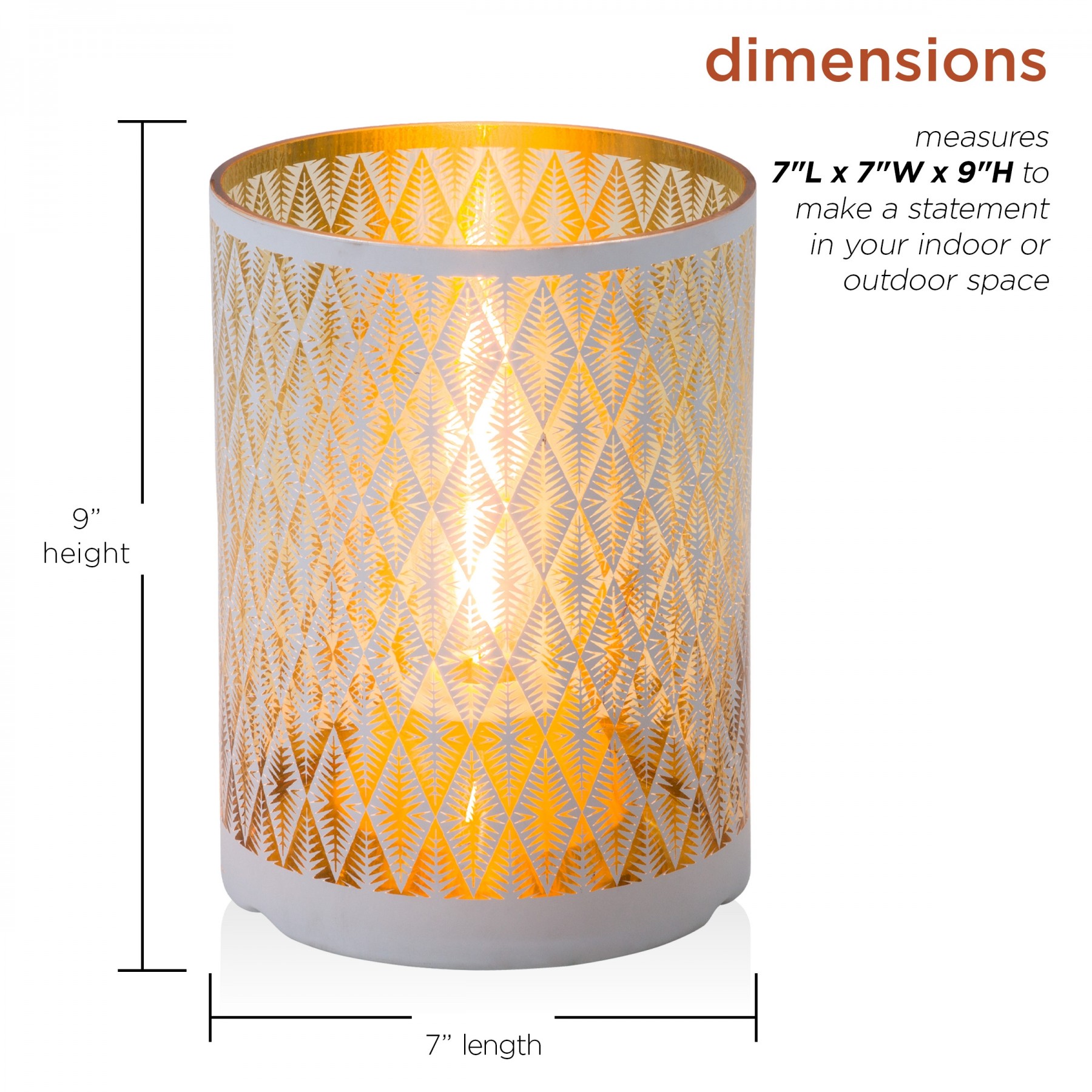 Create a soft, glowing atmosphere with the Alpine Corporation Indoor/Outdoor Diamond Lantern with Warm White Tungsten Light and Timer. This substantial glass lantern features a white diamond pattern that illuminates your indoor or outdoor space. Perfect for entertaining or creating a romantic mood with the warm white glow of the tungsten light bulb. This lantern comes complete with a battery operated timer so it will turn on for 6 hours and off for 18 hours whenever you like. The durable design of this lantern provides long-lasting use year after year. Measuring 7"L x 7"W x 9"H, the Alpine Corporation Indoor/Outdoor Diamond Lantern with Warm White Tungsten Lights and Timer makes a statement in your indoor or outdoor space and uses 3 AA batteries (not included).