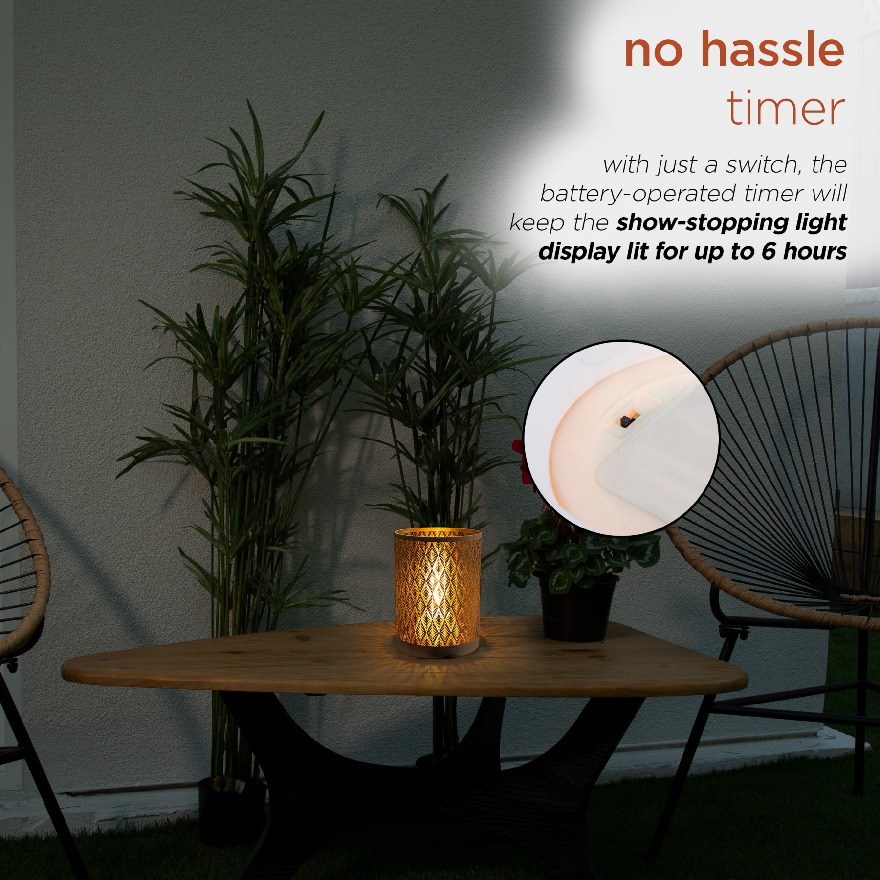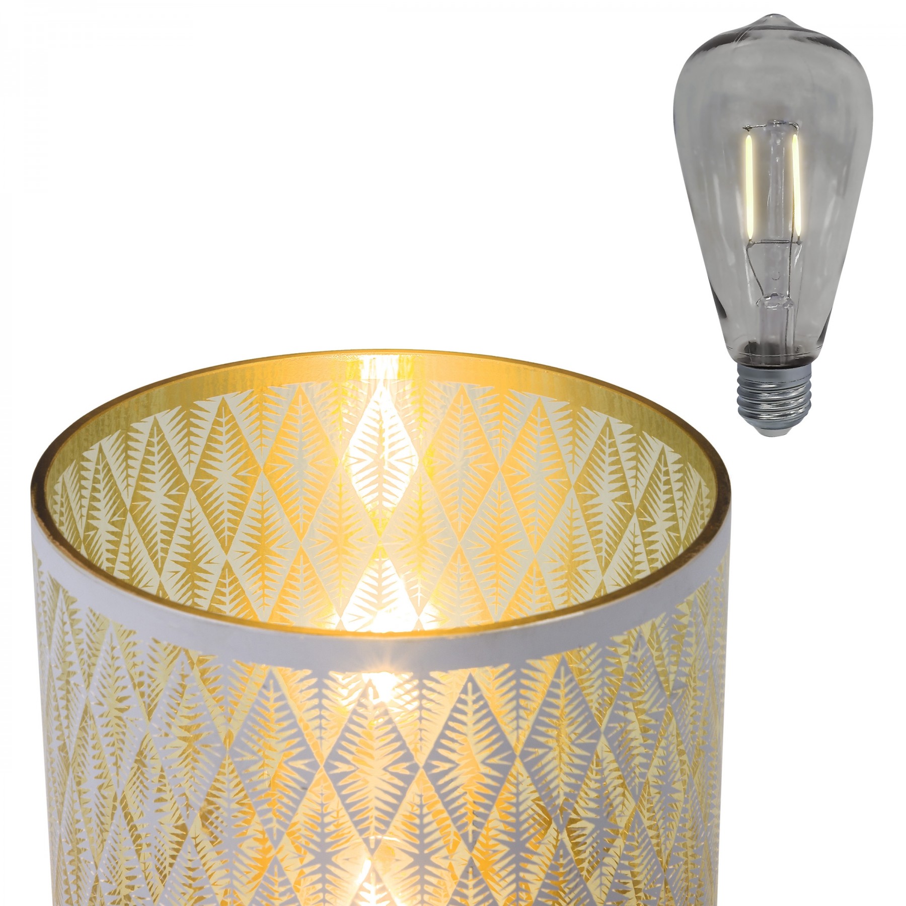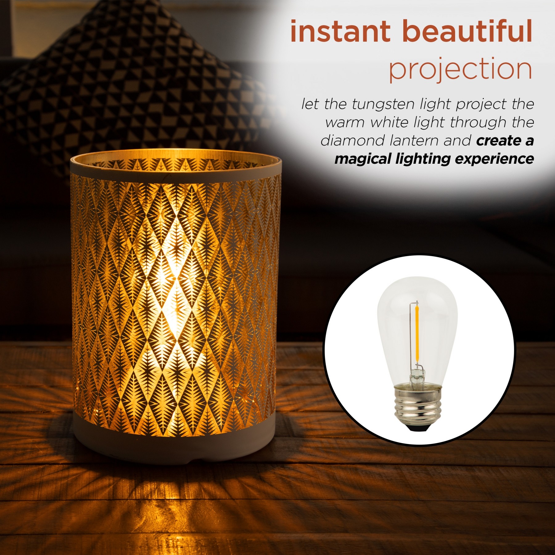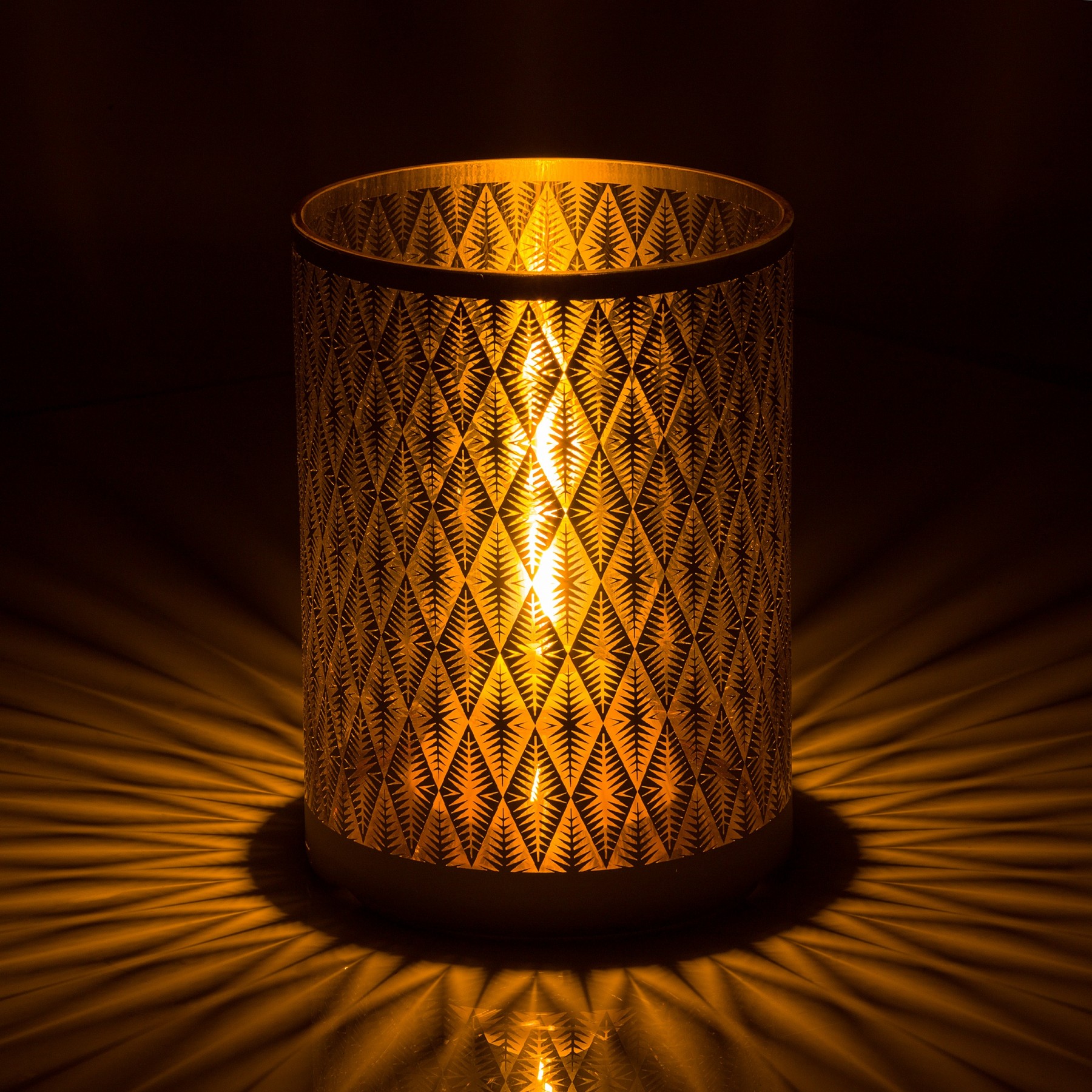 Create a soft, glowing atmosphere with the Alpine Corporation Indoor/Outdoor Diamond Lantern with Warm White Tungsten Light and Timer. This substantial glass lantern features a white diamond pattern that illuminates your indoor or outdoor space. Perfect for entertaining or creating a romantic mood with the warm white glow of the tungsten light bulb. This lantern comes complete with a battery operated timer so it will turn on for 6 hours and off for 18 hours whenever you like. The durable design of this lantern provides long-lasting use year after year. Measuring 7"L x 7"W x 9"H, the Alpine Corporation Indoor/Outdoor Diamond Lantern with Warm White Tungsten Lights and Timer makes a statement in your indoor or outdoor space and uses 3 AA batteries (not included).