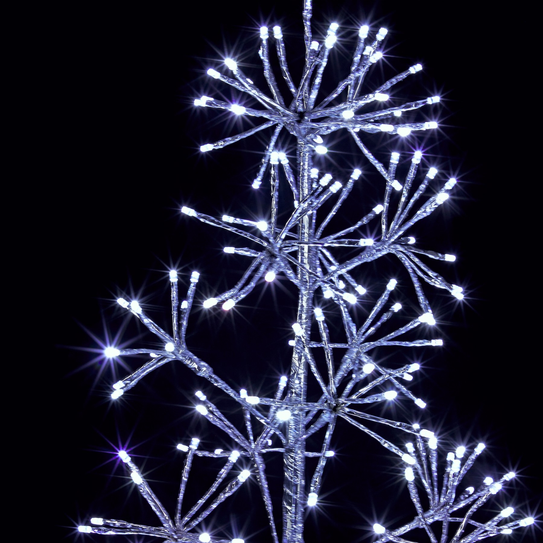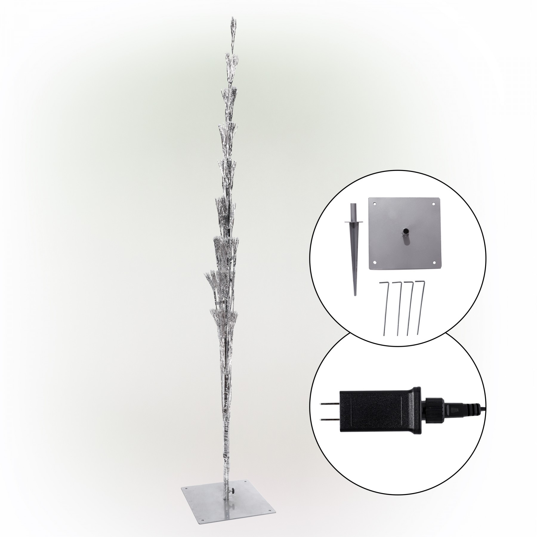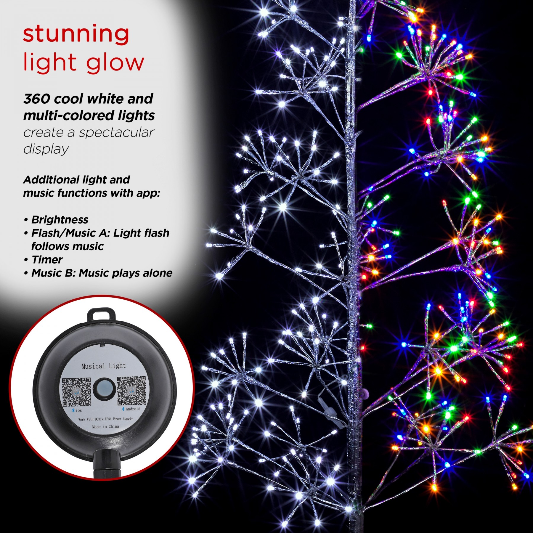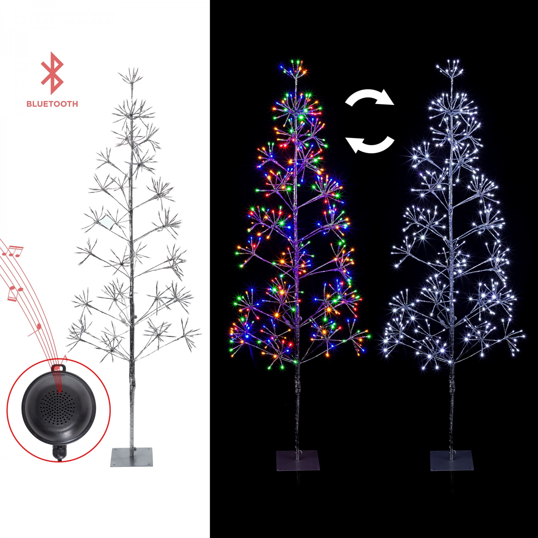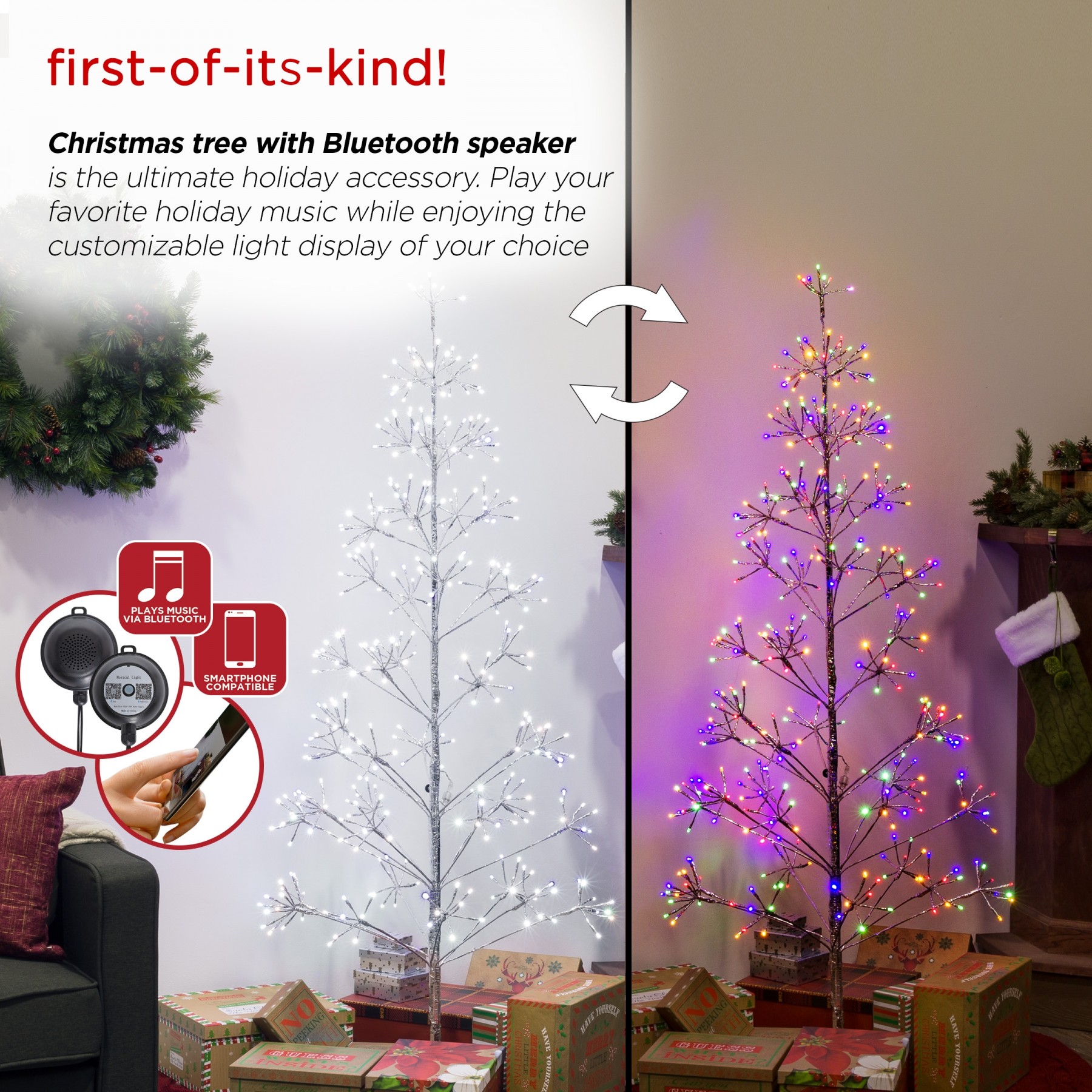 This holiday season, upgrade to the Alpine Corporation Foil Holiday Tree with LED Lights and Speaker! This glorious tree is the first-of-it's-kind and patent-pending. Listen to your favorite holiday tunes through the included weather-resistant 3.5" Bluetooth speaker, while you customize your tree's lighting effects from your smartphone with the app controller. The 360 cool white and multi-colored LED lights can be set into 10 different modes- Combination, In Waves, Sequential, Slo-Glow, Chasing/Flash, Slow Fade, Twinkle/Flash, and Steady. Turn on your favorite holiday playlist, set the timer in-app, and enjoy the light show that you created! This tree can light up your indoor or outdoor decor. Secure it into the lawn with the 4 included ground stakes, or afix it to the flat metal stabilizing base indoors. Tree conveniently stores flat after use. Be prepared- you will surely be asked to host every single holiday party from here on out! This tree comes at an impressive 30" x 30" x 71", and includes a one-year manufacturer's warranty from date of purchase.