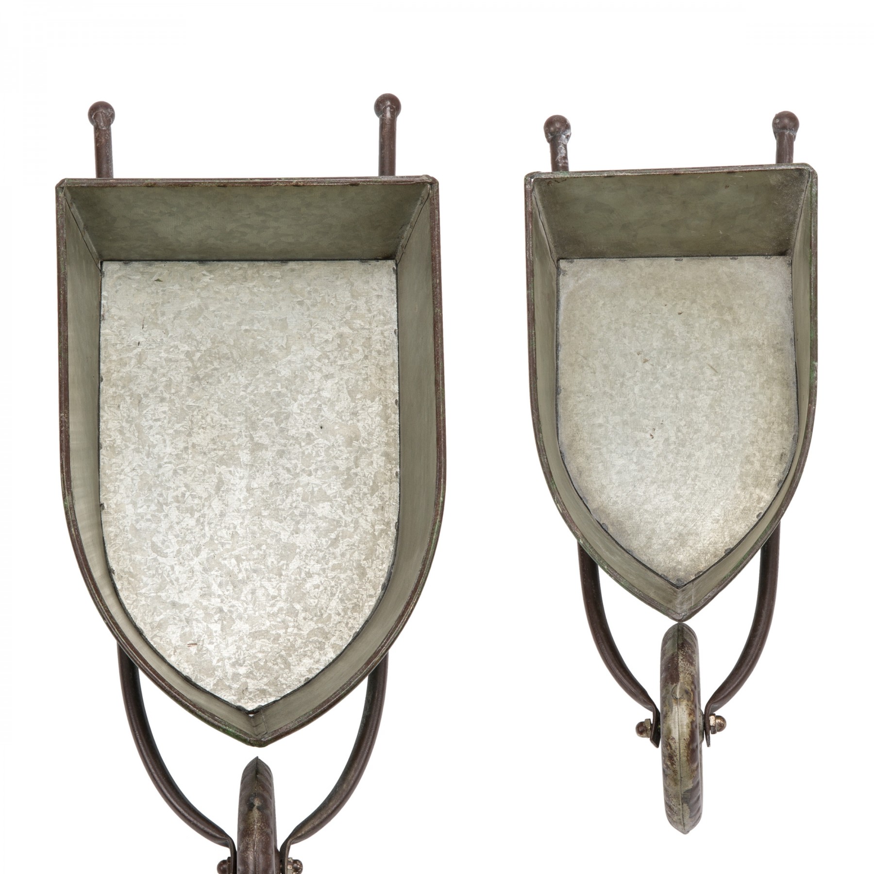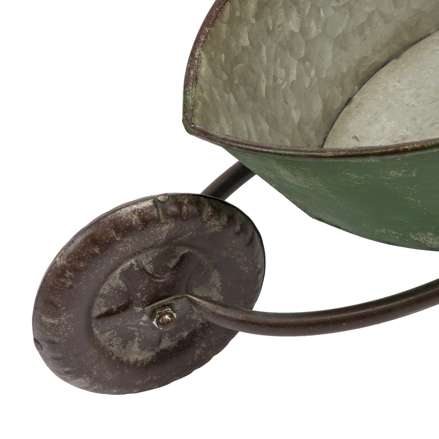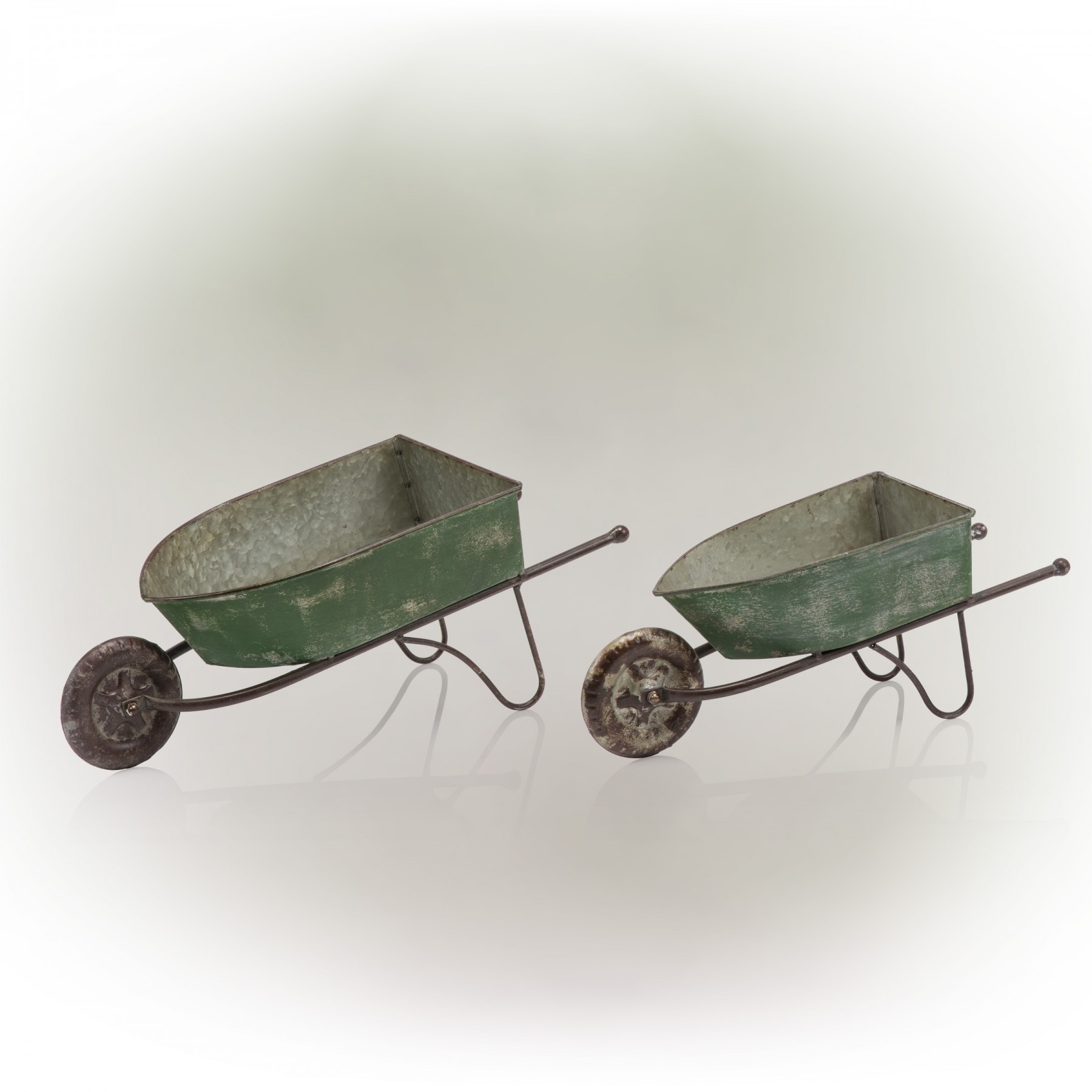 Add a touch of antique charm to your indoor or outdoor living space with the Alpine Corporation Pack of 2 Indoor/Outdoor Rustic Wheelbarrow Planter Decorations! These rustic lawn planters feature green vintage wheelbarrows for a fun addition to your home's outdoor area. Constructed from resilient iron, the yard decorations are weatherproof and rust-resistant for years of quality use on your lawn or porch. With their intricate details, these compact statues can also be used as tabletop décor. Add one or multiple planters to create an enchanted flower display on your deck, outdoor tabletop, or in your home. Wherever you place these Alpine Corporation statues, they're sure to bring whimsical joy to your home! The larger indoor/outdoor lawn planter measures 19"L x 8"W x 8"H while the smaller planter measures 17"L x 6"W x 7"H to fit almost any indoor or outdoor space, and the set includes a one-year manufacturer's warranty from date of purchase.