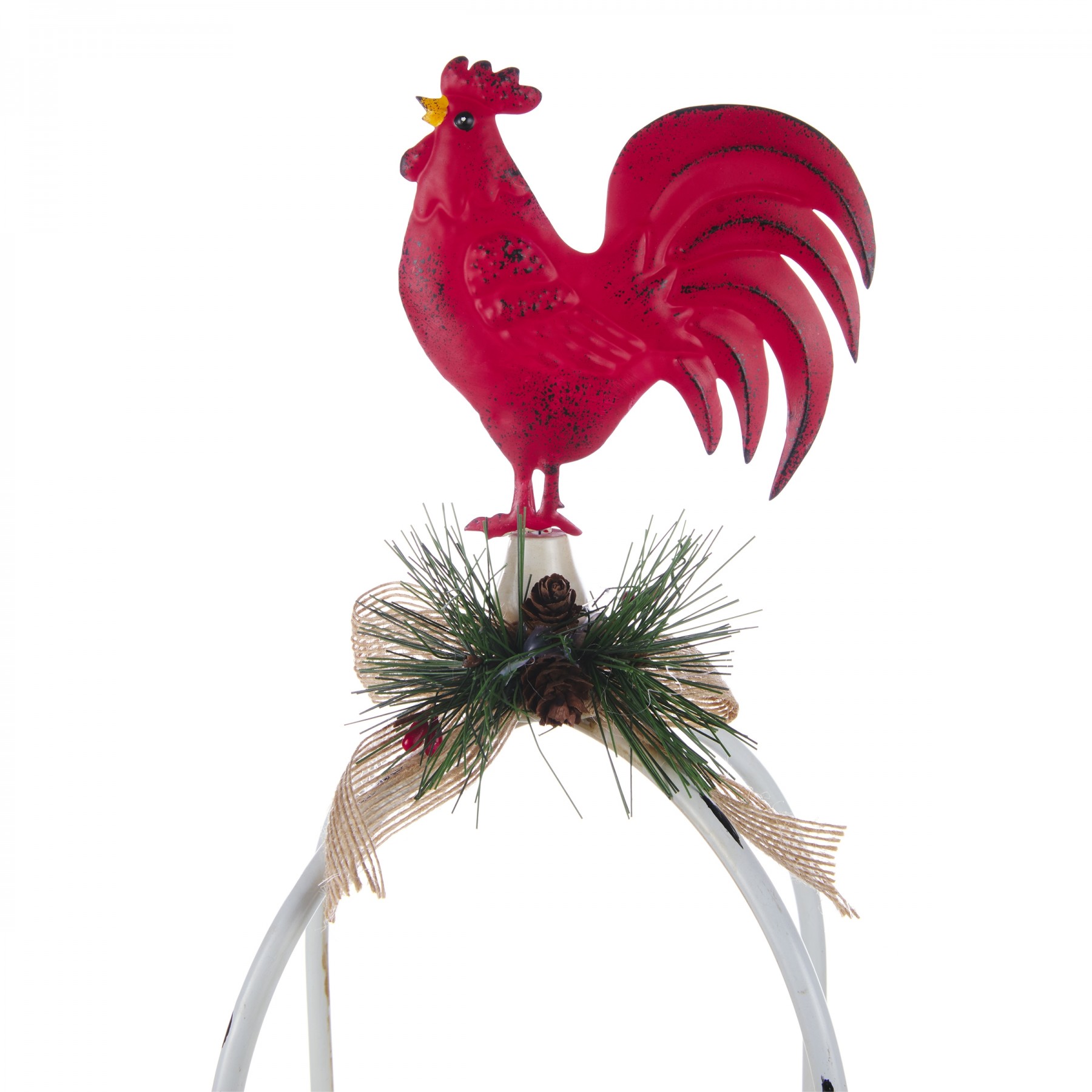 Give that holiday display an old-fashioned touch with the Alpine Corporation Rustic Metal Candle Decor with Rooster and LED Lights! This white metal frame has plenty of personality, featuring 3 warm white LED candles of varying heights for a realistic appearance, winter greenery and is topped off with a bright red rooster. While this decoration provides a blissful, warm light that will remind you of a very a simpler time, it is conveniently powered by 6 AA batteries, which are sold separately, and has an on/off/timer switch, so you don't have to worry about lighting or blowing out troublesome and hazardous flames. Durably made so you can enjoy for many holiday seasons in the future, this faux candle display measures 11" x 11" x 18", so you can use it as a centerpiece both indoors and outdoors, and includes a one-year manufacturer's warranty from date of purchase.