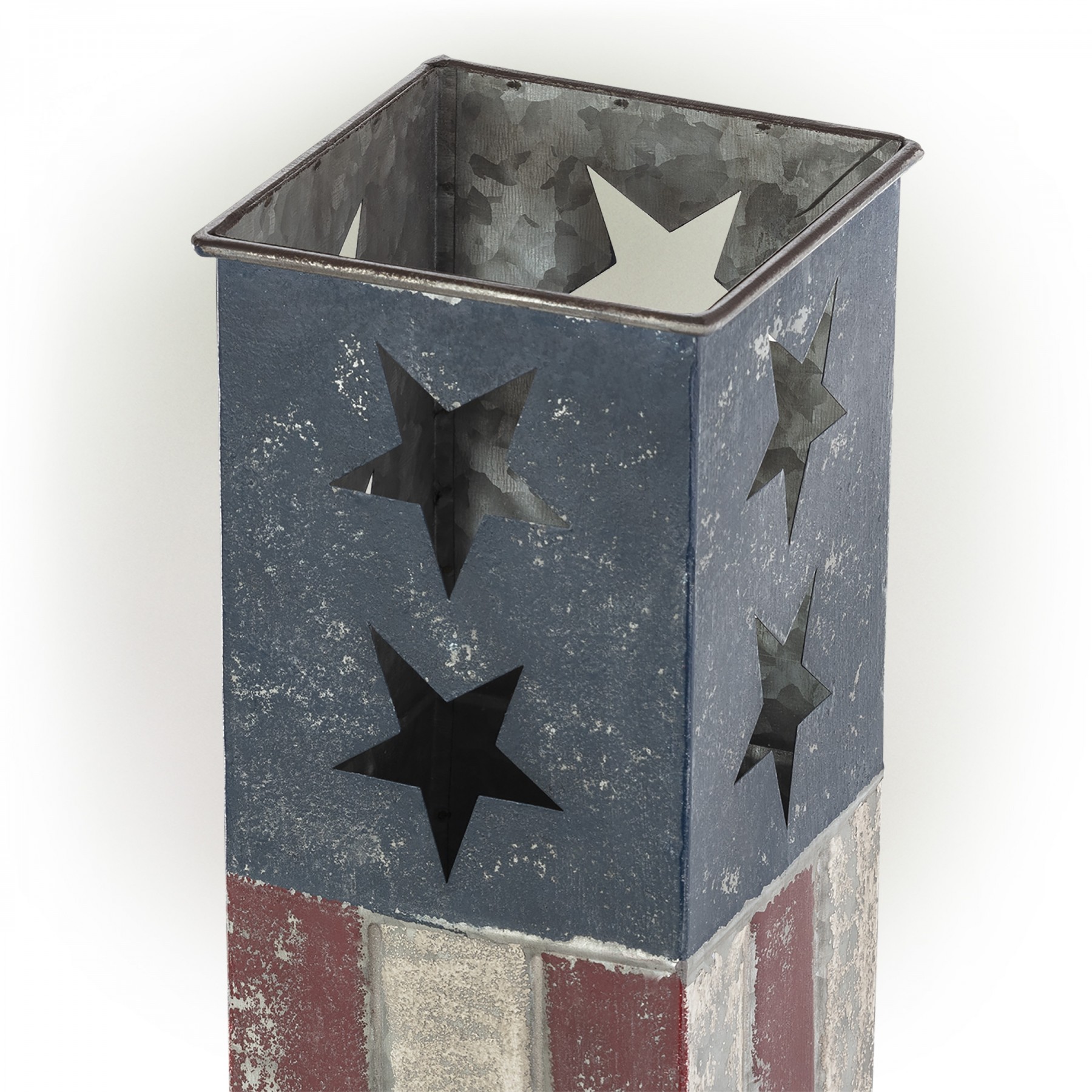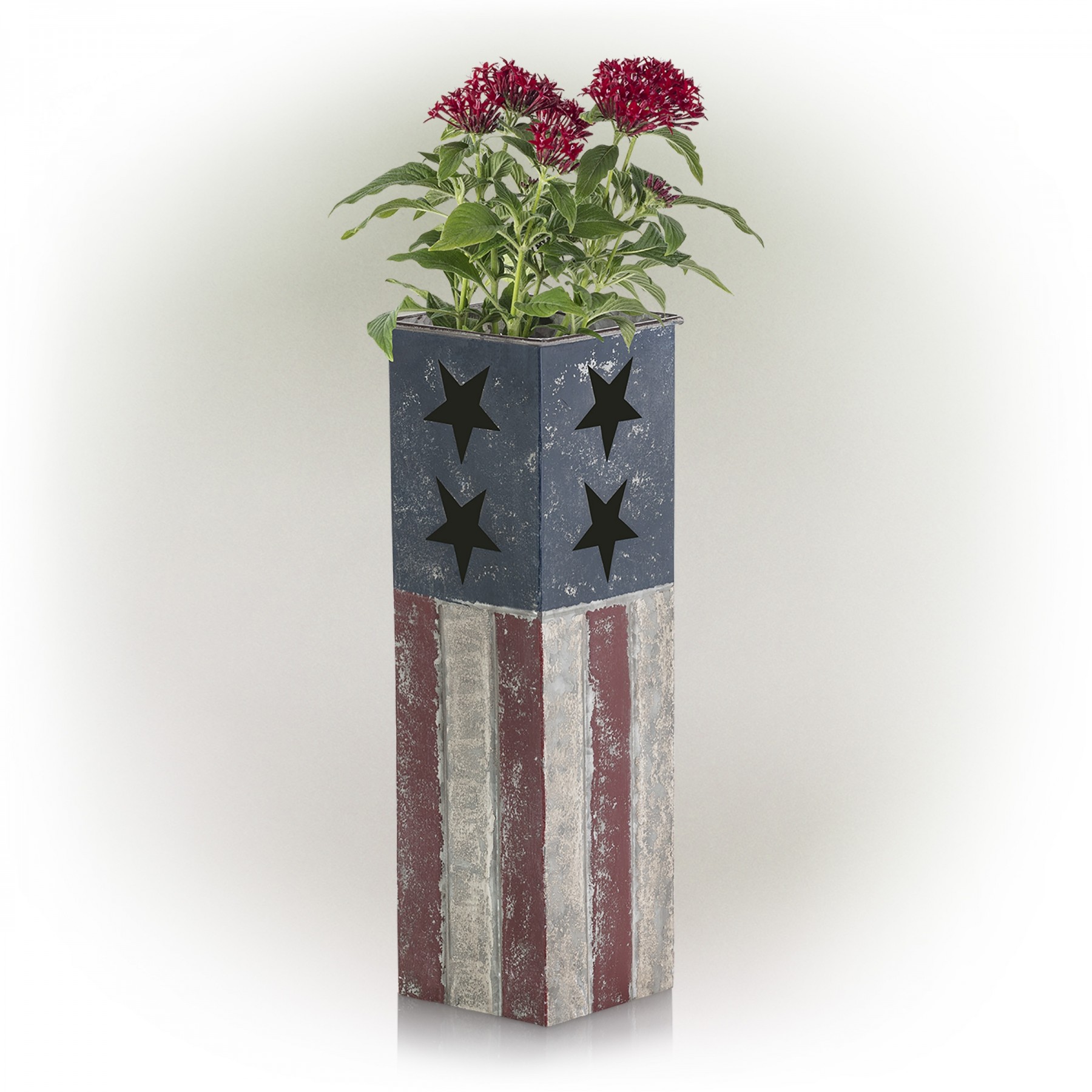Create an inviting walkway or enhance your garden’s natural beauty by adding this 16" tall Indoor/Outdoor Rustic Metal American Flag Decorative Planter from Alpine Corporation. This weathered finish planter with a rustic, distressed look and American flag inspiration will add a unique and patriotic addition to your indoor or outdoor home décor. Skillfully crafted from durable iron with a distressed, weathered appearance, the planter has a rustic painted finish. This durable decorative planter will provide long-lasting quality use in your garden or home's entryway. Due to its versatile functions, you can include this planter along your home’s pathway or in your award-winning flowerbeds as a decorative accent to display your lush, green plants and exotic flowers. It can also be used in your living room, foyer, or family room as an accent piece. Add one or multiple planters with your favorite plants and flowers to add all-American style to your garden or courtyard. The worn-in finish adds visual interest to home interiors and exteriors. The compact planter measures 5”L x 5”W x 16"H to fit almost any indoor or outdoor area, and includes a one year manufacturer's warranty from date of purchase.