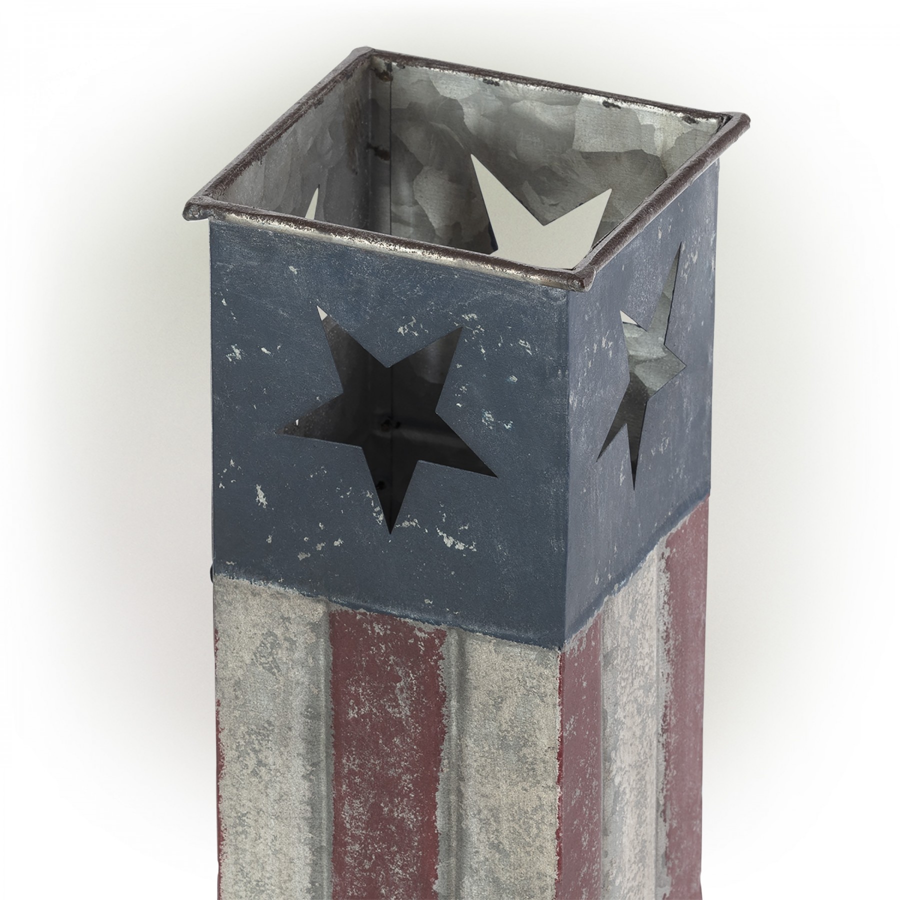 Create an inviting walkway or enhance your garden’s natural beauty by adding this 16" tall Indoor/Outdoor Rustic Metal American Flag Decorative Planter from Alpine Corporation. This weathered finish planter with a rustic, distressed look and American flag inspiration will add a unique and patriotic addition to your indoor or outdoor home décor. Skillfully crafted from durable iron with a distressed, weathered appearance, the planter has a rustic painted finish. This durable decorative planter will provide long-lasting quality use in your garden or home's entryway. Due to its versatile functions, you can include this planter along your home’s pathway or in your award-winning flowerbeds as a decorative accent to display your lush, green plants and exotic flowers. It can also be used in your living room, foyer, or family room as an accent piece. Add one or multiple planters with your favorite plants and flowers to add all-American style to your garden or courtyard. The worn-in finish adds visual interest to home interiors and exteriors. The compact planter measures 5”L x 5”W x 16"H to fit almost any indoor or outdoor area, and includes a one year manufacturer's warranty from date of purchase.