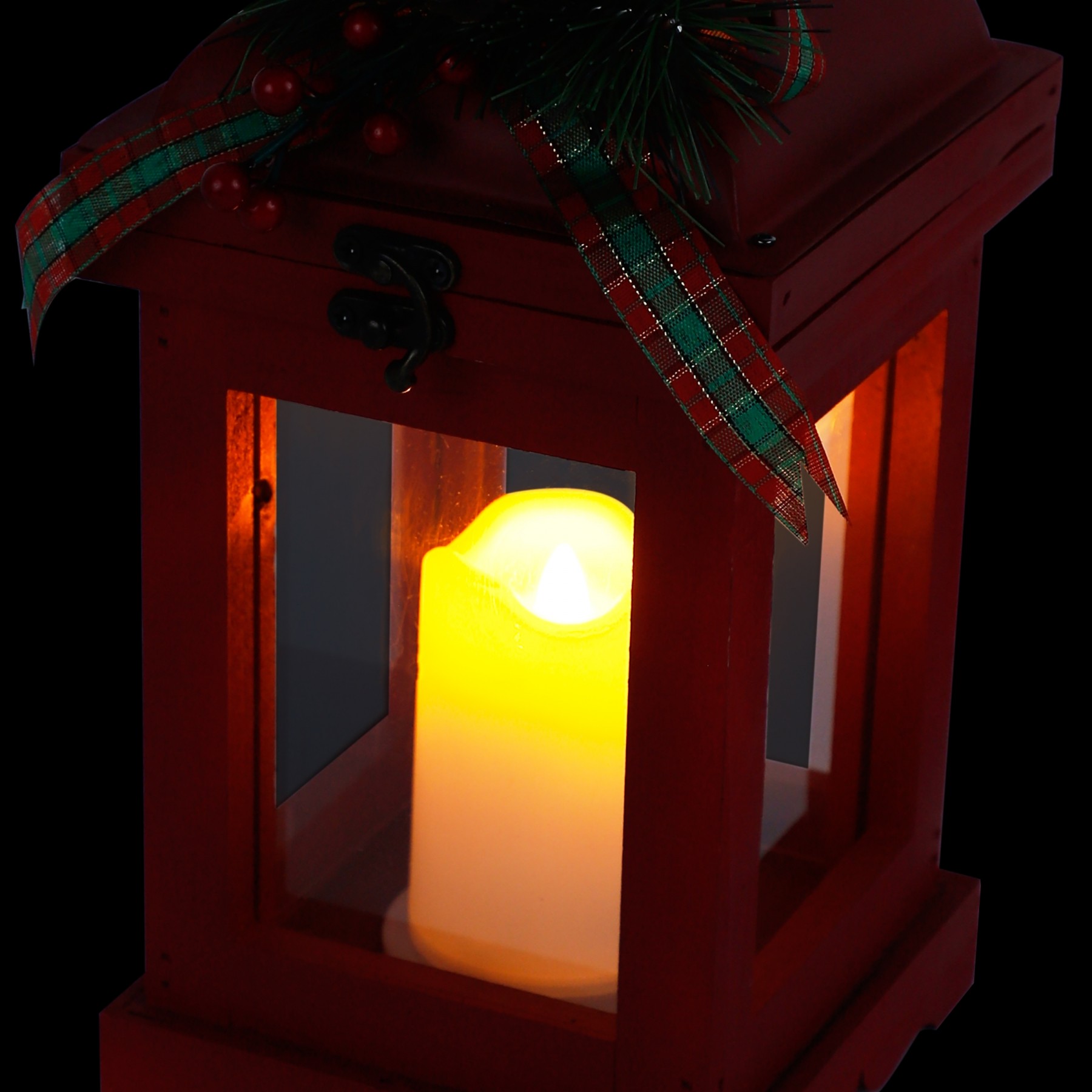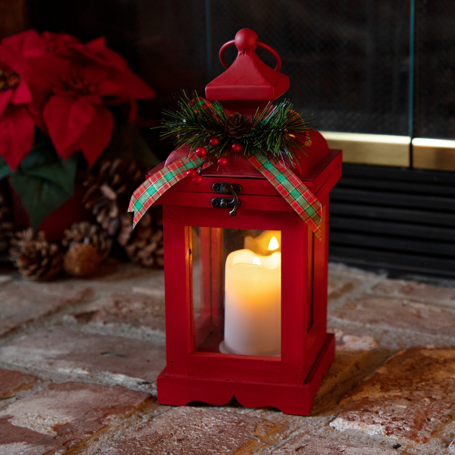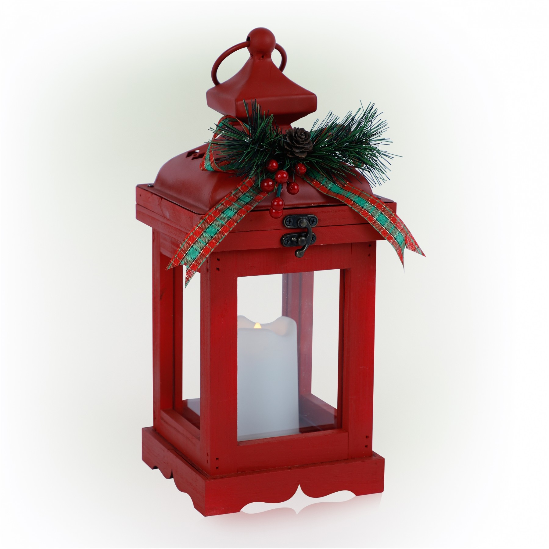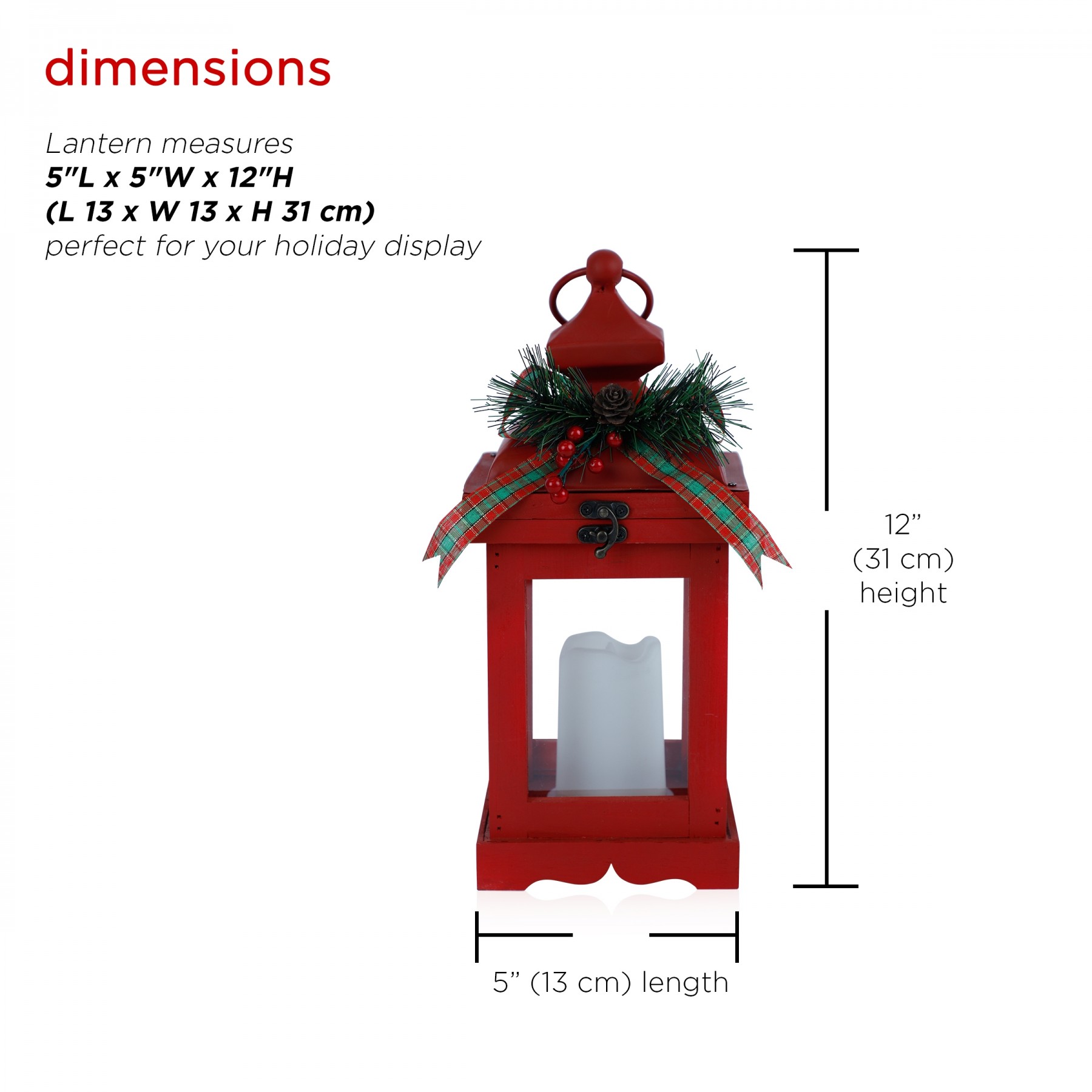 For a timeless, vintage approach to your holiday decor, light up the cold winter night with the Alpine Corporation Metal and Glass Lantern with an LED Candle! This dashing red wood-finish lantern comes fitted with a pine sprig and colorful ribbon, so it spreads holiday cheer wherever it's placed. Enchant guests or passersby with the internal Warm White LED faux candle, conveniently powered by 2 AA batteries, which are sold separately, and an on/off/ 6-hour timer switch, so you don't have to worry about lighting or blowing out troublesome and hazardous flames. This versatile lantern can be placed on a sturdy table or hung in your hallway, near your holiday tree, and by or on your front door for a festive, comforting glow just about anywhere. Durably made so you can enjoy for many holiday seasons in the future, this lantern measures 5"L x 5"W x 12"H, 14" high when hung up, and includes a one-year manufacturer's warranty from date of purchase.