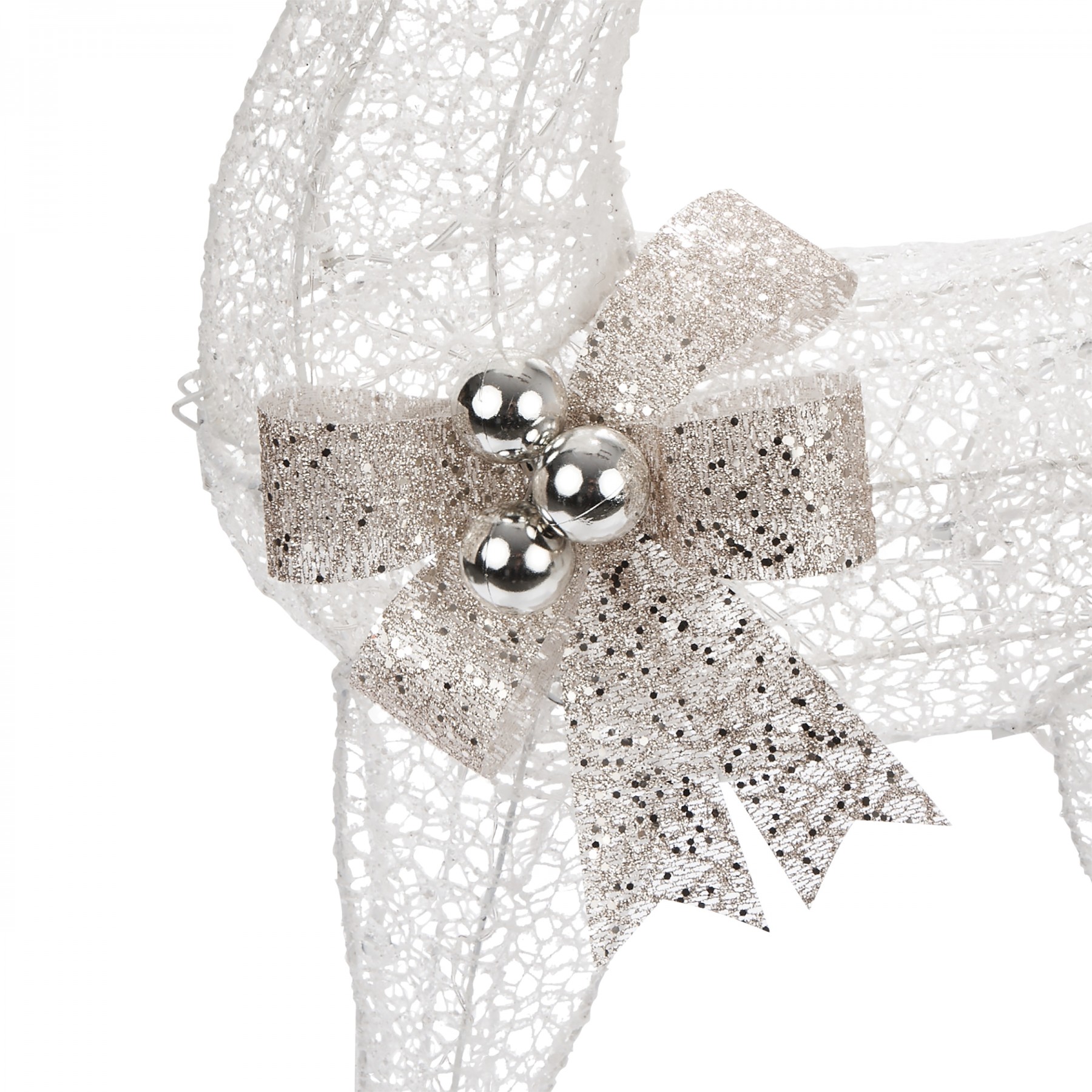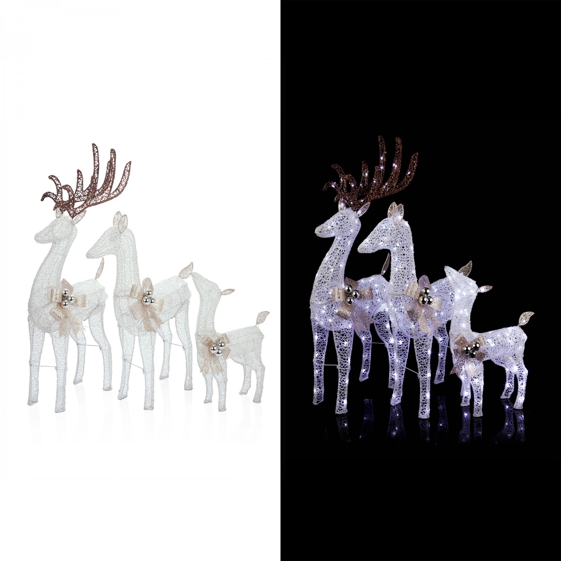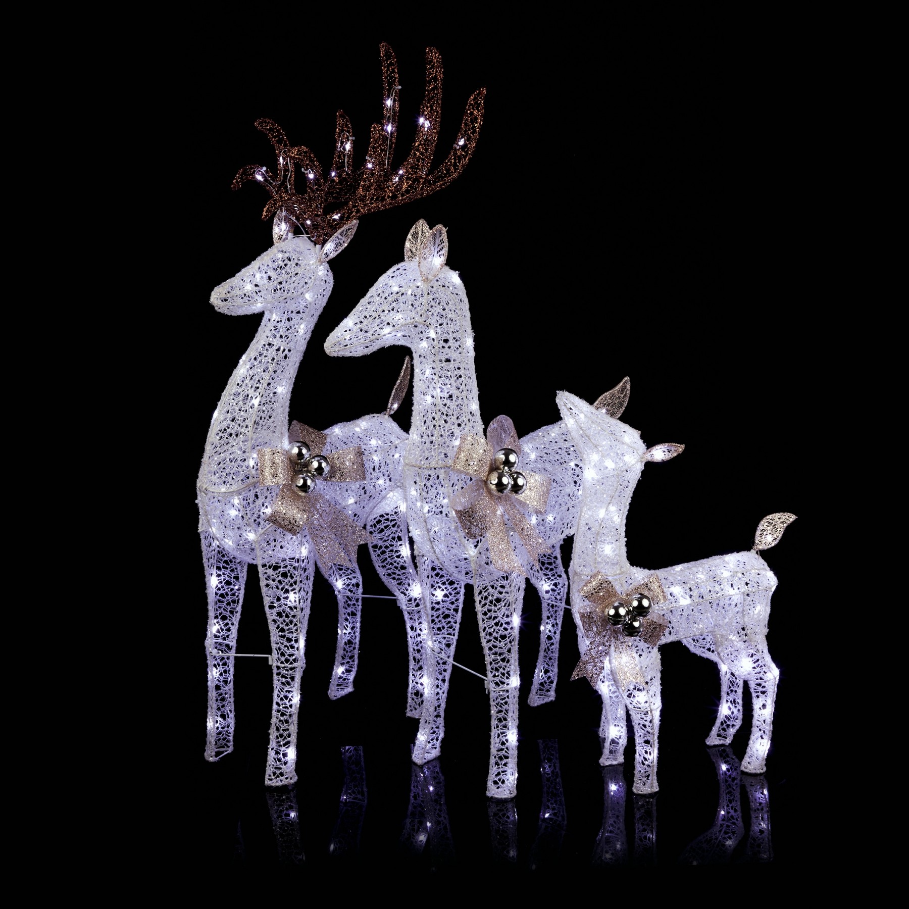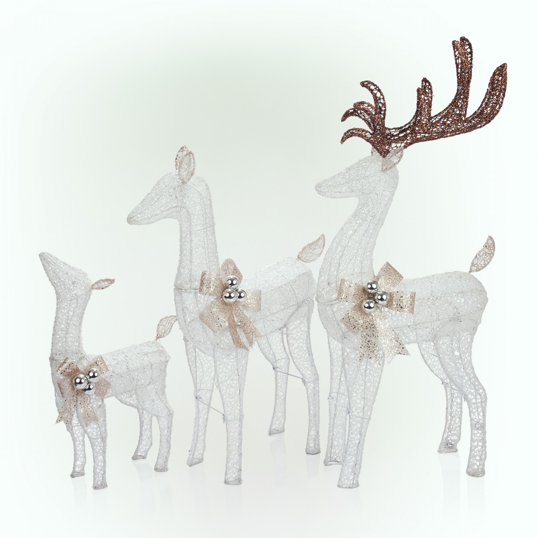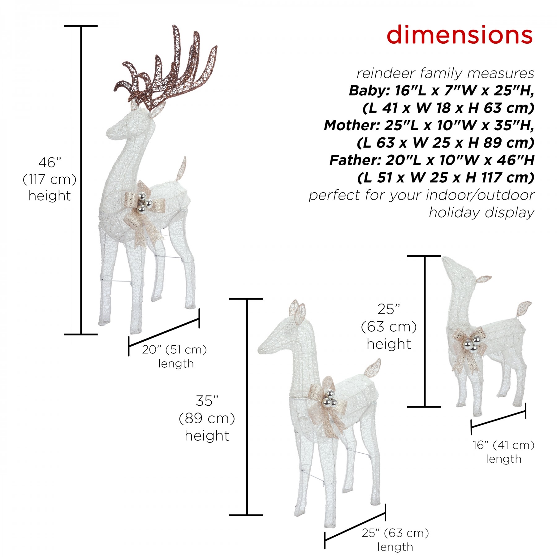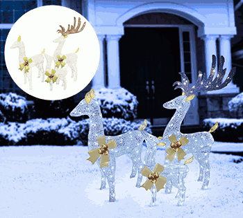 Nothing says the holidays like family, and this Alpine White Mesh Reindeer Family with LED Lights adds a charming focal point to your holiday yard display. With three beautiful, elegant reindeer of different sizes formed from a pristine white mesh and accented with gold bows and festive ornaments, you'll encourage everyone who passes by to get into the holly-jolly spirit. Using 230 cool white LED lights, these reindeer provide exquisite illumination to your holiday display. For simple set-up and increased stability, 6 ground stakes and a 16 foot electrical cord are included. Each member of this reindeer family measures 16"L x 7"W x 25"H (Baby), 25"L x 10"W x 35"H (Mom), and 20"L x 10"W x 46"H (Dad). This set also includes a one-year manufacturer's warranty from date of purchase.
