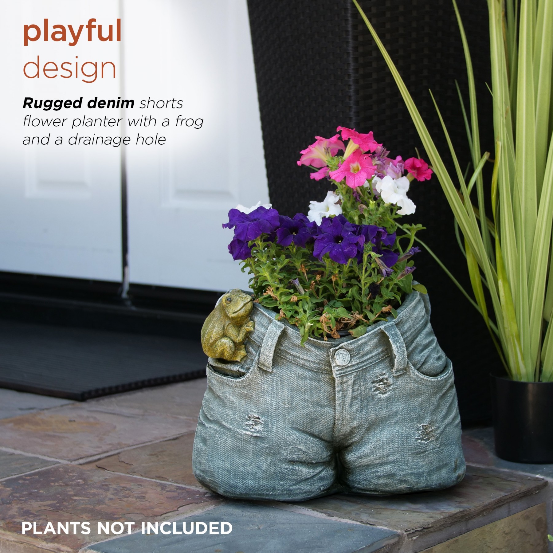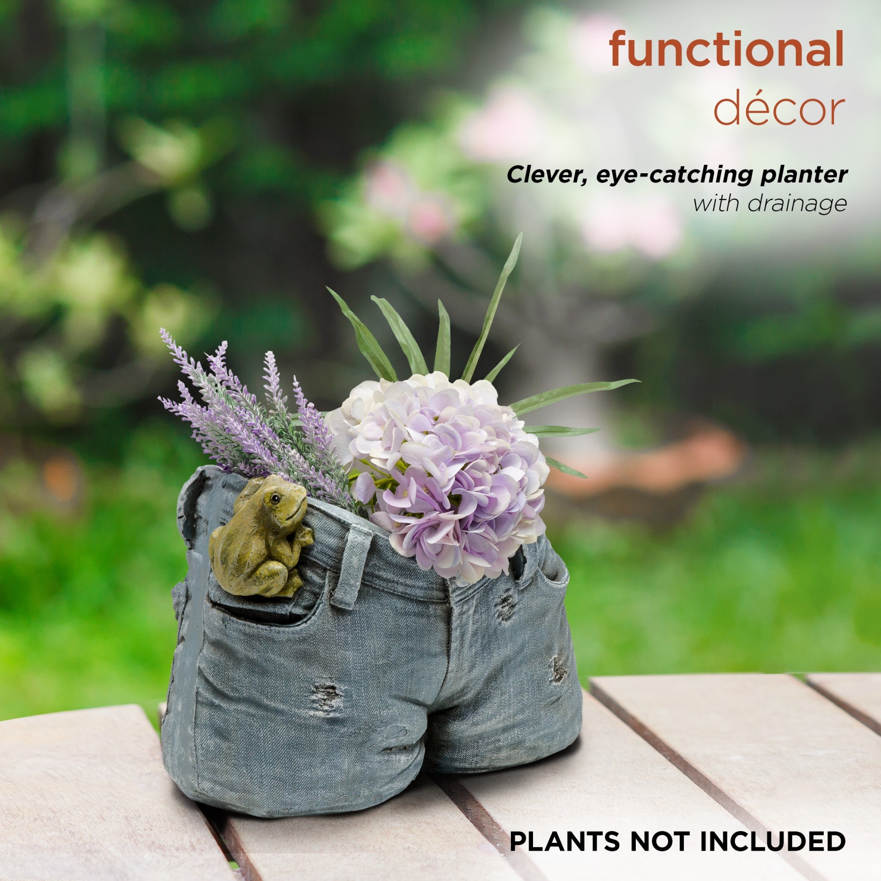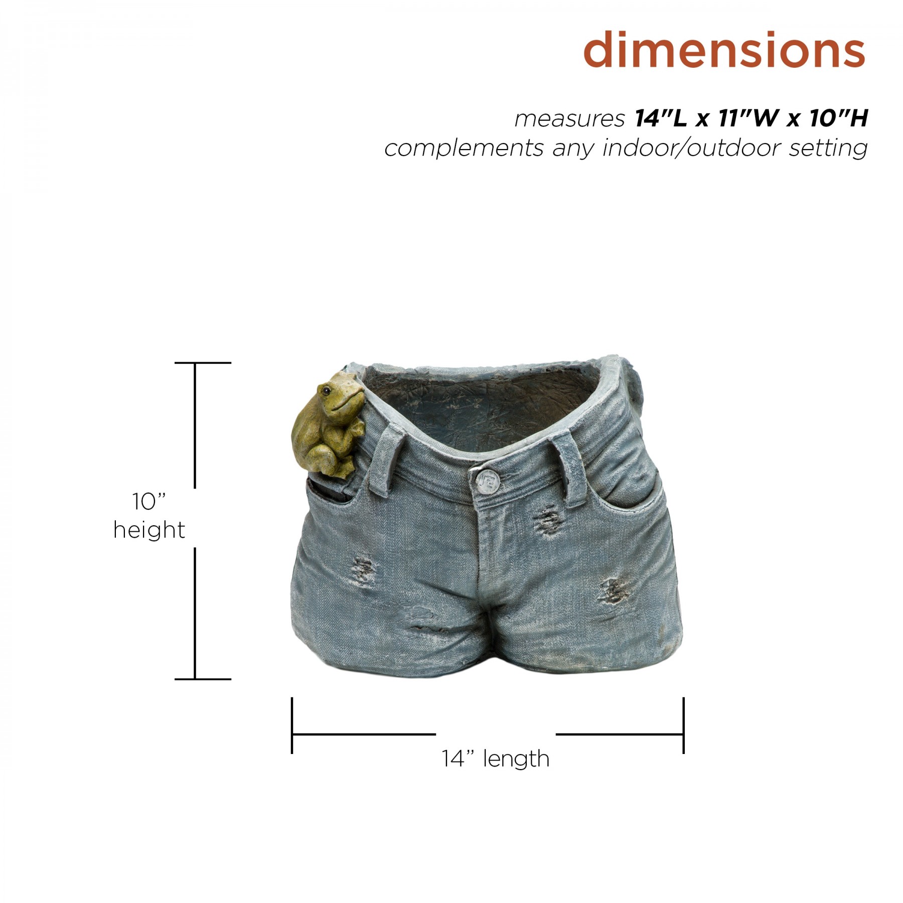 Create an inviting walkway or enhance your garden’s natural beauty by adding this 10" tall Indoor/Outdoor Denim Shorts with Frog Shaped Planter and Yard Decoration from Alpine Corporation. This weathered finish planter in the shape of a pair of blue jean shorts with an adorable clinging frog will provide a unique and rustic addition to your indoor or outdoor home décor. Skillfully crafted from weather-resistant and resilient magnesia, the planter has a weathered finish. This durable flower planter will provide long-lasting quality use in your garden or home's entryway. Due to its versatile functions, you can include this playful piece along your home’s pathway or in your flowerbeds as a decorative accent to display your lush, green plants and exotic flowers. It can also be used in your living room, foyer, or family room as an accent piece. Add one or multiple planters with your favorite plants and flowers to add a fun yard display to your garden or courtyard. The worn-in finish and life-like details of the shorts and frog add visual interest to home interiors and exteriors. The compact planter measures 14"L x 11"W x 10"H to fit almost any indoor or outdoor area, and includes a one year manufacturer's warranty from date of purchase.