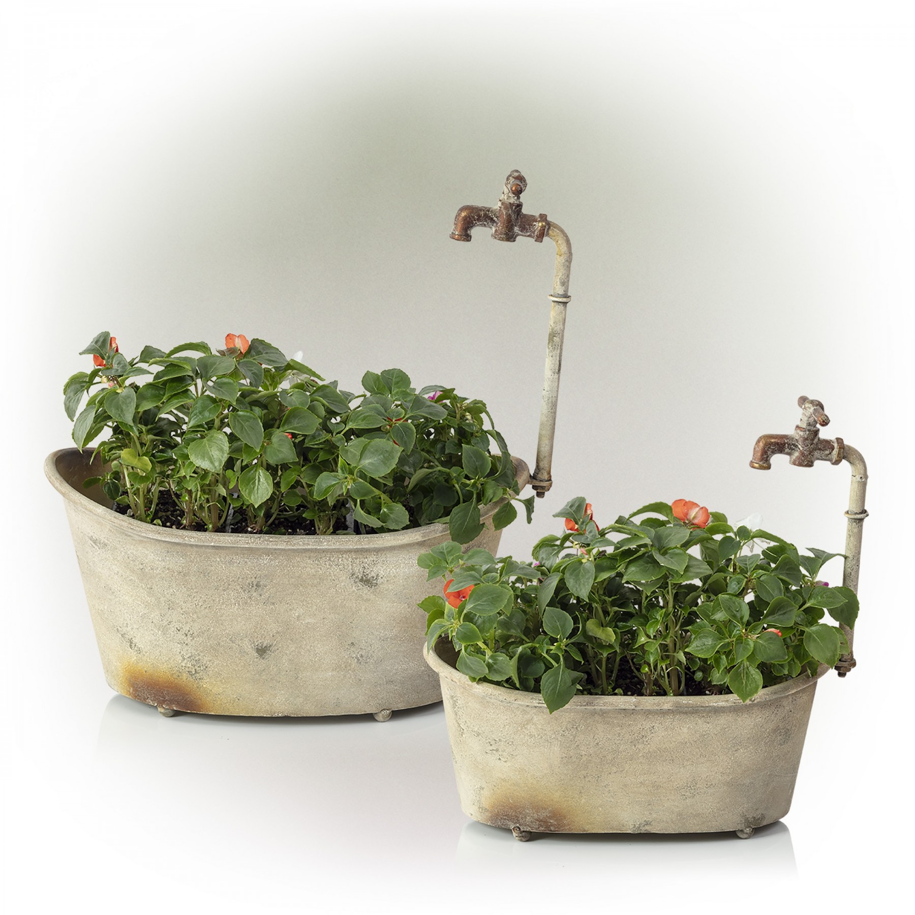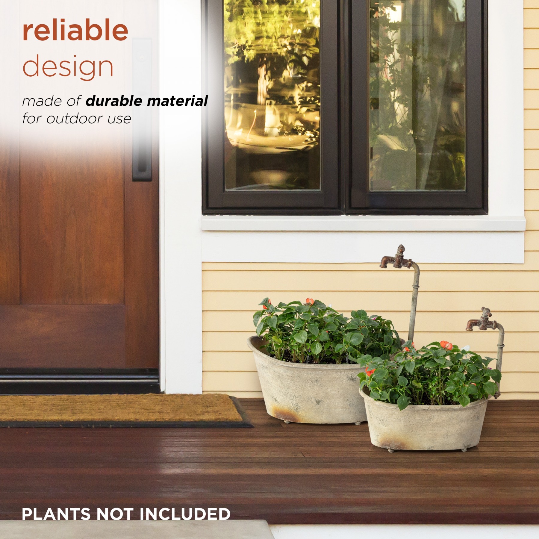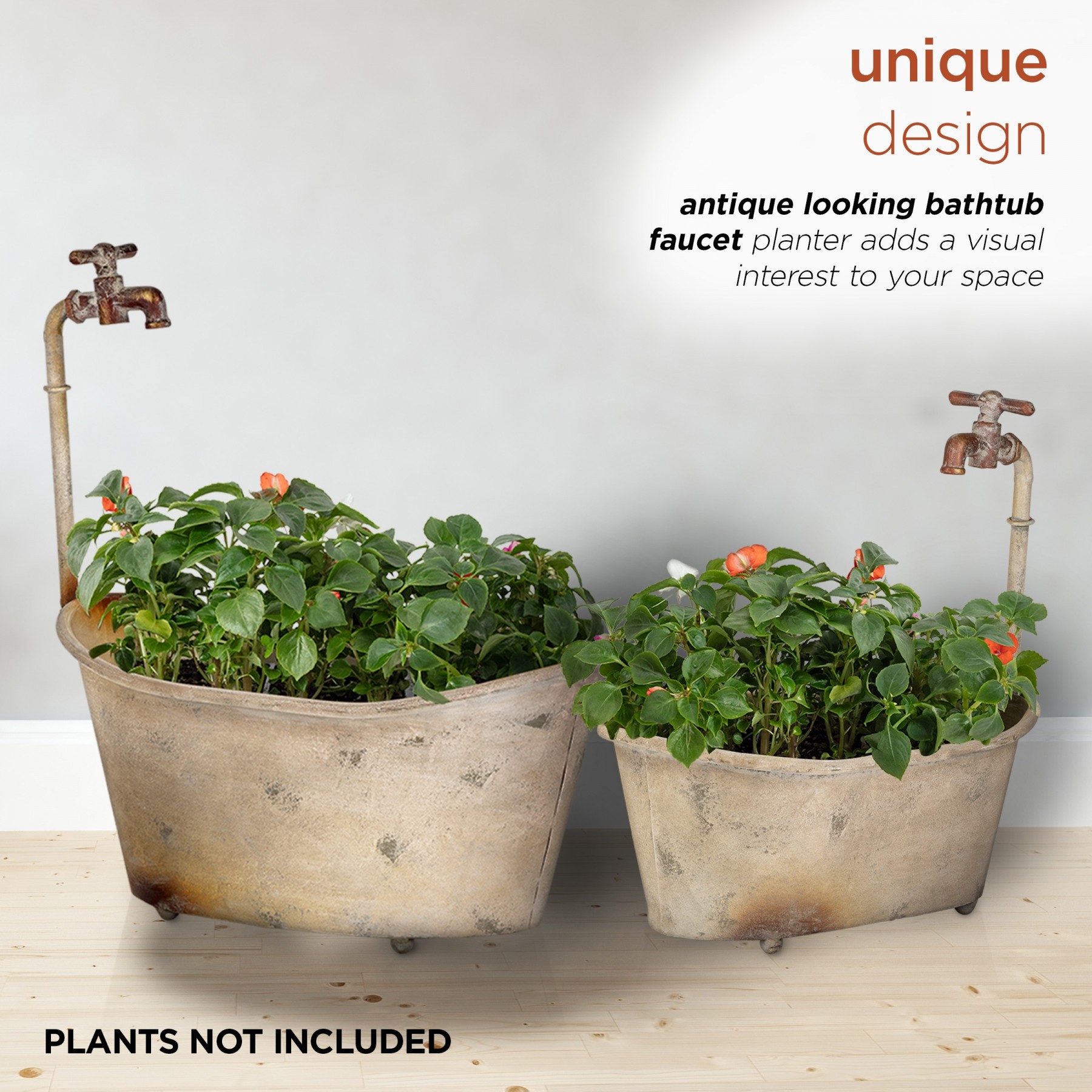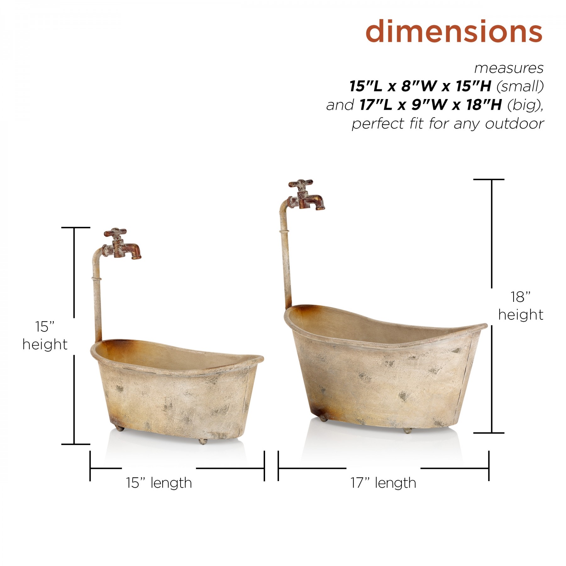 Add a touch of old-fashioned whimsy to your indoor or outdoor living space with the Alpine Corporation Pack of 2 Indoor/Outdoor Rustic Bathtub Planter Yard Decorations! These antique-looking lawn planters feature vintage bathtubs with faucets for a fun addition to your home's outdoor area. Constructed from resilient iron, the yard decorations are weatherproof and rust-resistant for years of quality use on your lawn or porch. With their intricate details, these compact statues can also be used as tabletop décor. Add one or multiple planters to create an enchanted flower display on your deck, outdoor tabletop, or in your home. Wherever you place these Alpine Corporation statues, they're sure to bring whimsical joy to your home! The larger indoor/outdoor lawn planter measures 17"L x 9"W x 18"H while the smaller planter measures 15"L x 8"W x 15"H to fit almost any indoor or outdoor space, and the set includes a one-year manufacturer's warranty from date of purchase.