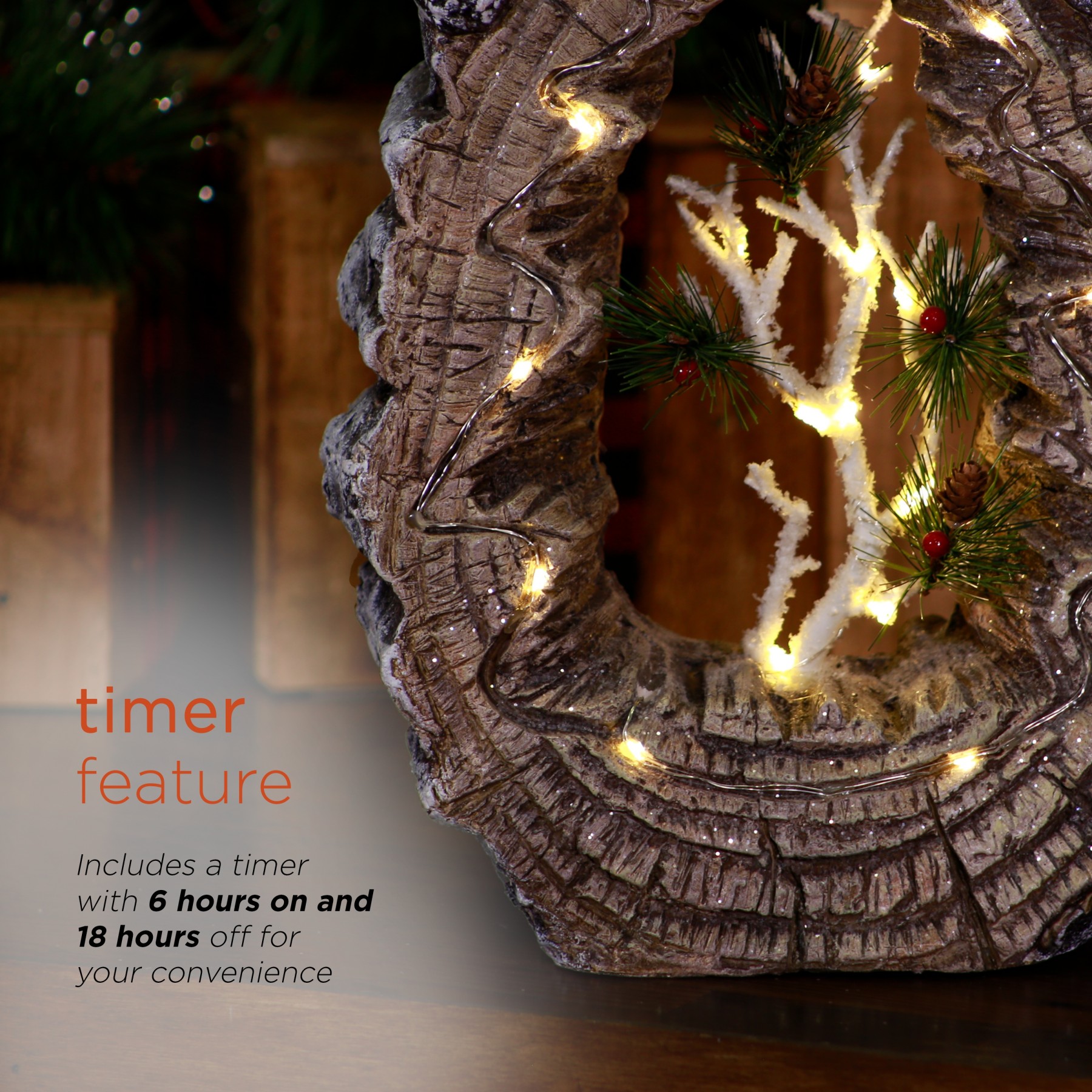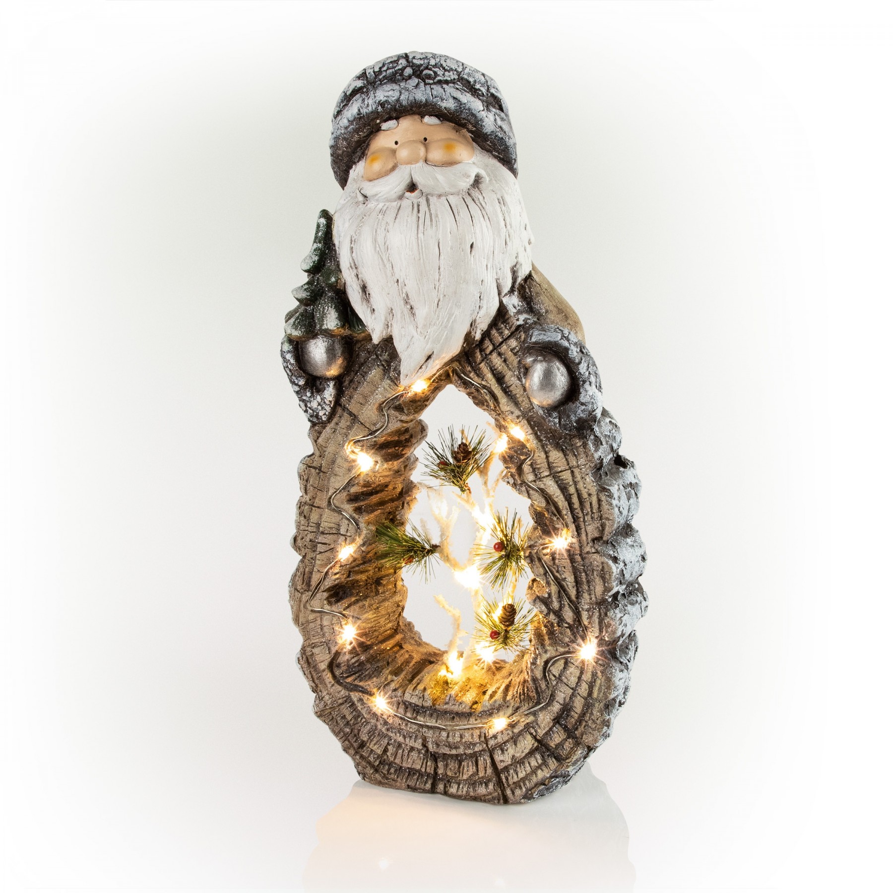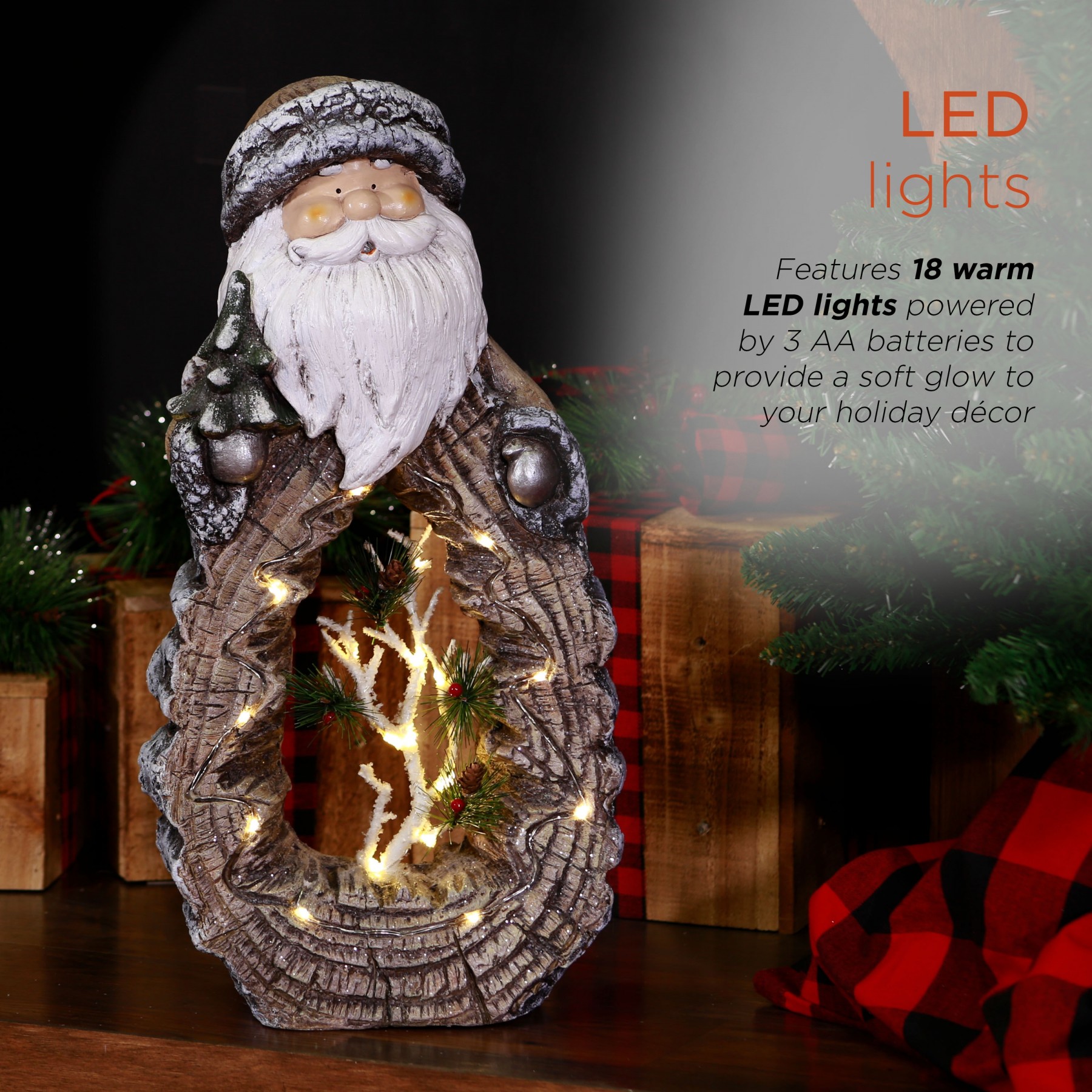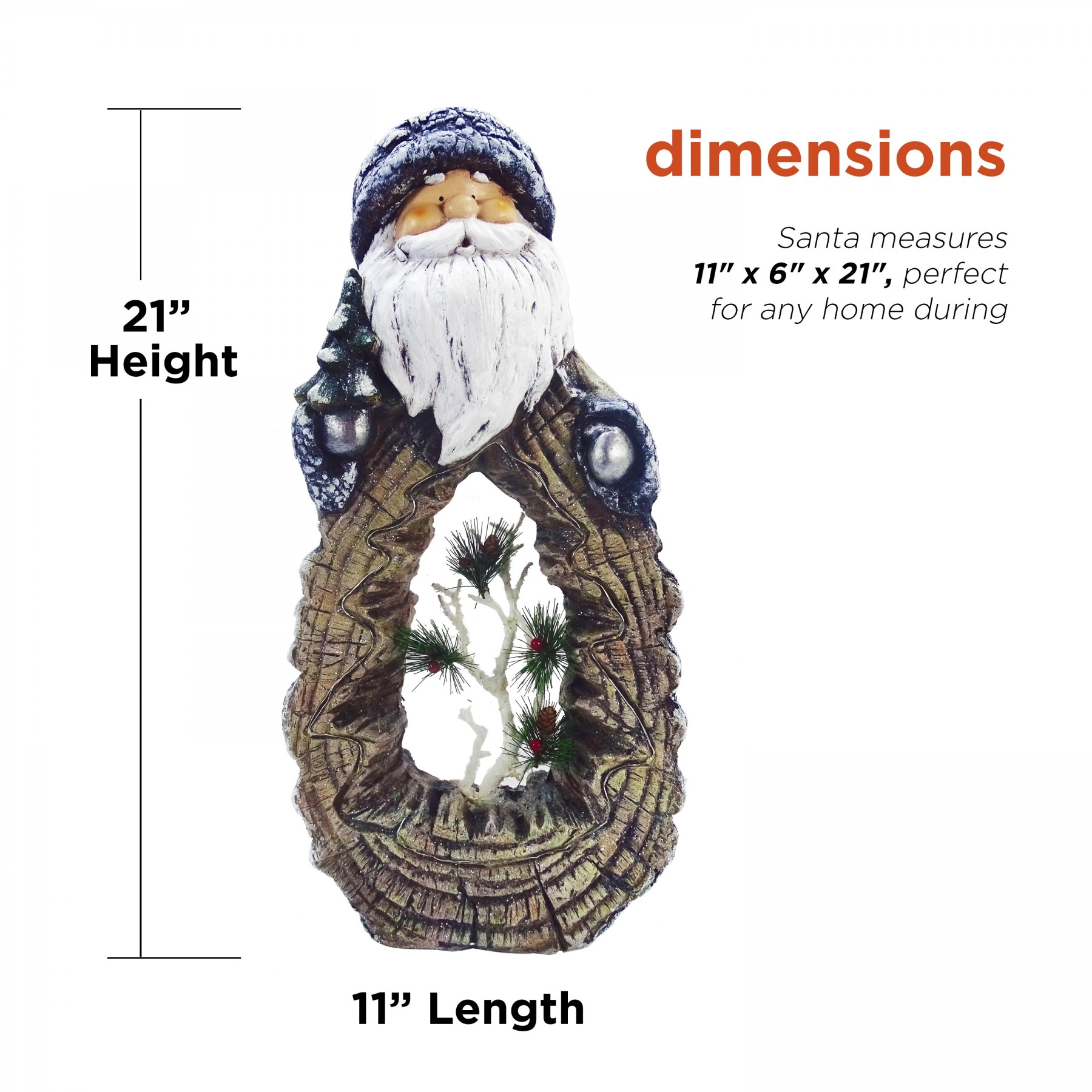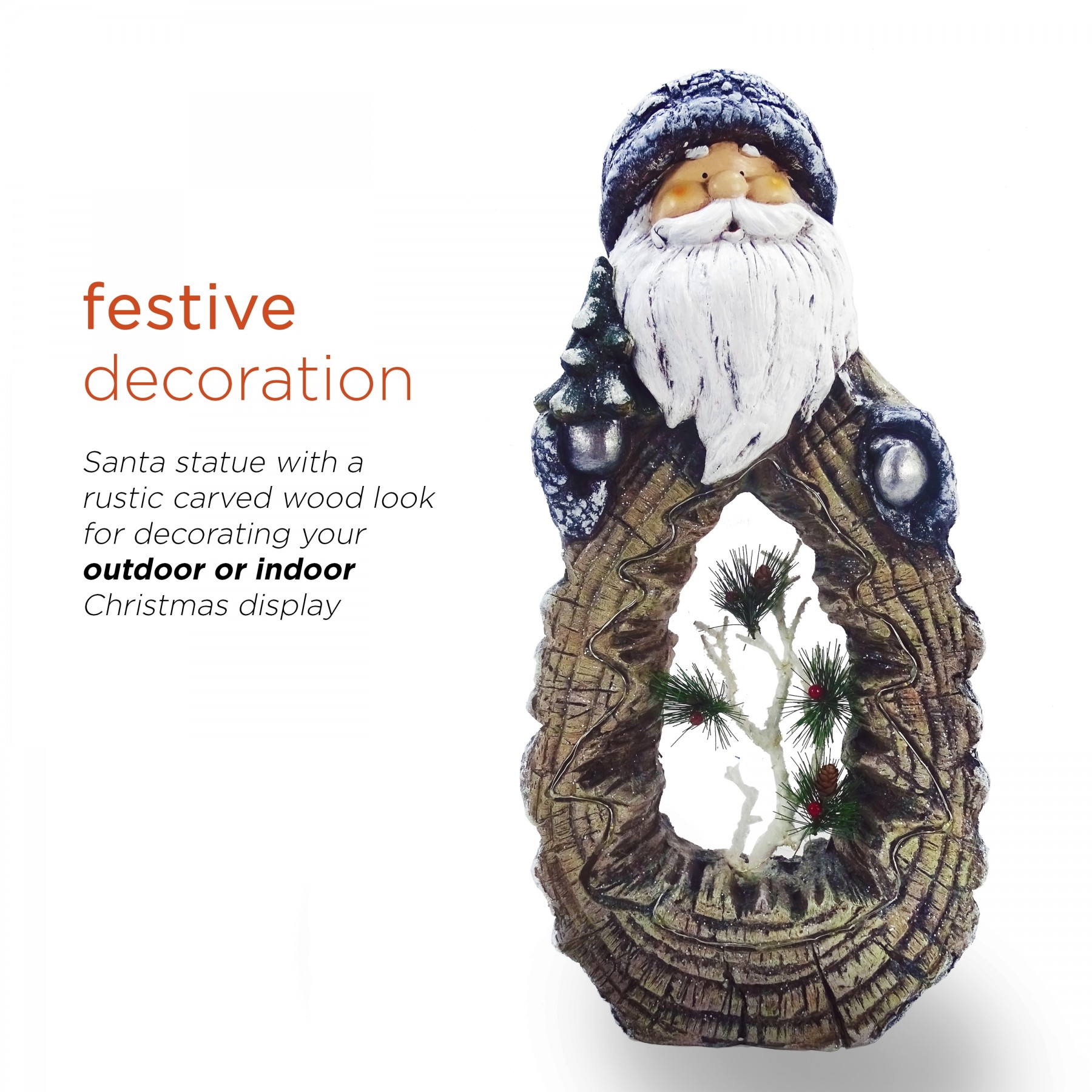 pgrade your holiday display with the Alpine Corporation's Santa Statue with Carved Wood Look and LED lights! This festive display piece features a rustic carved look, perfect for decorating your indoor or outdoor Christmas display. Constructed from durable polystone, the weather-resistant statue is built to provide enjoyment for years to come. The statue also features 16 warm LED lights powered by 2 AA batteries and includes a timer that lasts up to 6 hours on. Measuring 11"L x 6"W x 21"H, the Alpine Corporation Santa Statue is the perfect addition to your holiday decor.
