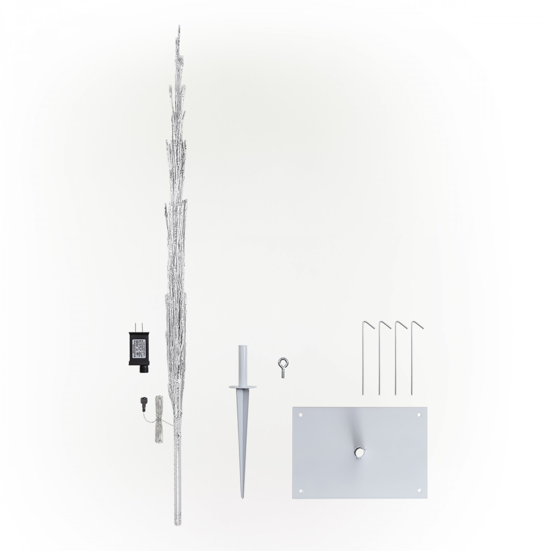 Create a festive atmosphere in your home with the Alpine Corporation's Festive Silver Christmas Tree with Multi-Colored LED Lights! This silver tree is the perfect solution for those who want a real tree for the festive Christmas season but don't want to deal with the cleanup or purchase of a new one every year. It makes a great addition to your indoor or outdoor scenery with its glowing 180 multi-colored LED lights. This tree is easy to set up indoors with its floor base or outdoors with its durable stake that plants it firmly into the ground. Tree conveniently stores flat after use. It meets safety standards with its UL listed plug-in adaptor. The wide tree is perfect for placing gifts under and is sure to be a holiday hit. At 5 ft. tall, the Alpine Corporation Festive Silver Christmas Tree measures 29"L x 29"W x 60"H (68" with base or stake), perfect for adding holiday cheer to your home or yard.