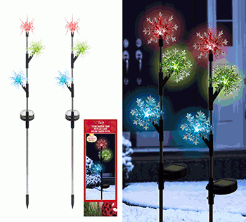 Upgrade your holiday decor with the Alpine Corporation Set of 2 Acrylic 3-Tier Snowflake Stakes with Solar Powered LED Lights. These upscale snowflakes make an excellent addition to your outdoor seasonal display, or as stand-alone statement pieces framing your driveway or pathway. Each of the 2 stakes features 3 stylish snowflakes in pink, green, and blue for a unique addition to classic holiday decor. Each snowflake is individually lit by solar powered cool white LED lights that function 6-8 hours on full charge. Leave them out in the sun, let them soak up solar energy, and be rewarded with a bright light show at night! Made from sturdy metal and acrylic, these stakes will last for many winter seasons to come. Each stake measures at 6" x 3" x 32" for easy set-up and storage. Includes a one-year manufacturer's warranty from date of purchase.