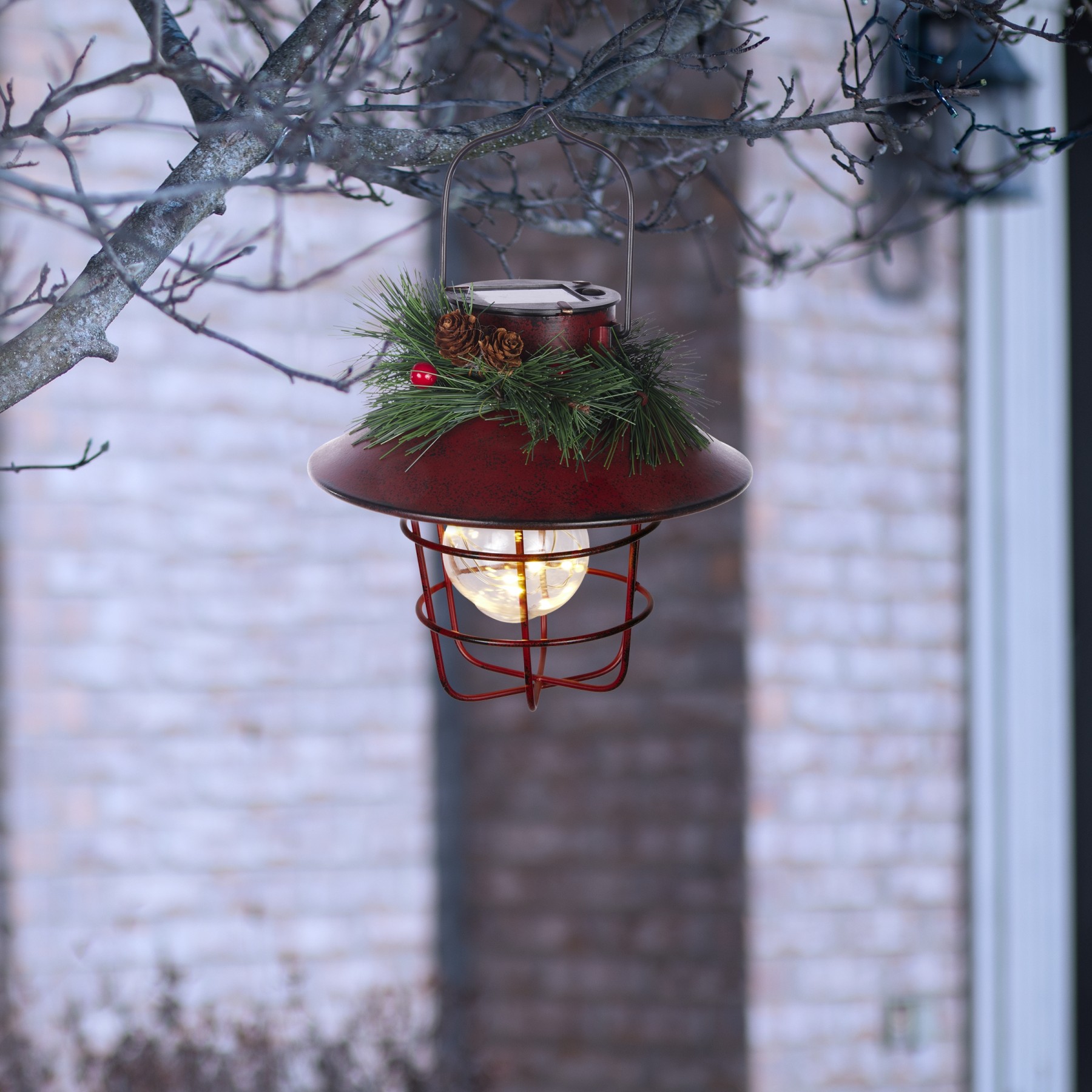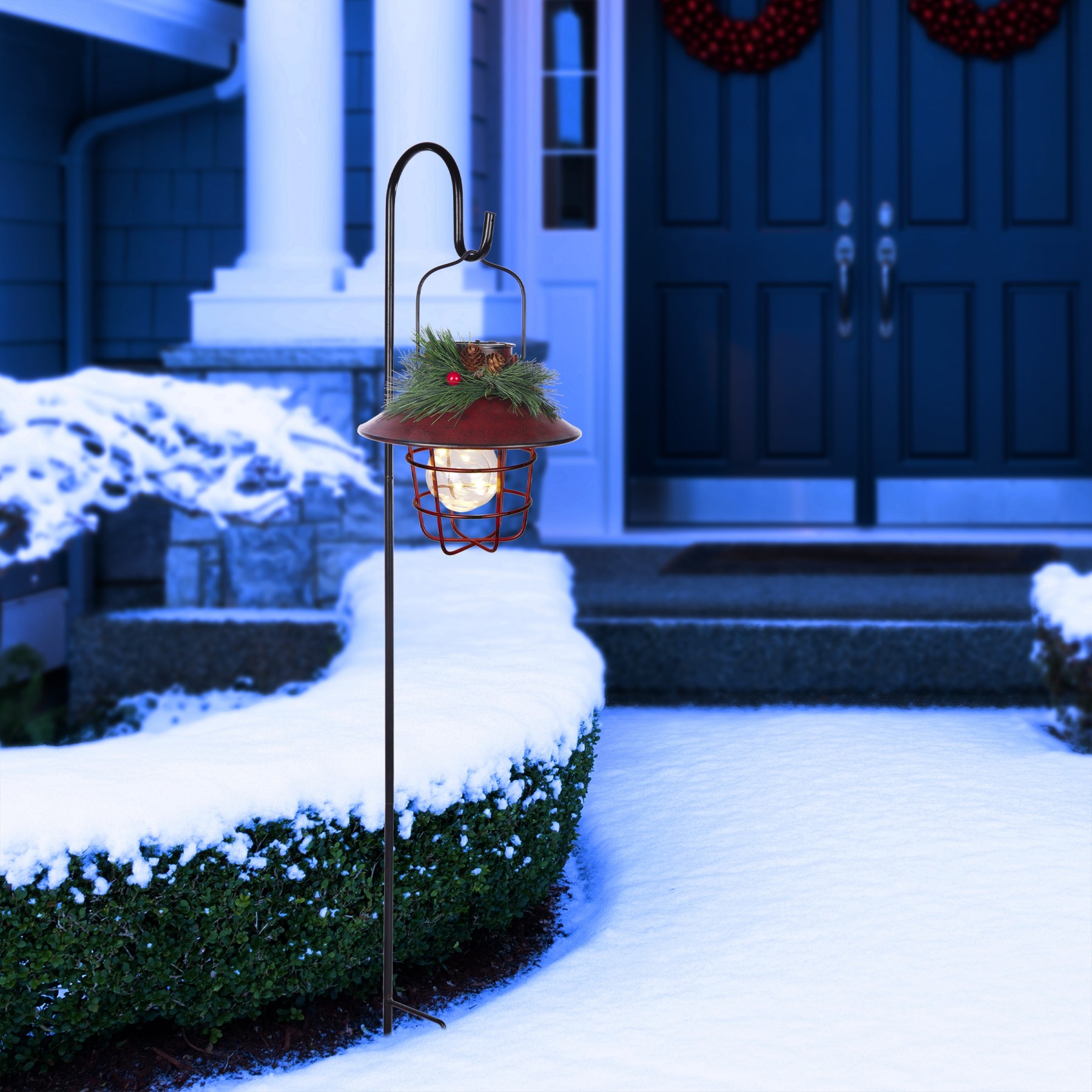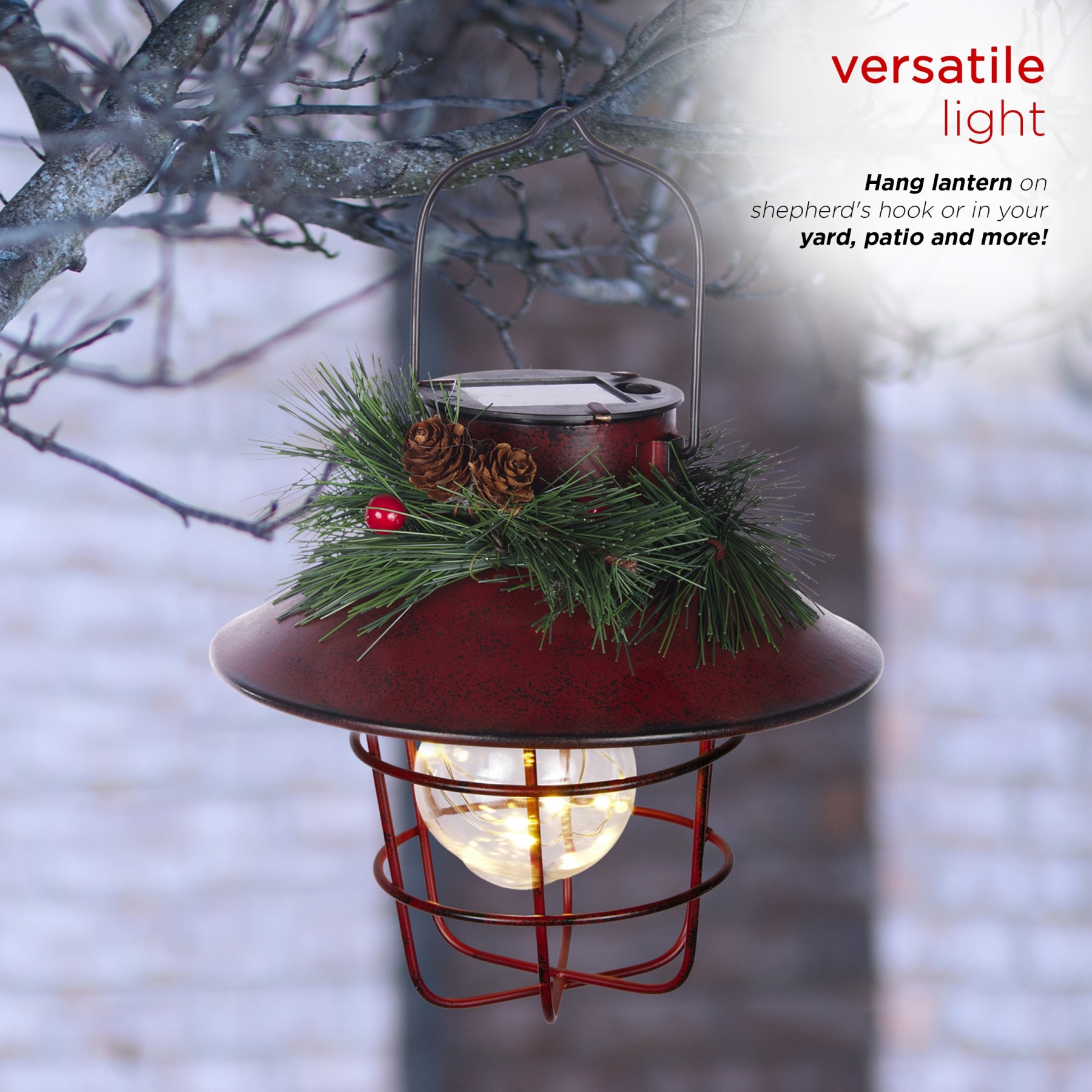 For a timeless, vintage approach to your holiday decor, light up the cold winter night with the Alpine Corporation Metal Lantern with included Shepherd's Hook and Solar Powered LED Lights! This dashing red, vintage style lantern comes wrapped with winter greenery, to spread holiday cheer wherever it's placed. This lovely lantern includes 9 warm white LED lights that work up to 8 hours on a full charge, complete with an on and off switch. Allow the lantern time to soak up the sun, and then be rewarded with a comforting warm light in the evening. With the included shepherd's hook, you have boundless options for where to display your lantern- in your front lawn, accenting your driveway, or even hung in your patio. Durably made so you can enjoy for many holiday seasons in the future, this lantern measures 9" x 7" x 36" with the hook, and includes a one-year manufacturer's warranty from date of purchase.