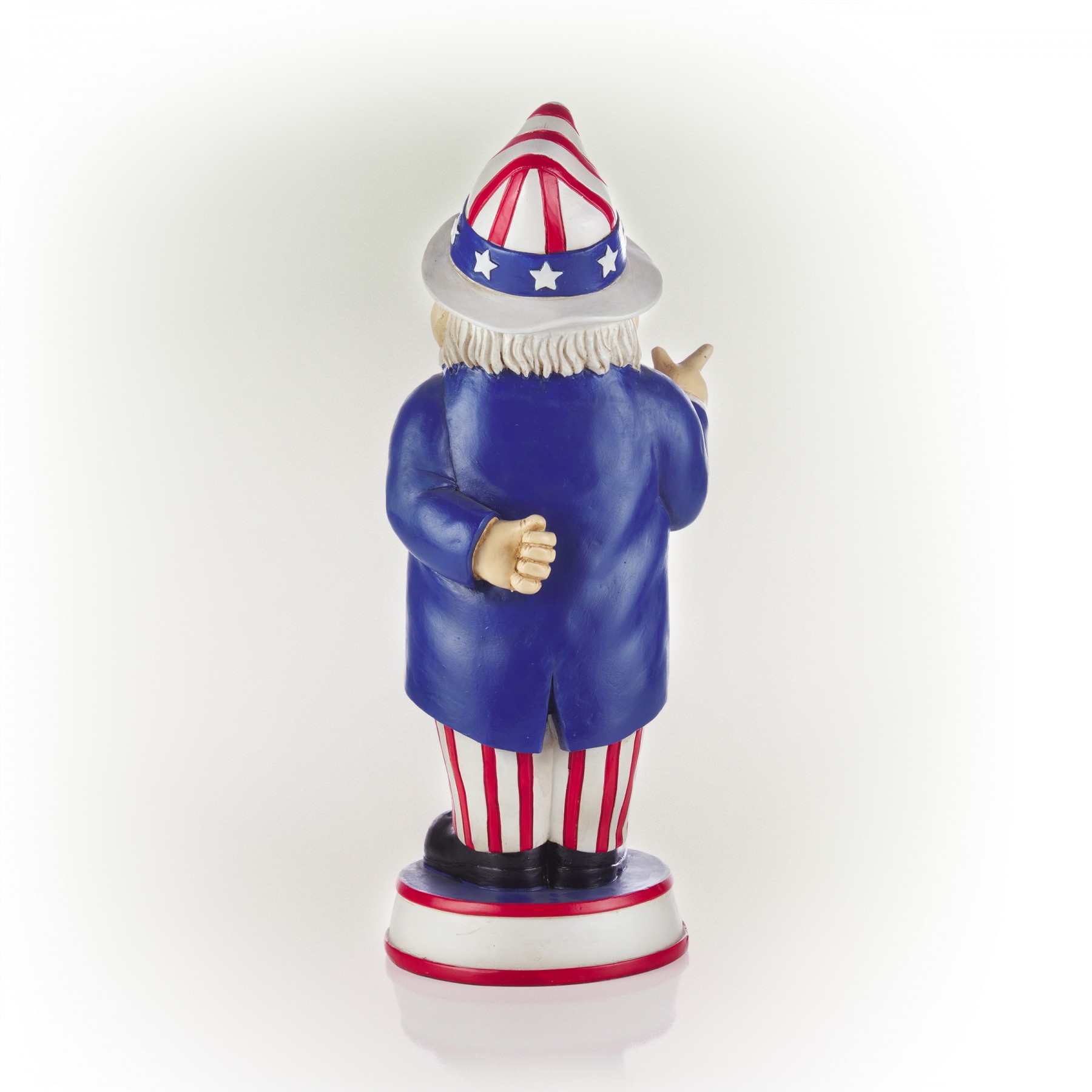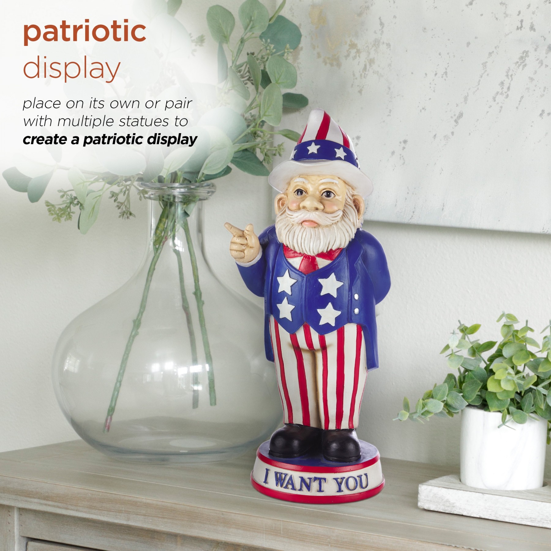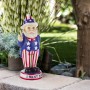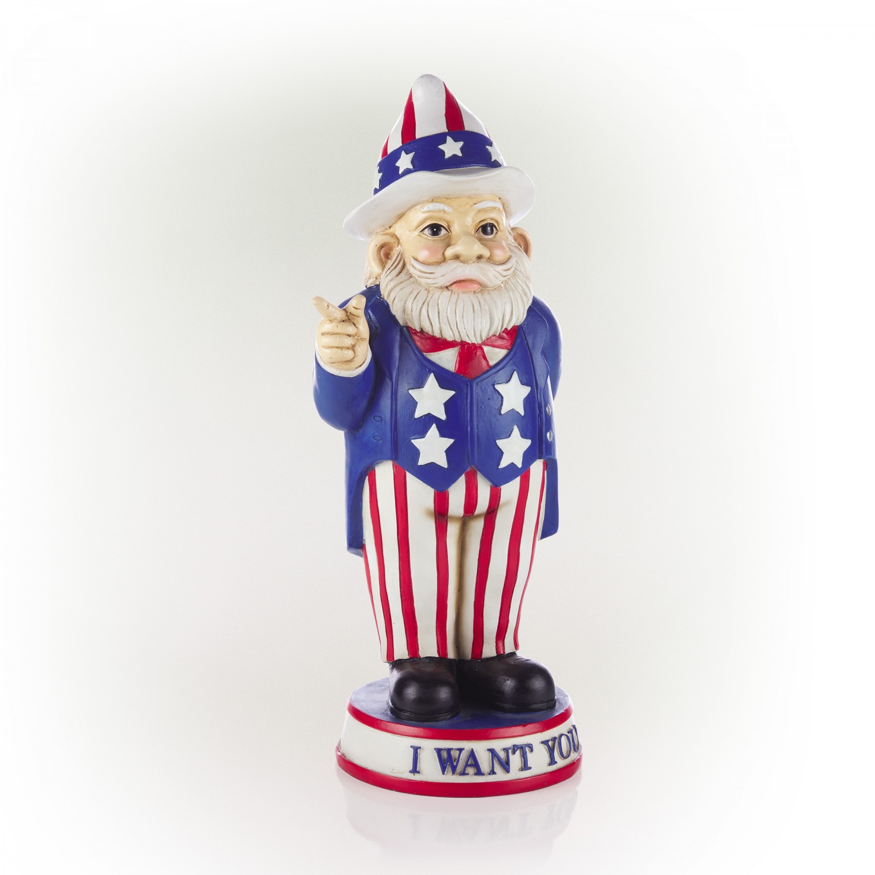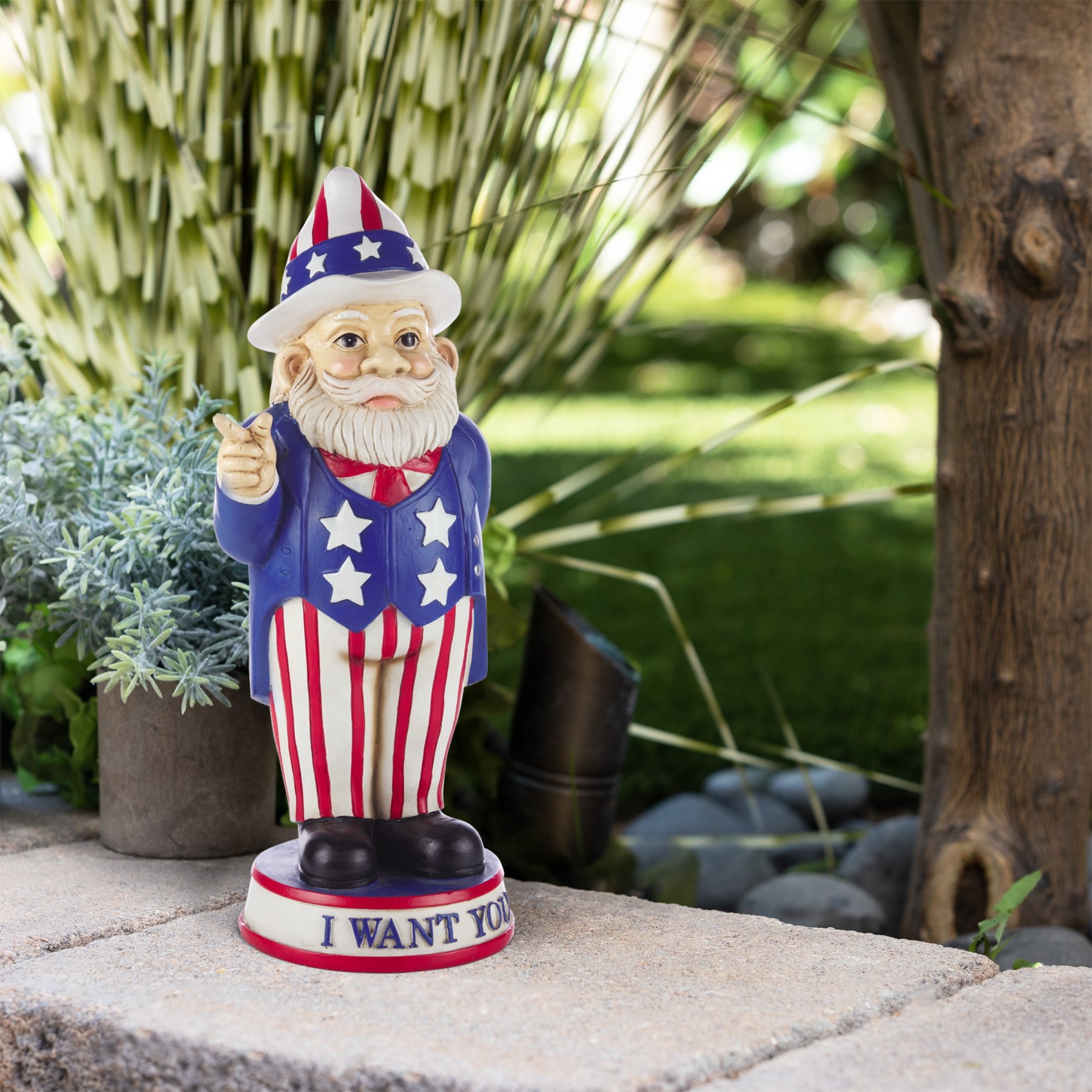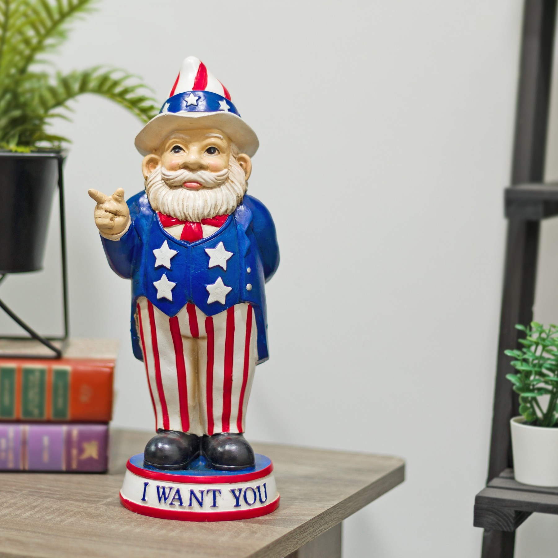 Legend has it that garden gnomes will provide you with mythical powers to keep your garden lush and green, while keeping you safe from evil spirits. With the Alpine Corporation Uncle Sam "I Want You" Garden Gnome Decoration, you can add a whimsical and Americana-inspired accent to your front lawn, porch, patio, or backyard. This lawn figurine features an Uncle Sam garden gnome holding an American flag and wearing a starred-and-striped outfit while standing on a pedestal that reads "I Want You" to offer a patriotic and inspirational welcome to your guests. The colorful details make this gnome a focal point wherever it is displayed. This outdoor statue can be placed on its own or paired with multiple statues to create a patriotic display. It can also be used as a decorative accent in your flowerbeds, as a table centerpiece, or as part of your home's interior decor. Made from durable polyresin with a colorful painted finish, this lawn gnome is weatherproof and rust-resistant for years of quality use. This friendly garden gnome measures 6"L x 4"W x 12"H to make a statement in your yard, and it includes a one year manufacturer's warranty from date of purchase.